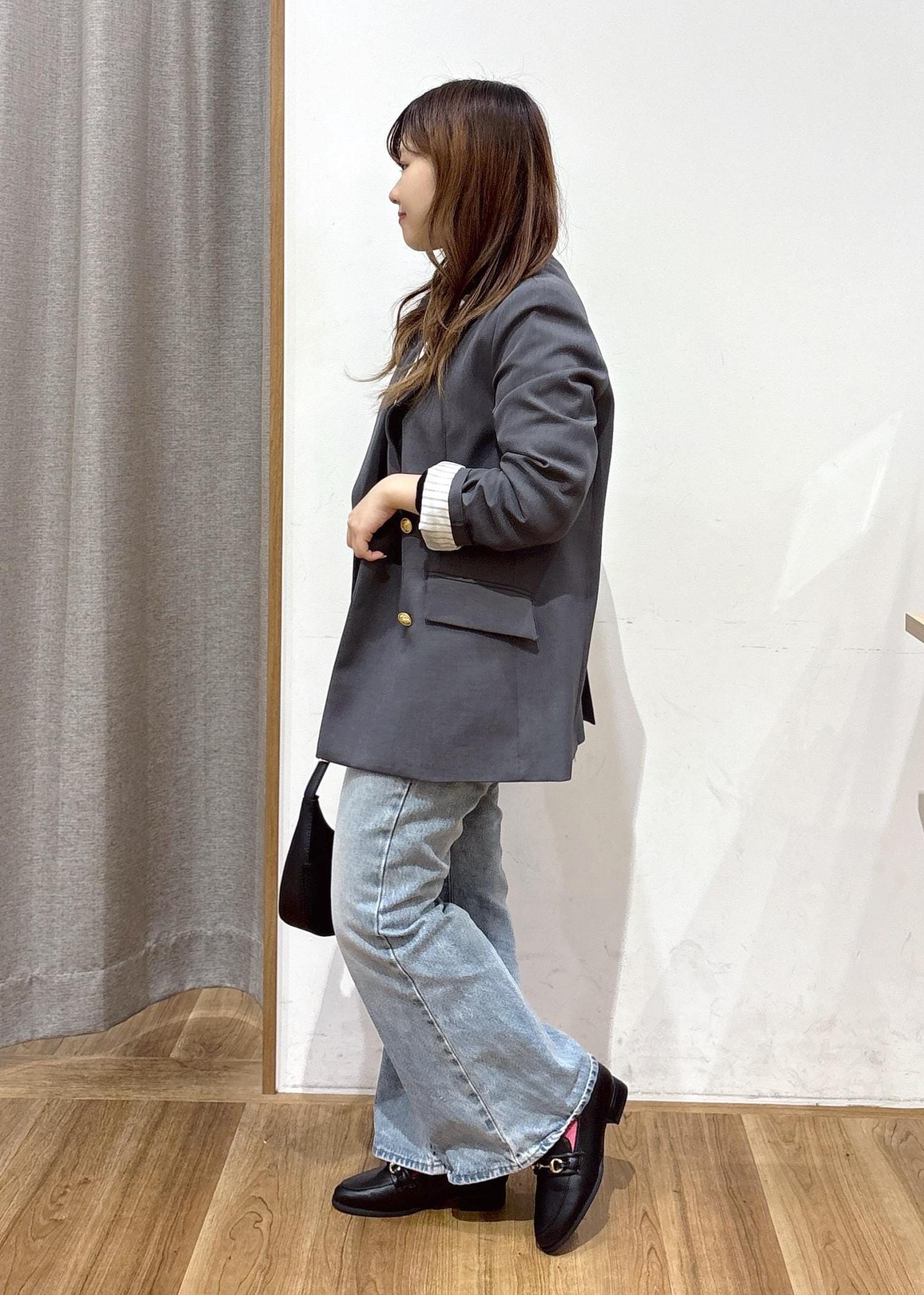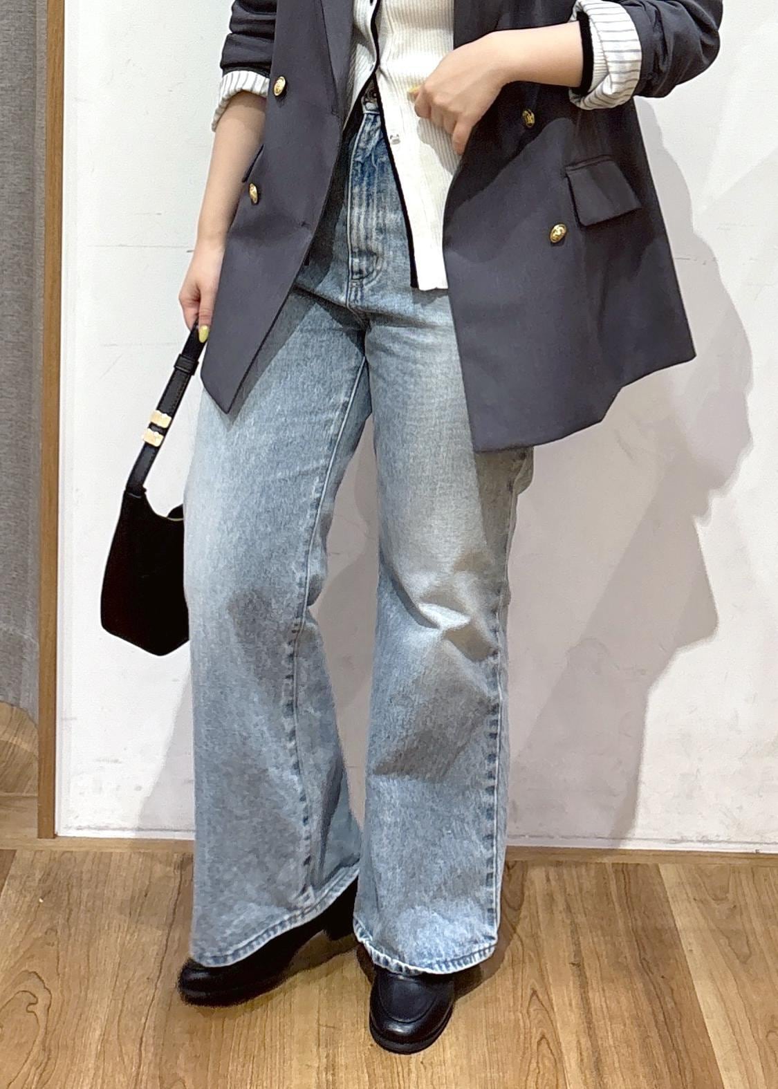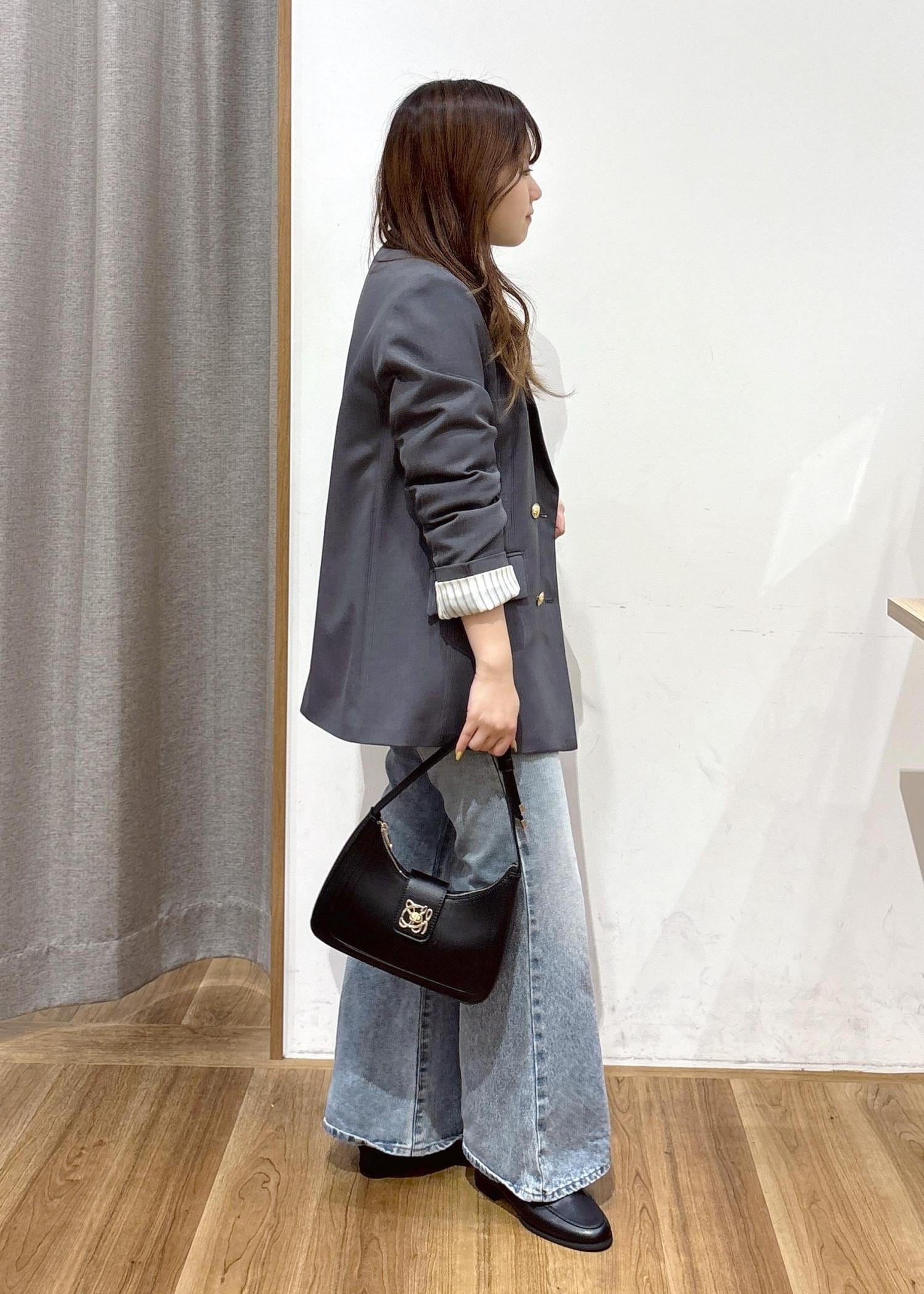 さっと羽織るだけで華やかになる金ボタンが特徴のジャケットに、細見え抜群のフレアデニムを合わせたコーディネートです。