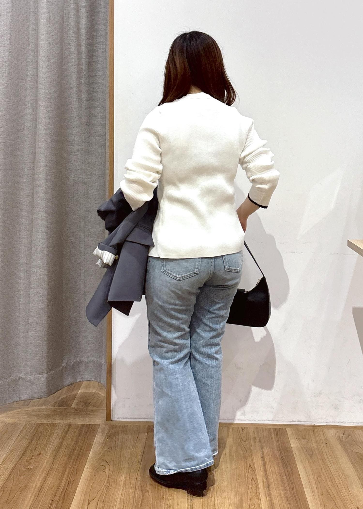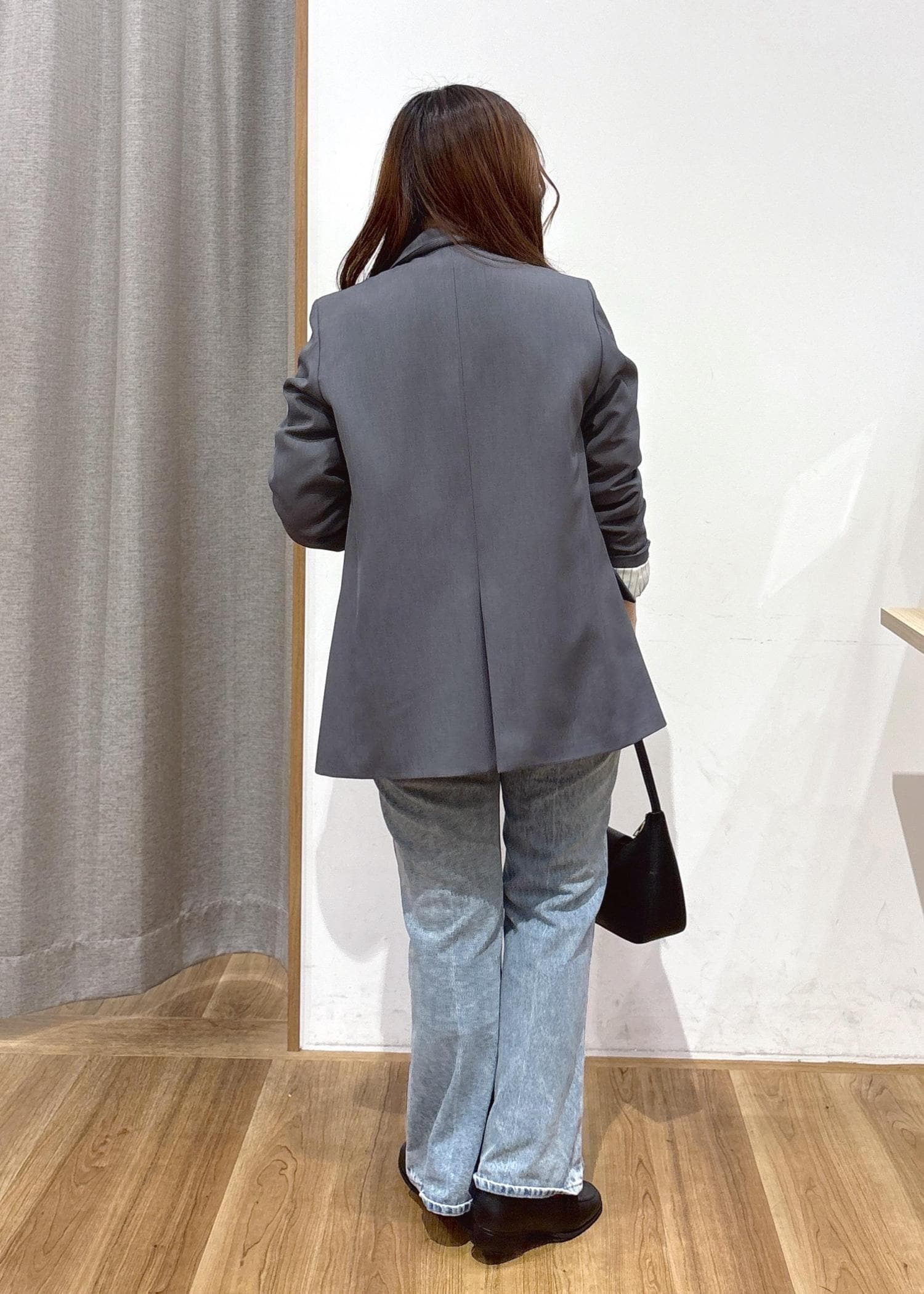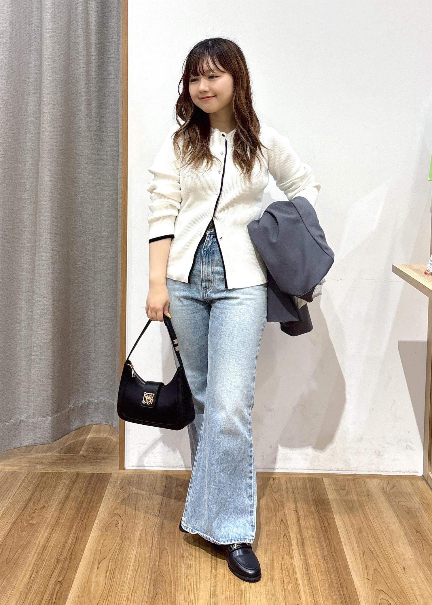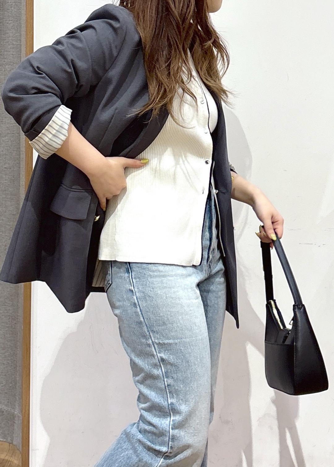 さっと羽織るだけで華やかになる金ボタンが特徴のジャケットに、細見え抜群のフレアデニムを合わせたコーディネートです。