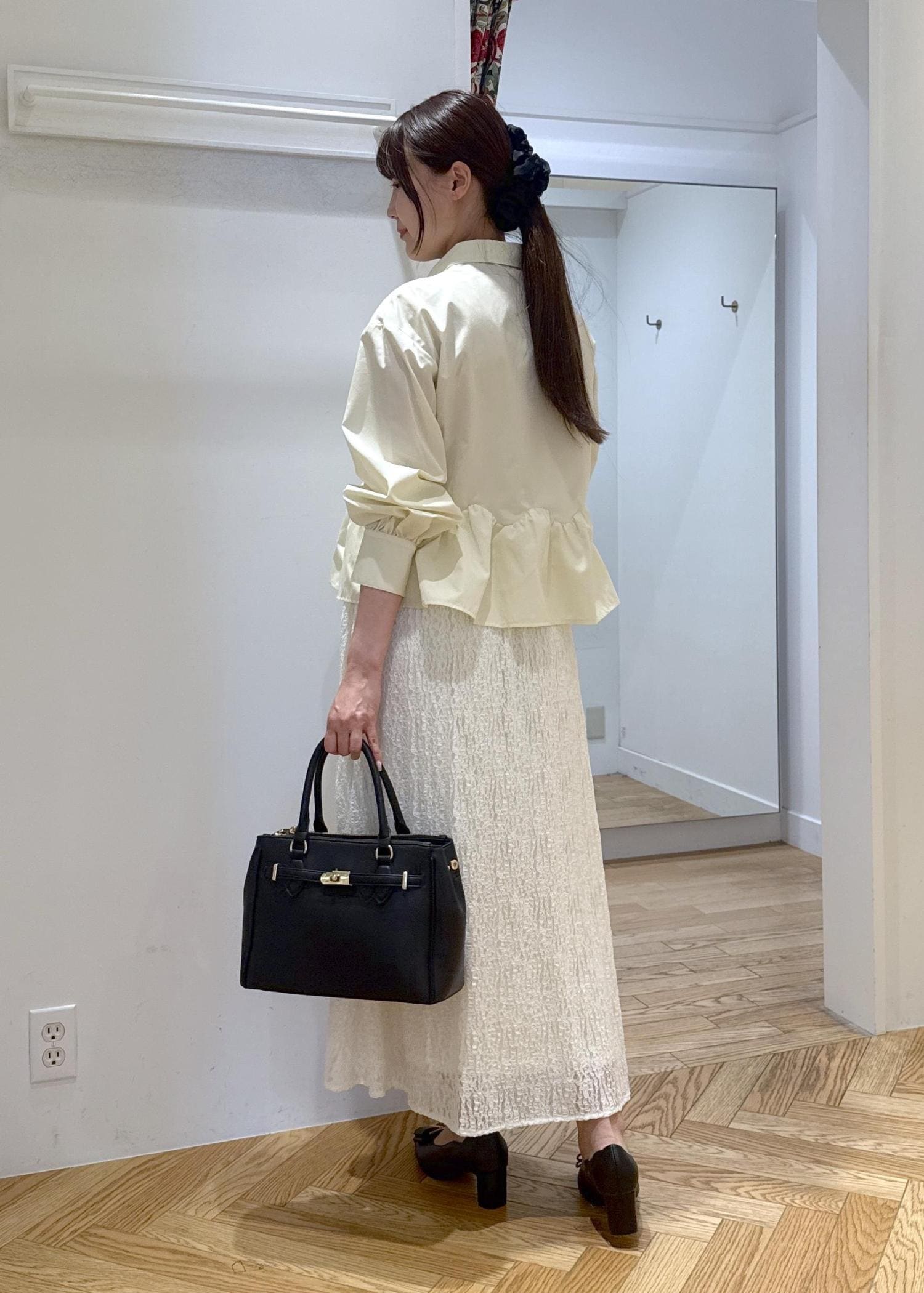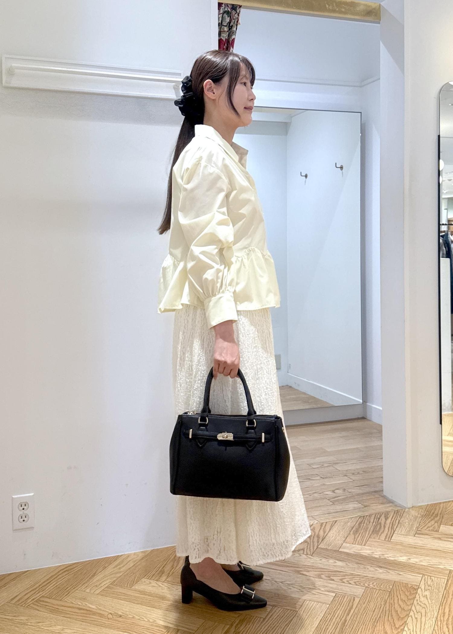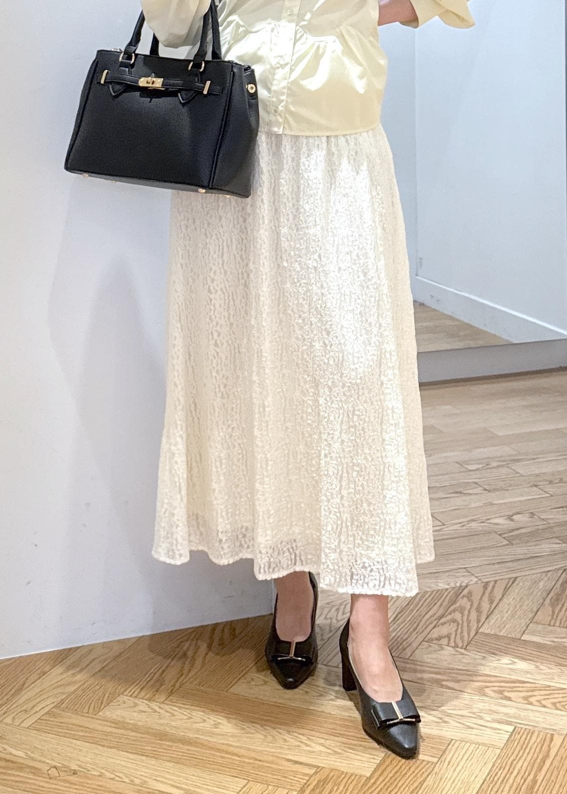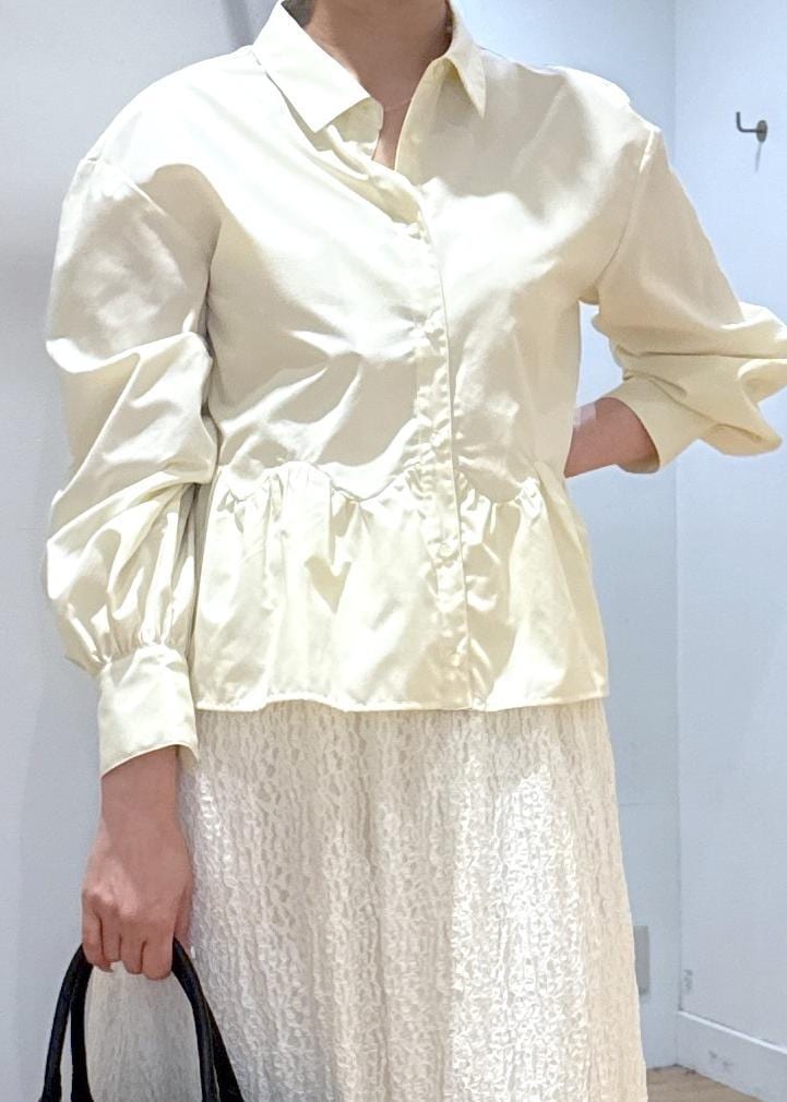 春らしいイエローカラーのウェーブペプラムシャツに華やかなレーススカートを合わせて大人カジュアルコーデです。