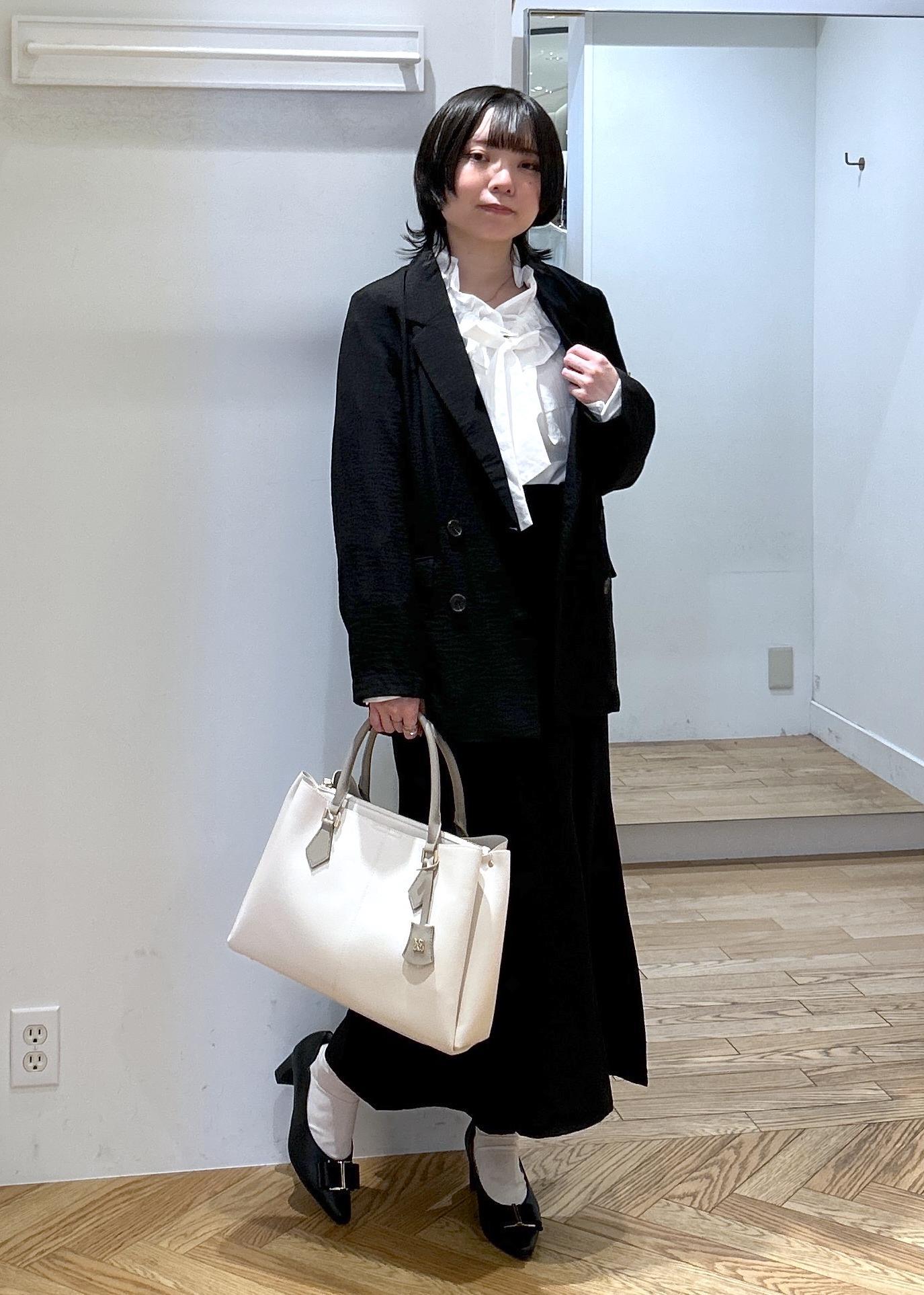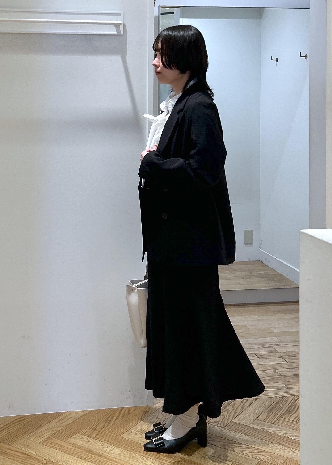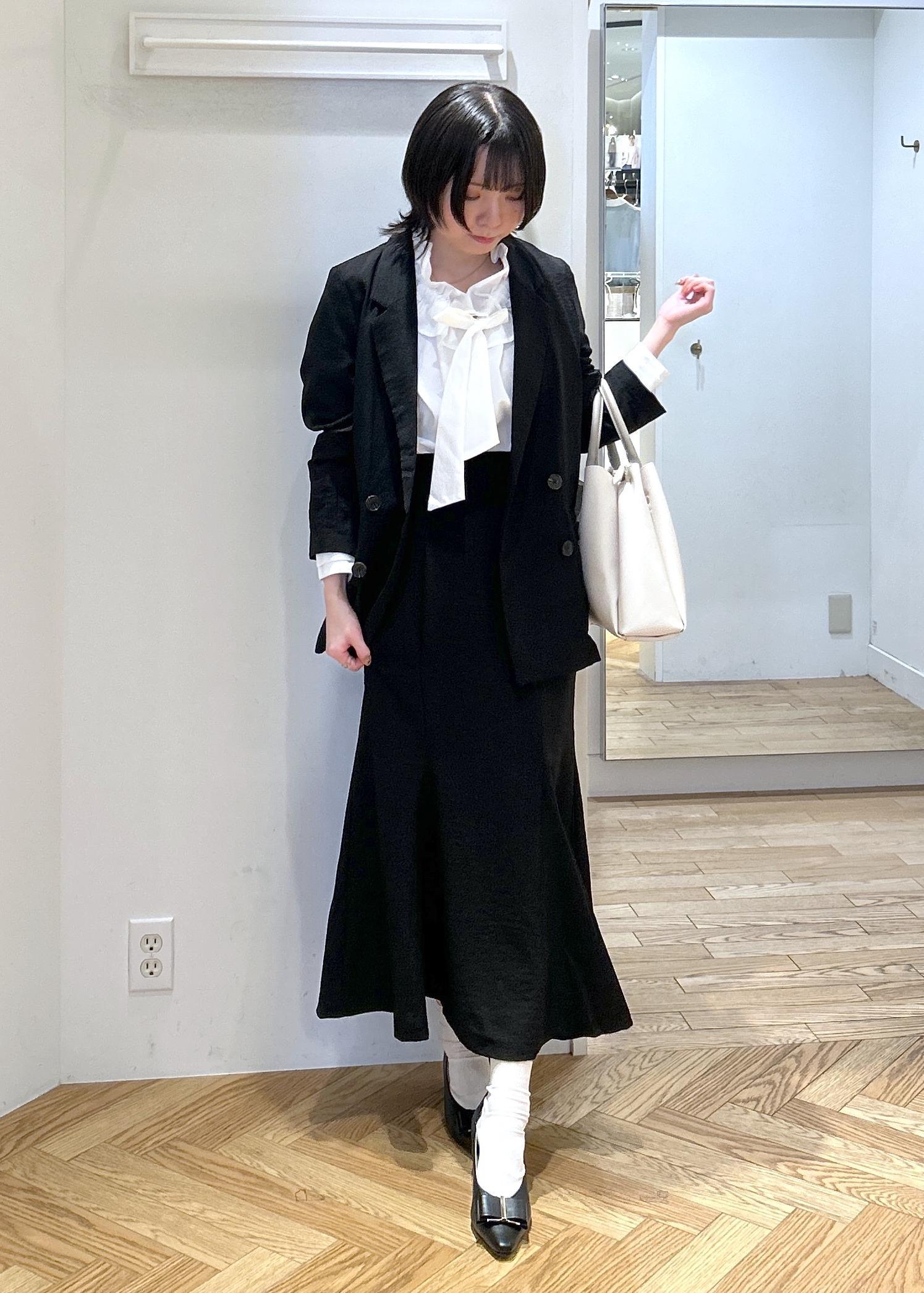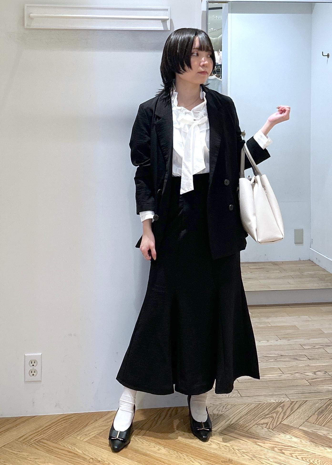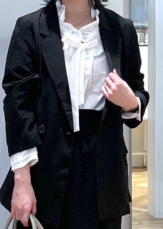 ブラックのジャケット+スカートのセットアップに、白いフリルブラウスで甘さをプラス♡