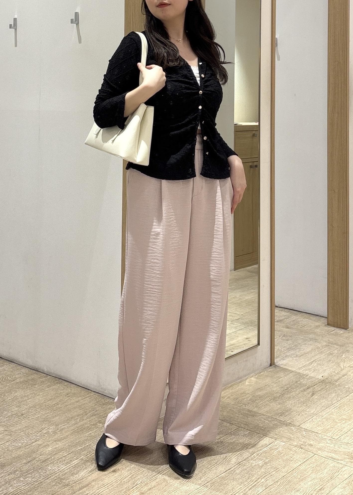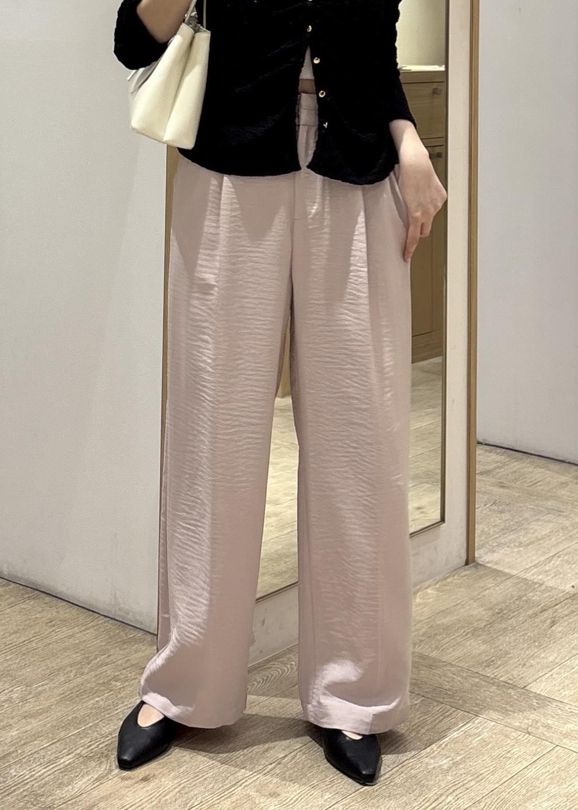 パンツは軽やかなリネンライク素材で、シワになりにくくイージーケアなのも嬉しいポイント。きちんと感がありつつも、ストレスフリーな履き心地です。