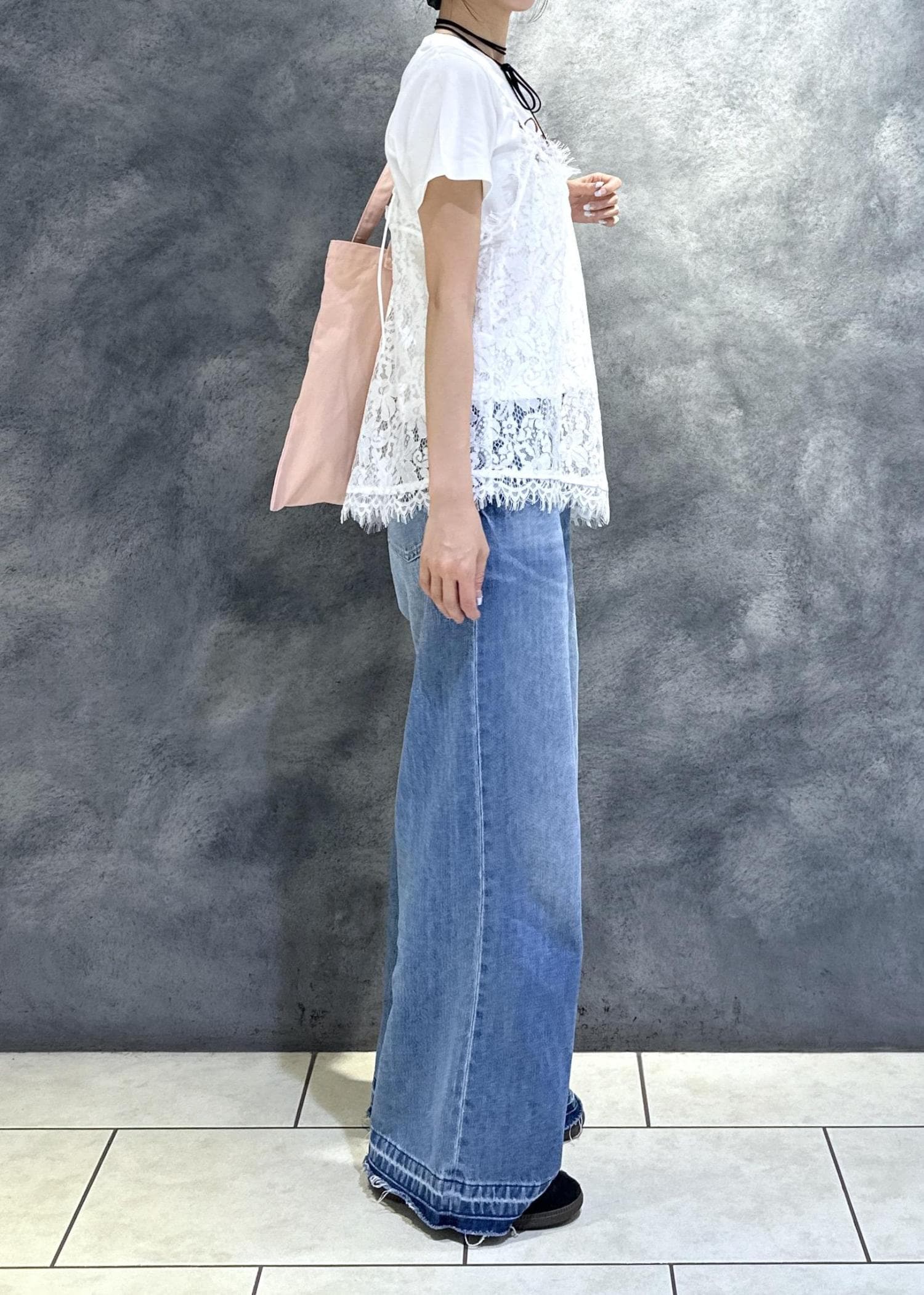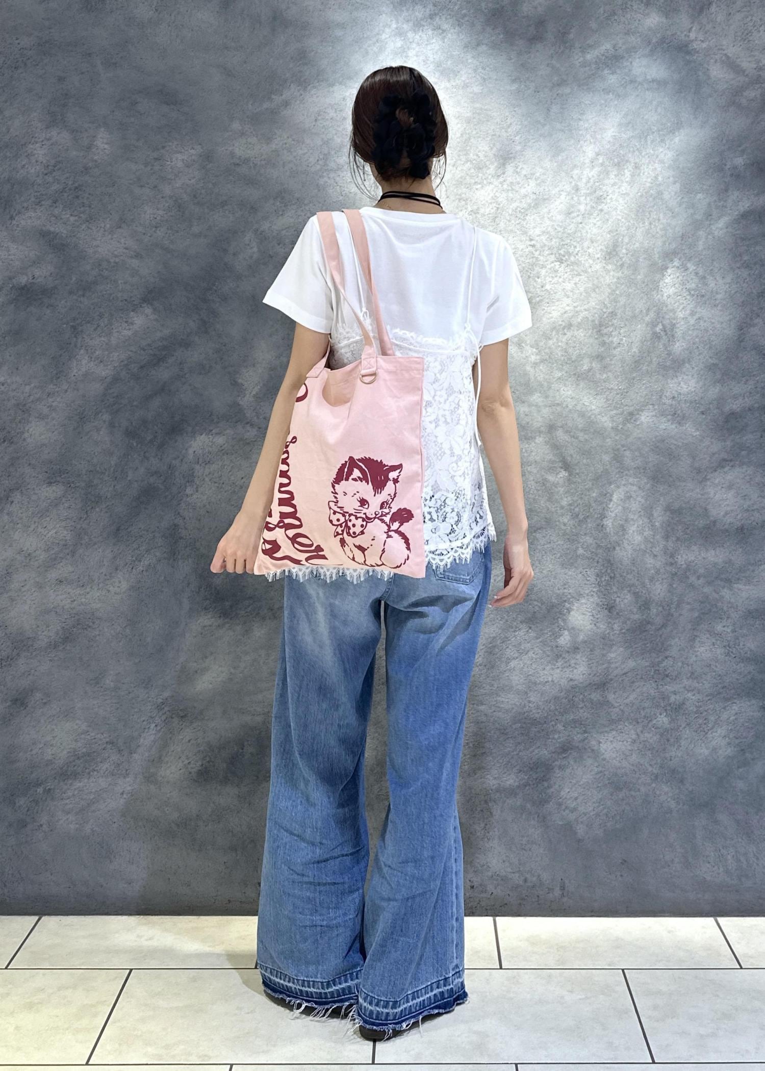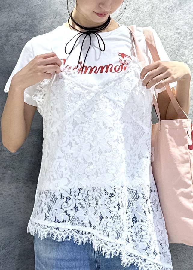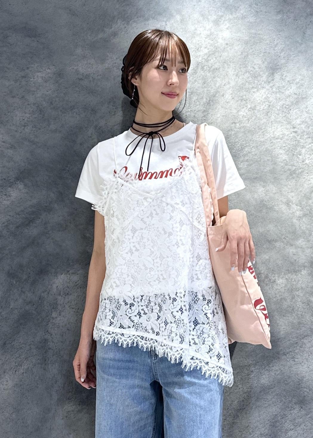SWIMMERコラボのTシャツにレースキャミを重ねた、