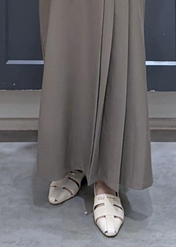柔らかく落ち感のある素材なので、アシンメトリーのプリーツも広がりすぎずすっきりしたシルエットに。