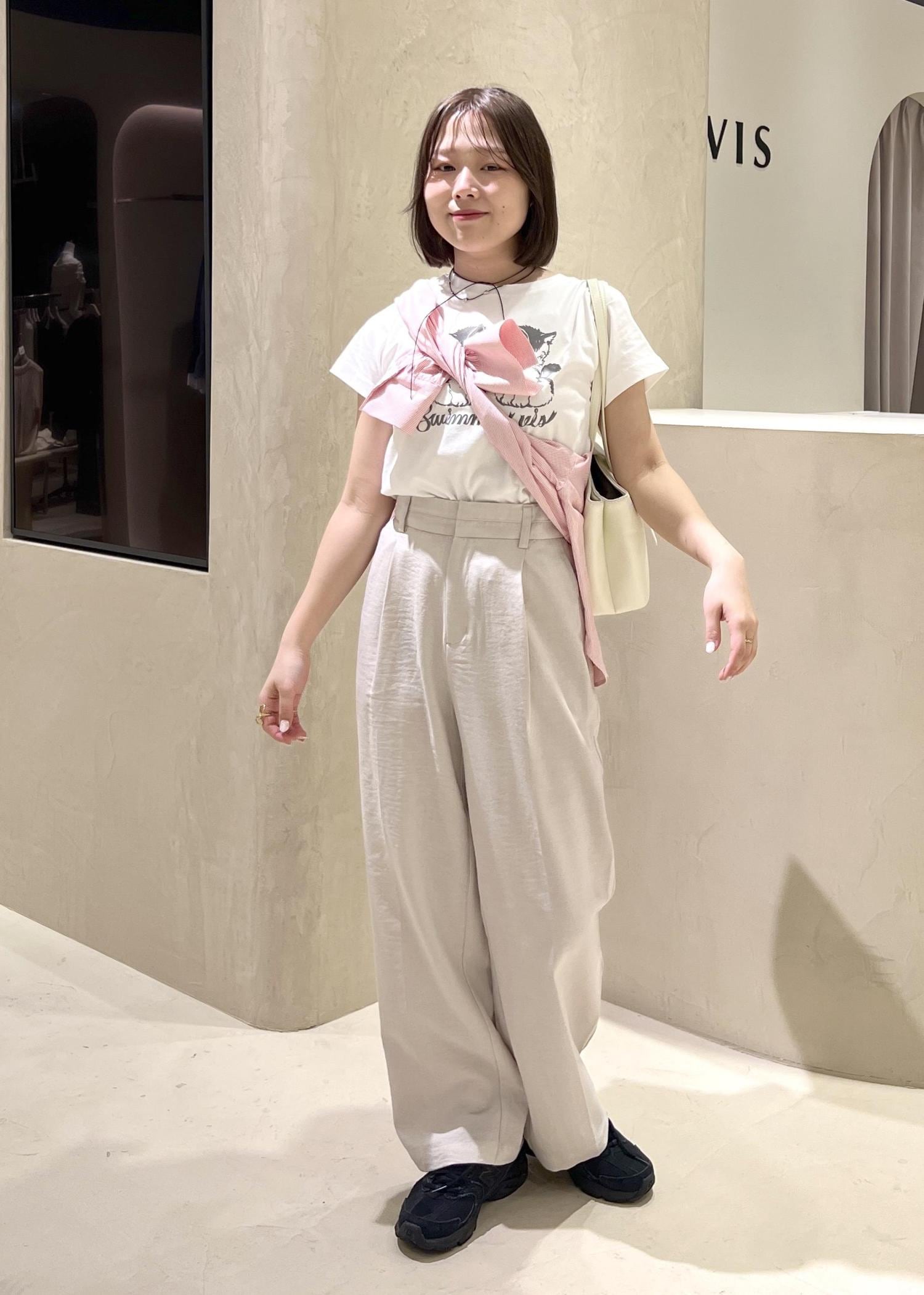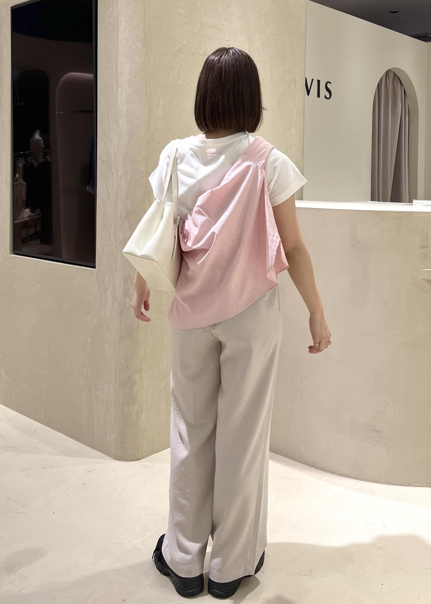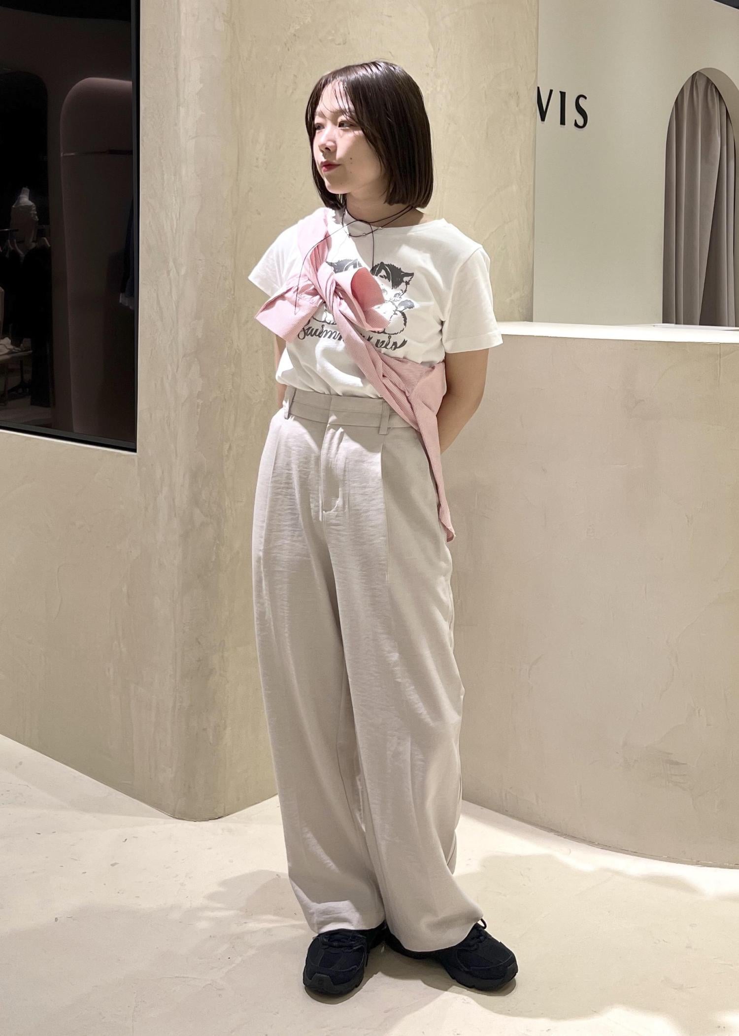 SWIMMER×VISのアイテムを使った、フェミニンカジュアルコーデです。可愛らしさのあるデザインのTシャツをワントーンでまとめ、シャツを巻くことで色味をプラスし、明るい季節にあわせました。