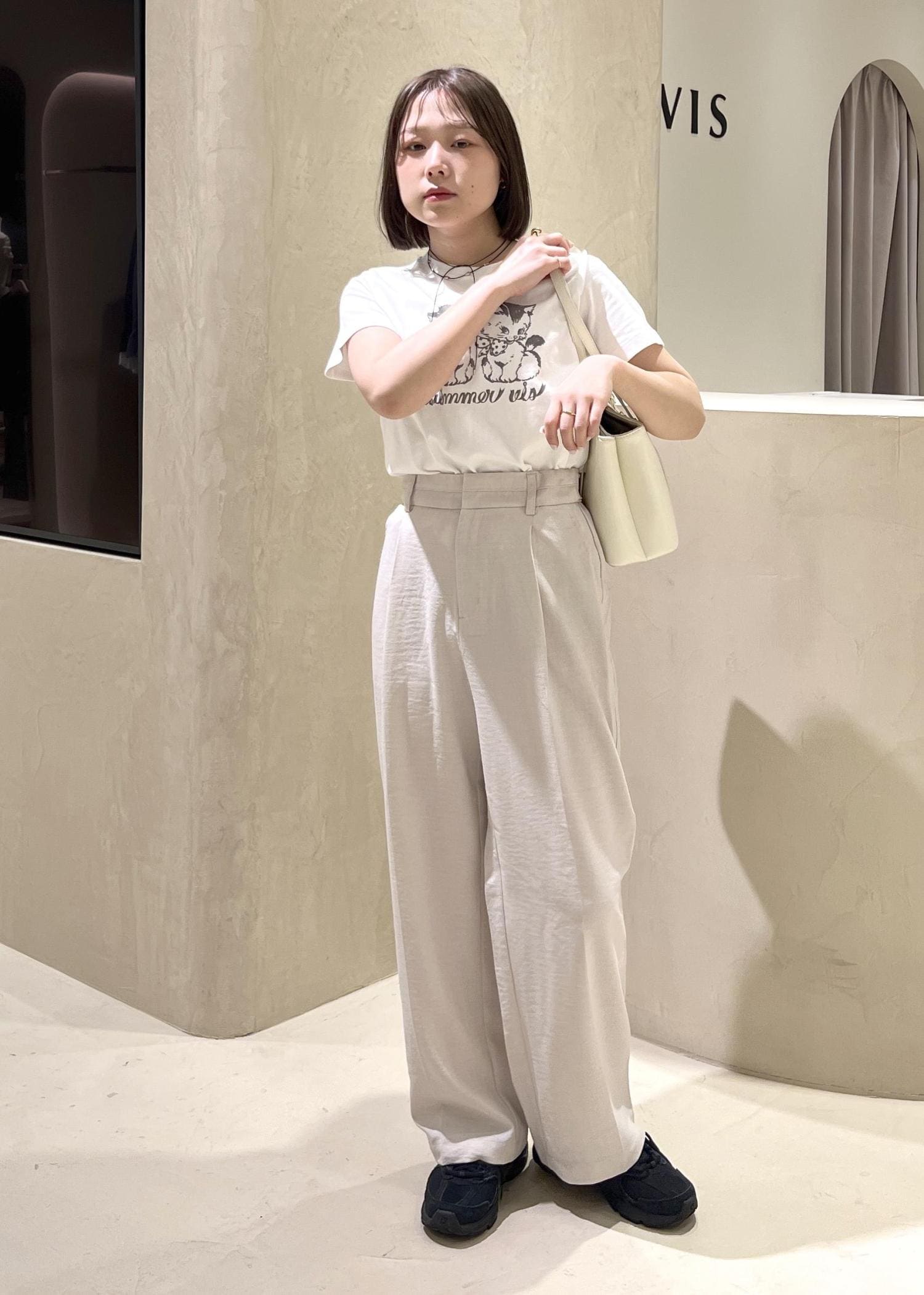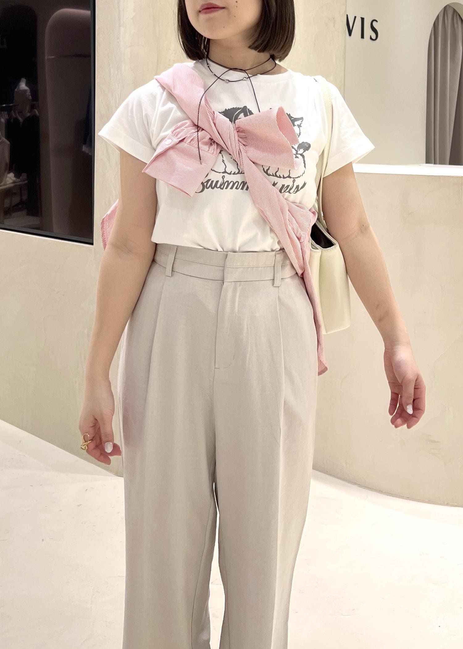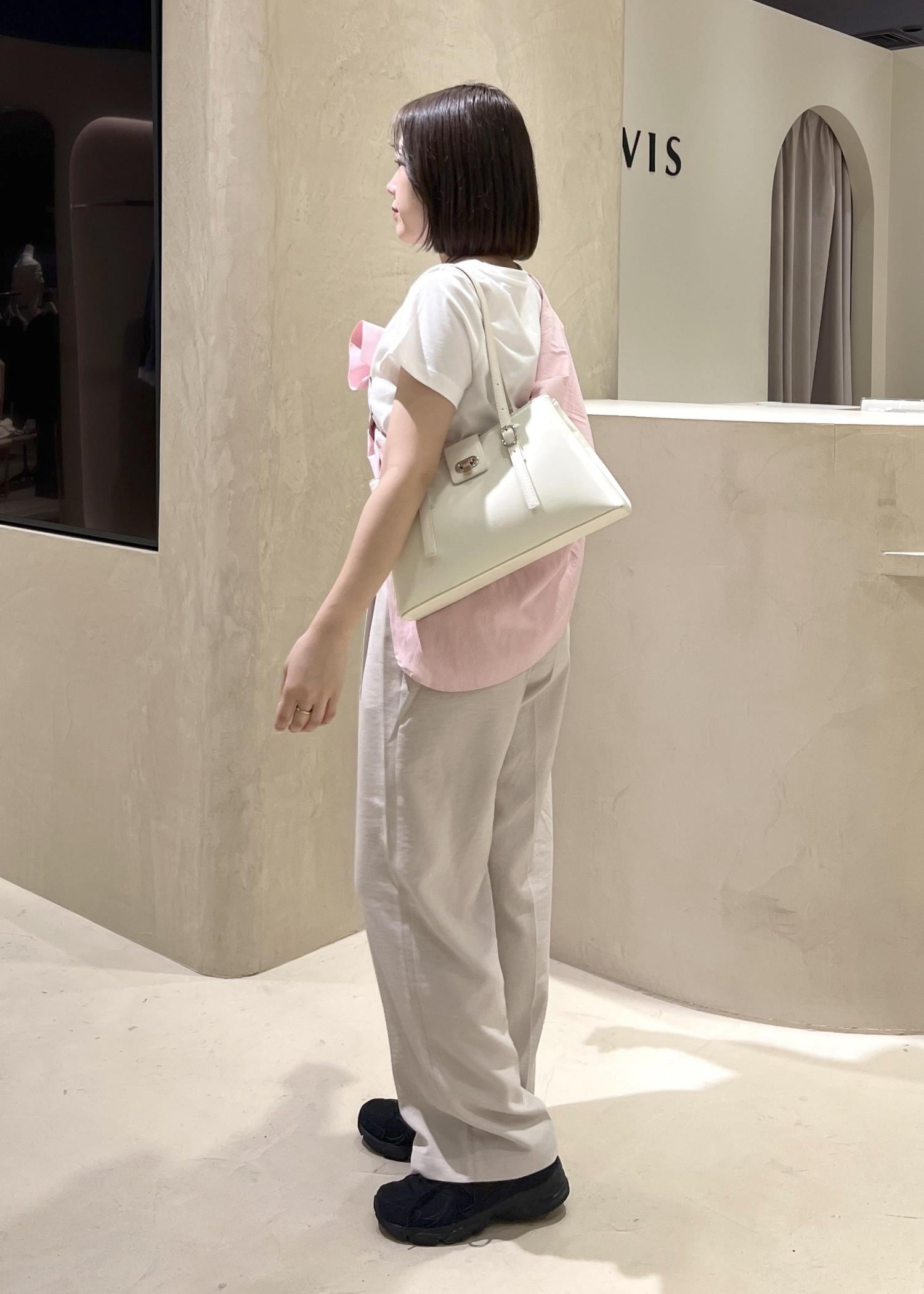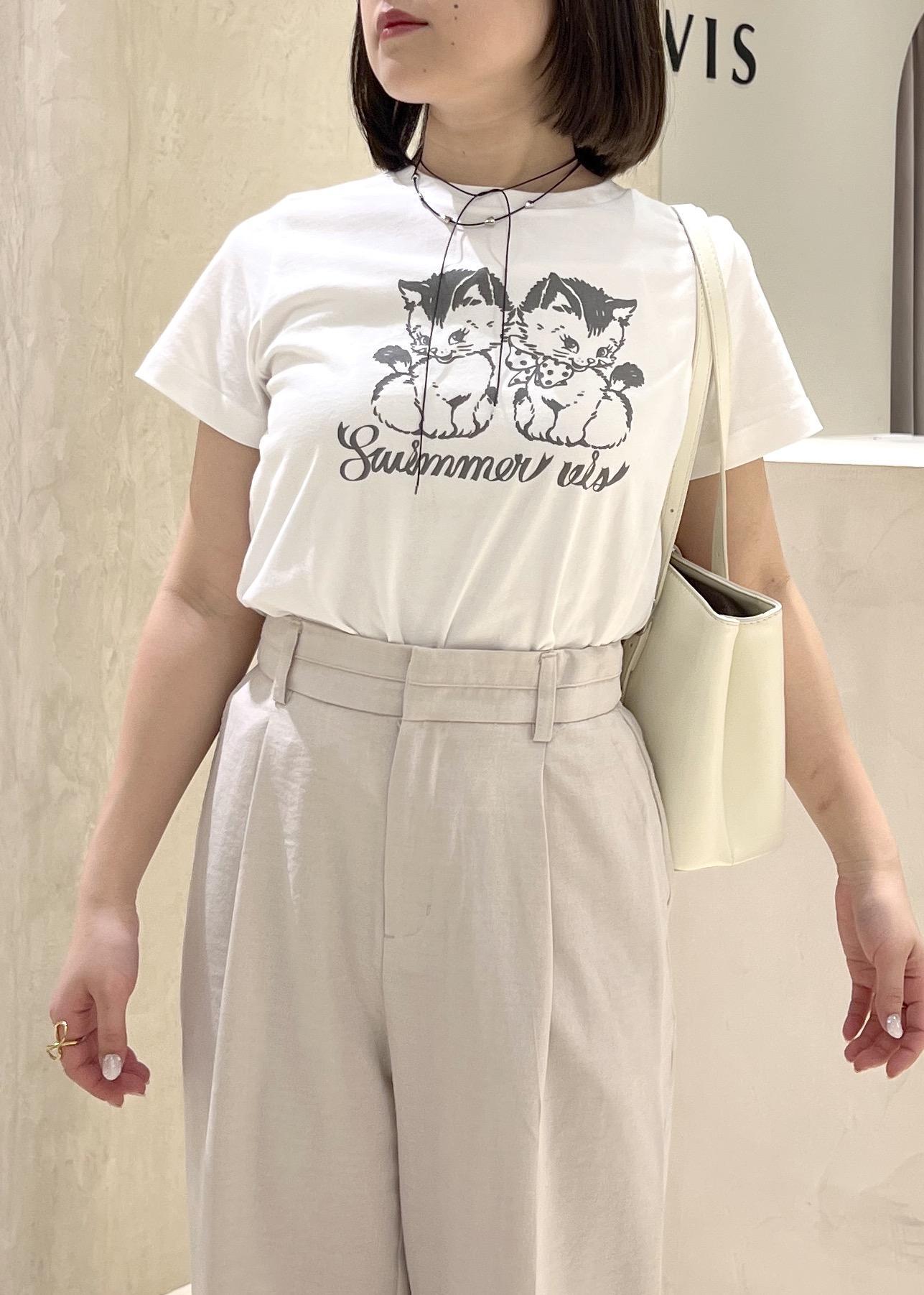 SWIMMER×VISのアイテムを使った、フェミニンカジュアルコーデです。可愛らしさのあるデザインのTシャツをワントーンでまとめ、シャツを巻くことで色味をプラスし、明るい季節にあわせました。