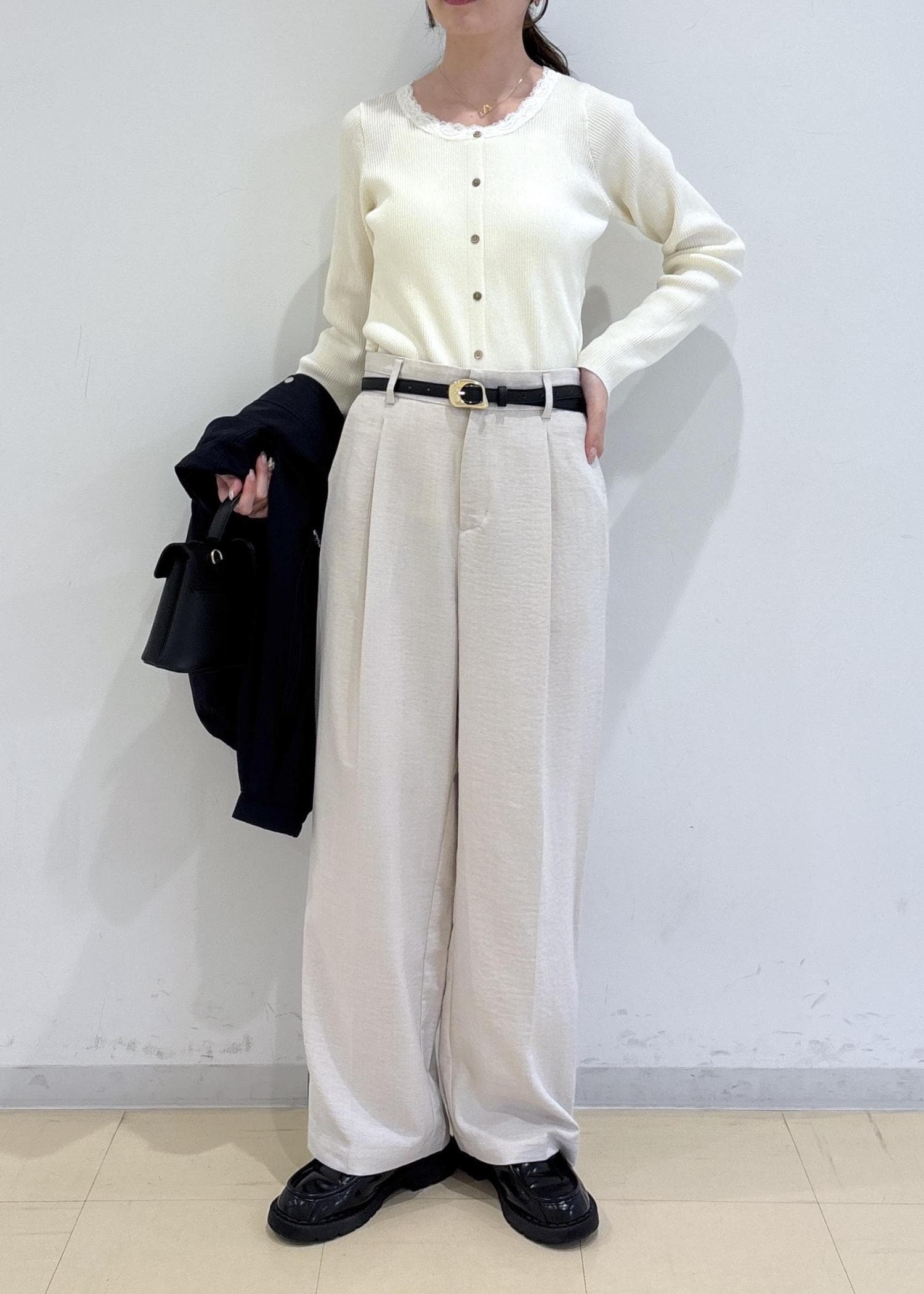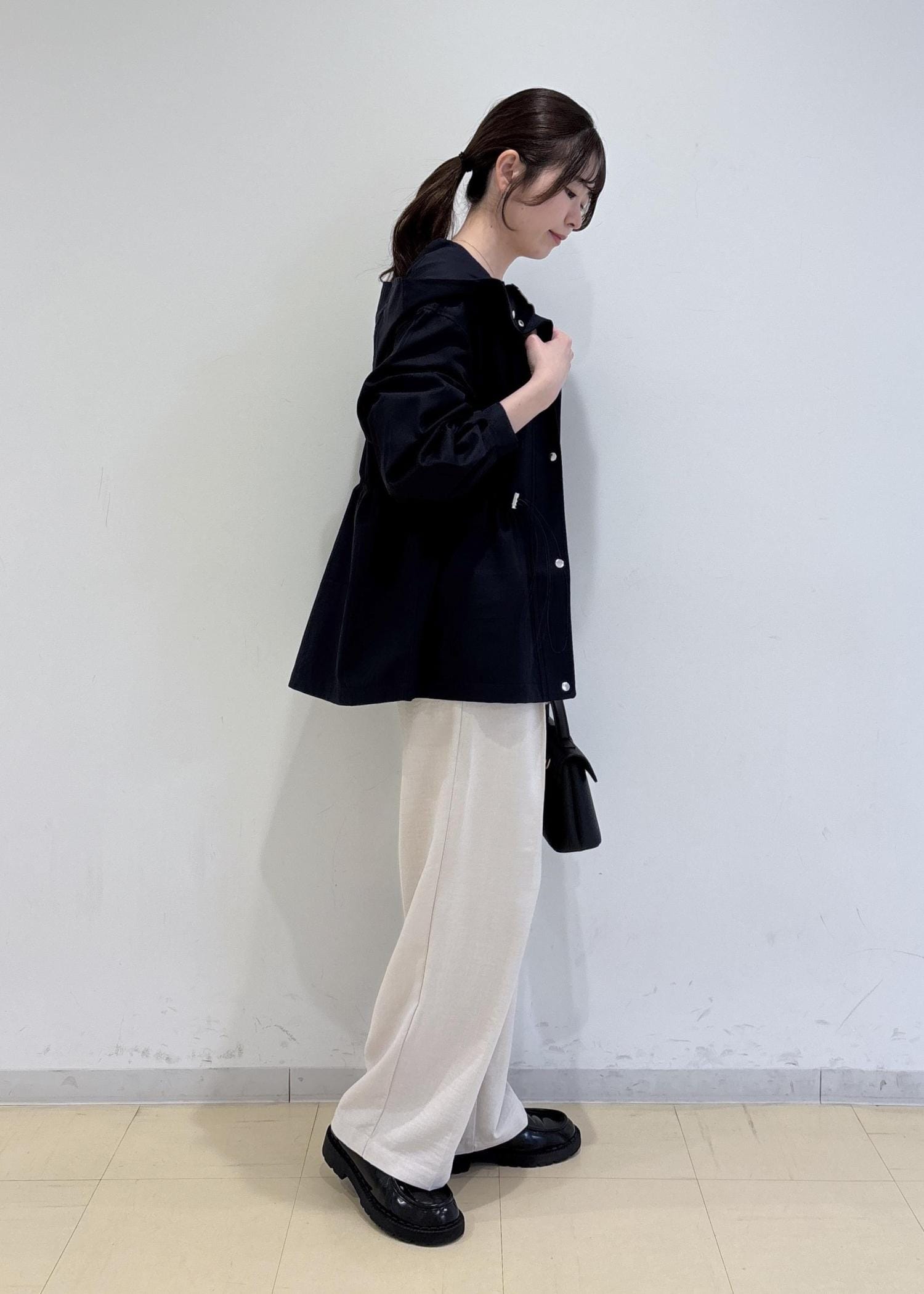 重い雰囲気になりすぎないようにトップスとパンツはオフホワイトを選びました。