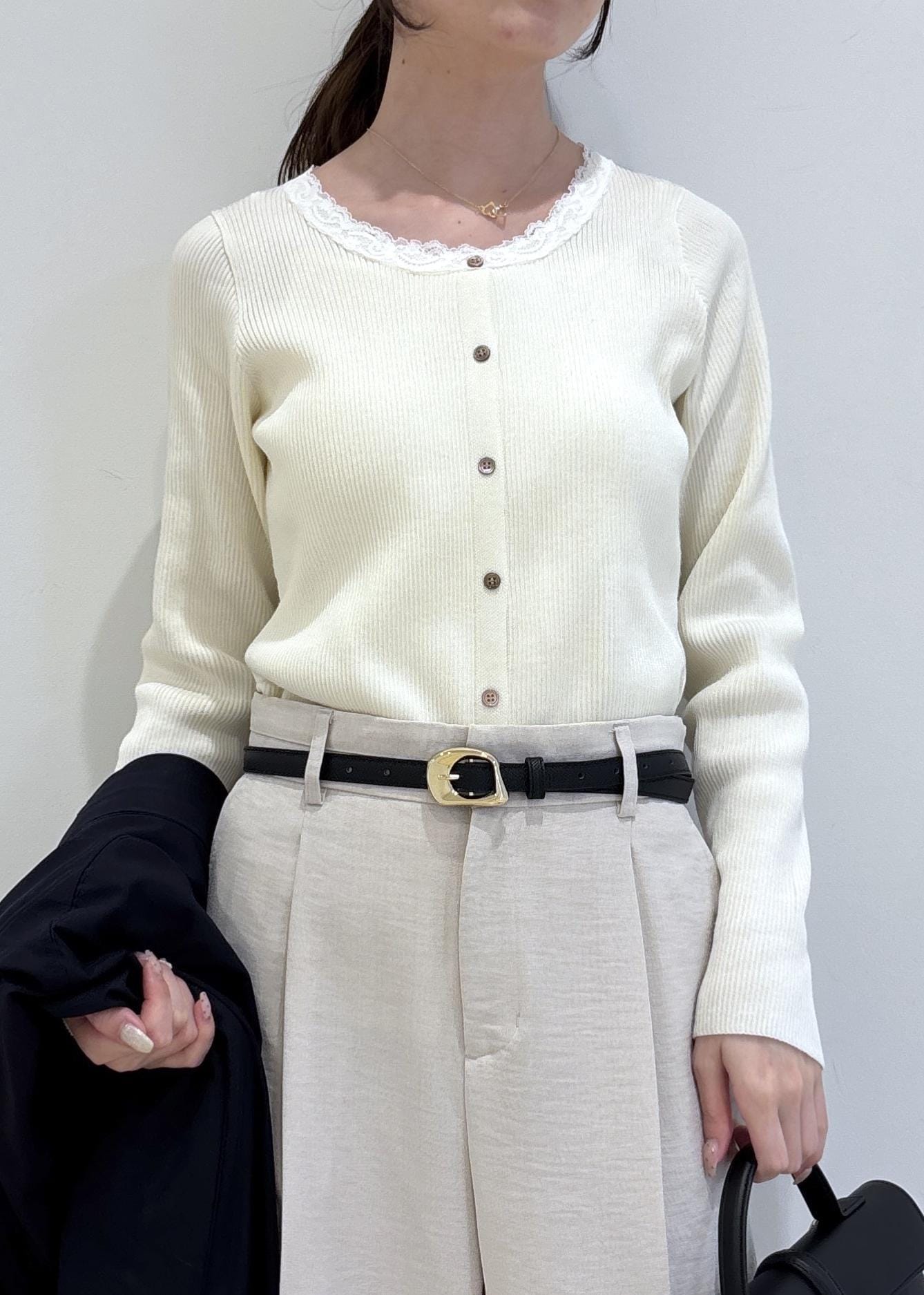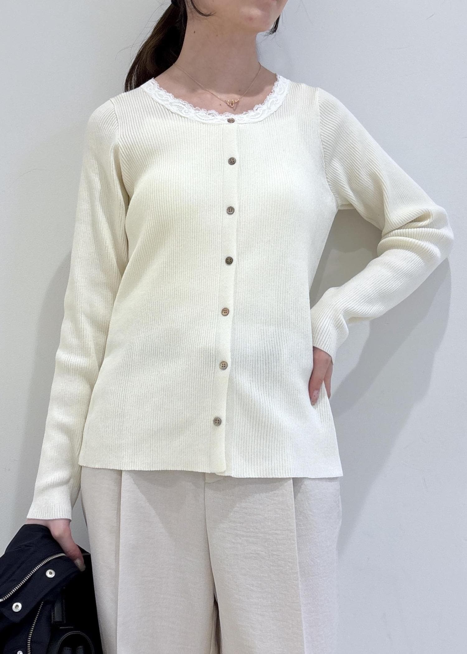 VISレーストリムニットオフホワイト / F¥5,929レビューフェイクボタンで着脱も楽です。首元のレースがワンポイントで可愛く、デコルテを綺麗に見せてくれます。