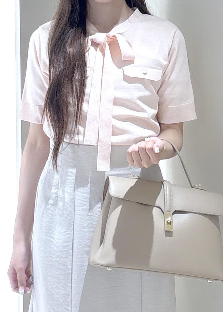 VISリボン付き半袖ニットプルオーバー/イージーケアピンク / F¥5,489レビュー身長155cmで腰が隠れるくらいの丈感です。
