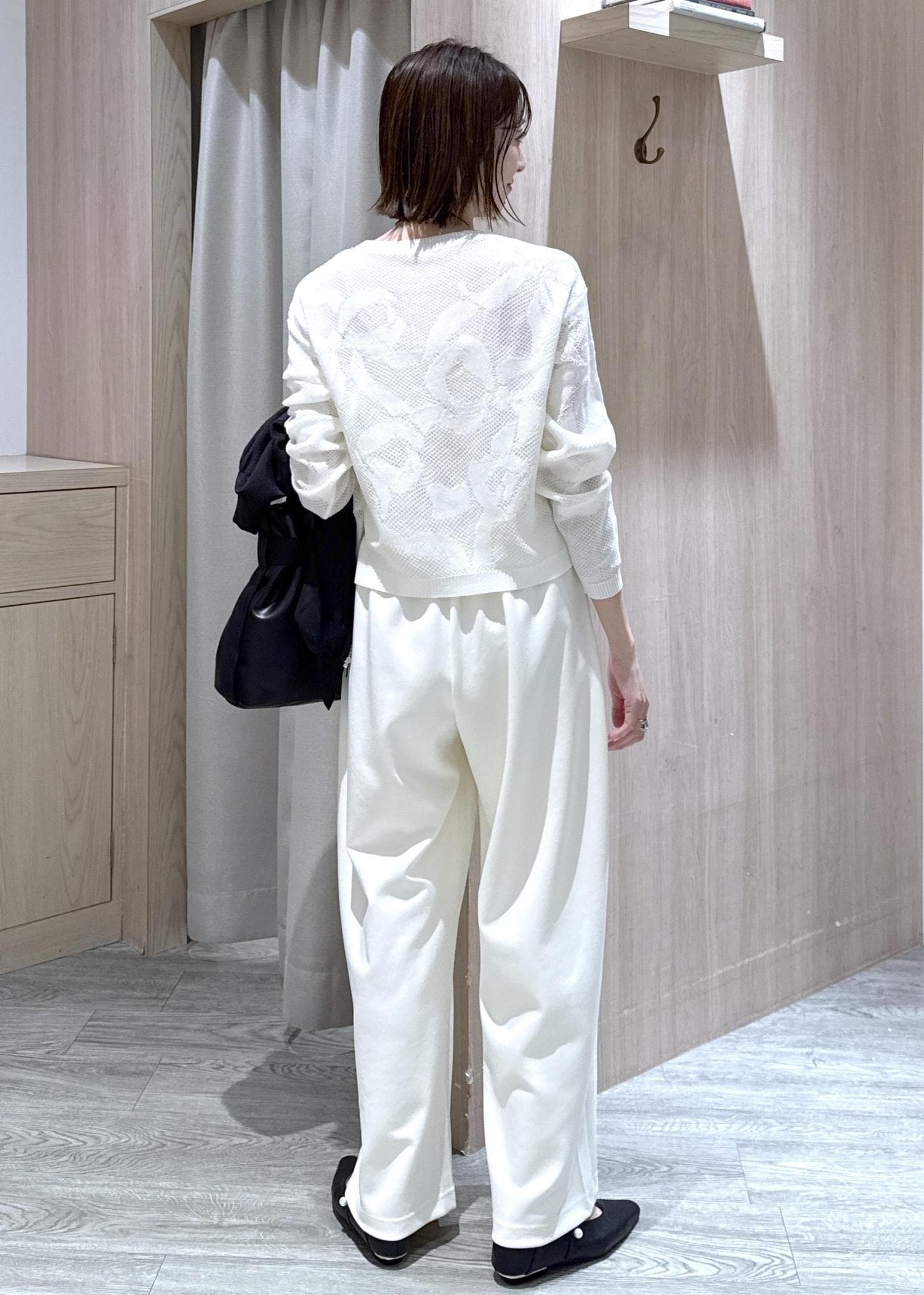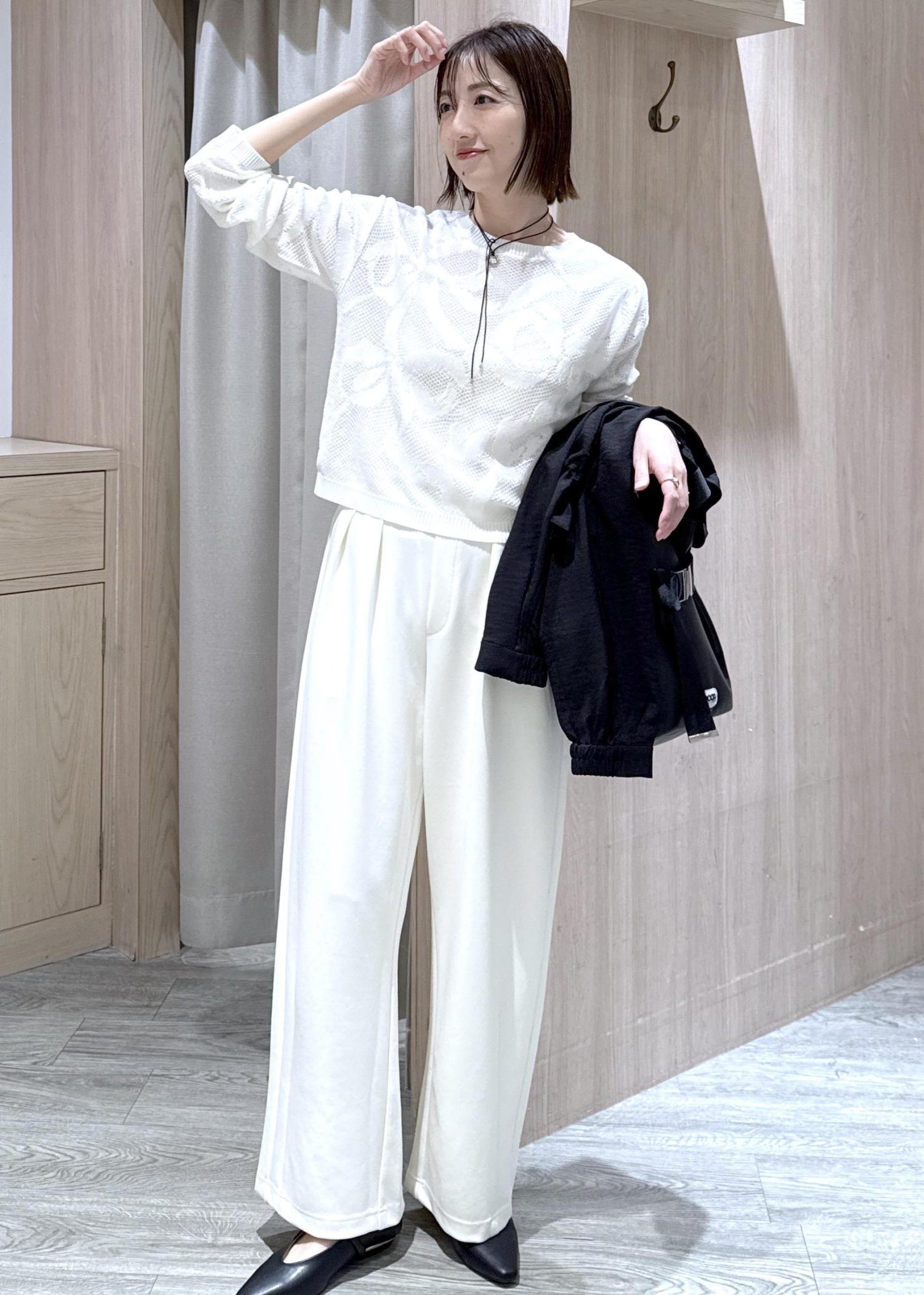 薄手のニットに今年らしいカーブスウェットを合わせた春のホワイトコーデ☆甘すぎるのが苦手なので、黒アウターで大人っぽくモノトーンにスタイリングしました!