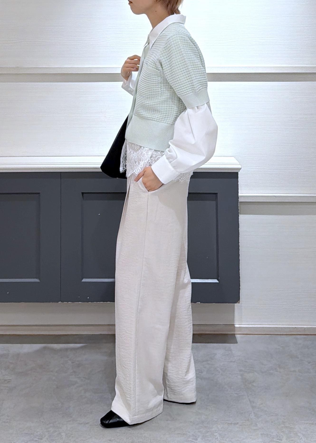 サラッとしたリネンライクな素材で軽く、楽に着用いただけますがきちんと感が出てくれるのが推しポイントです! -