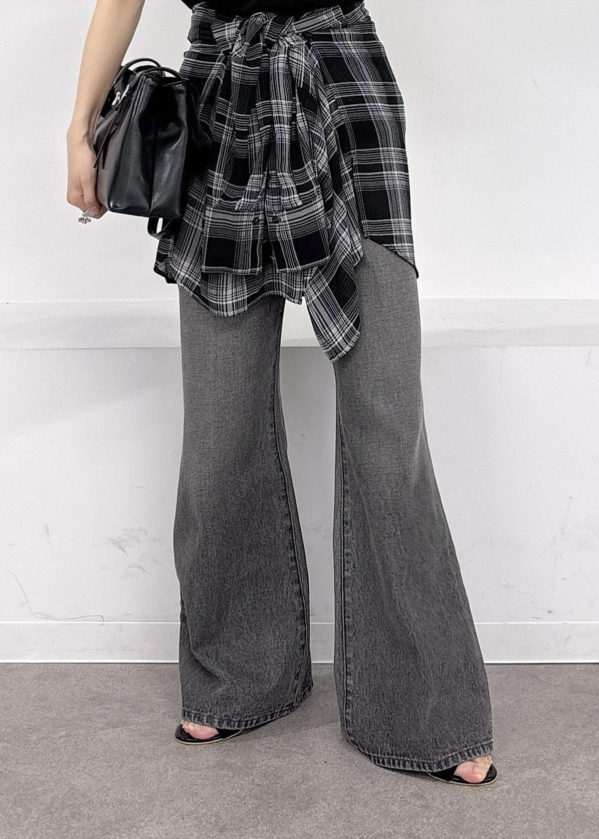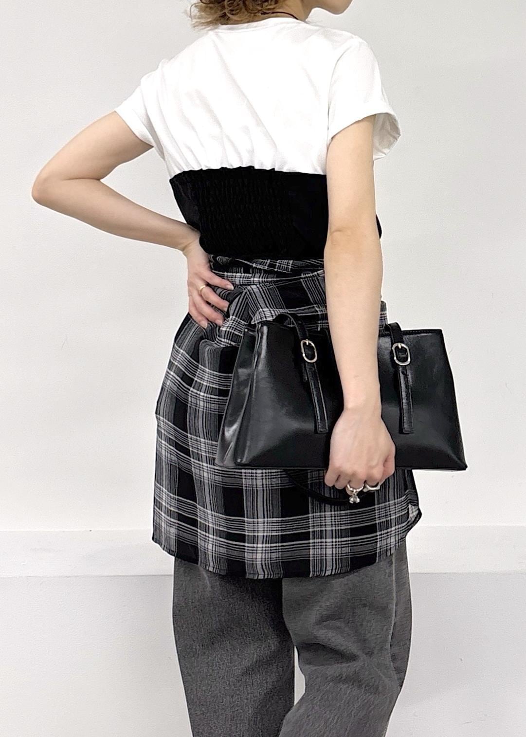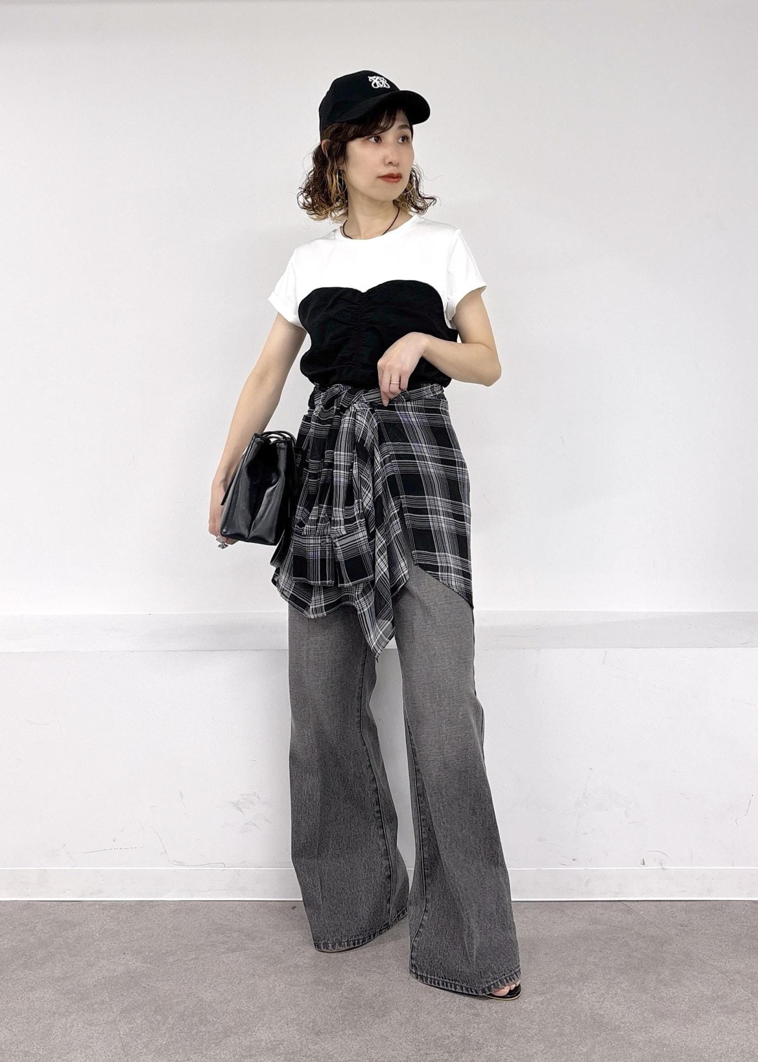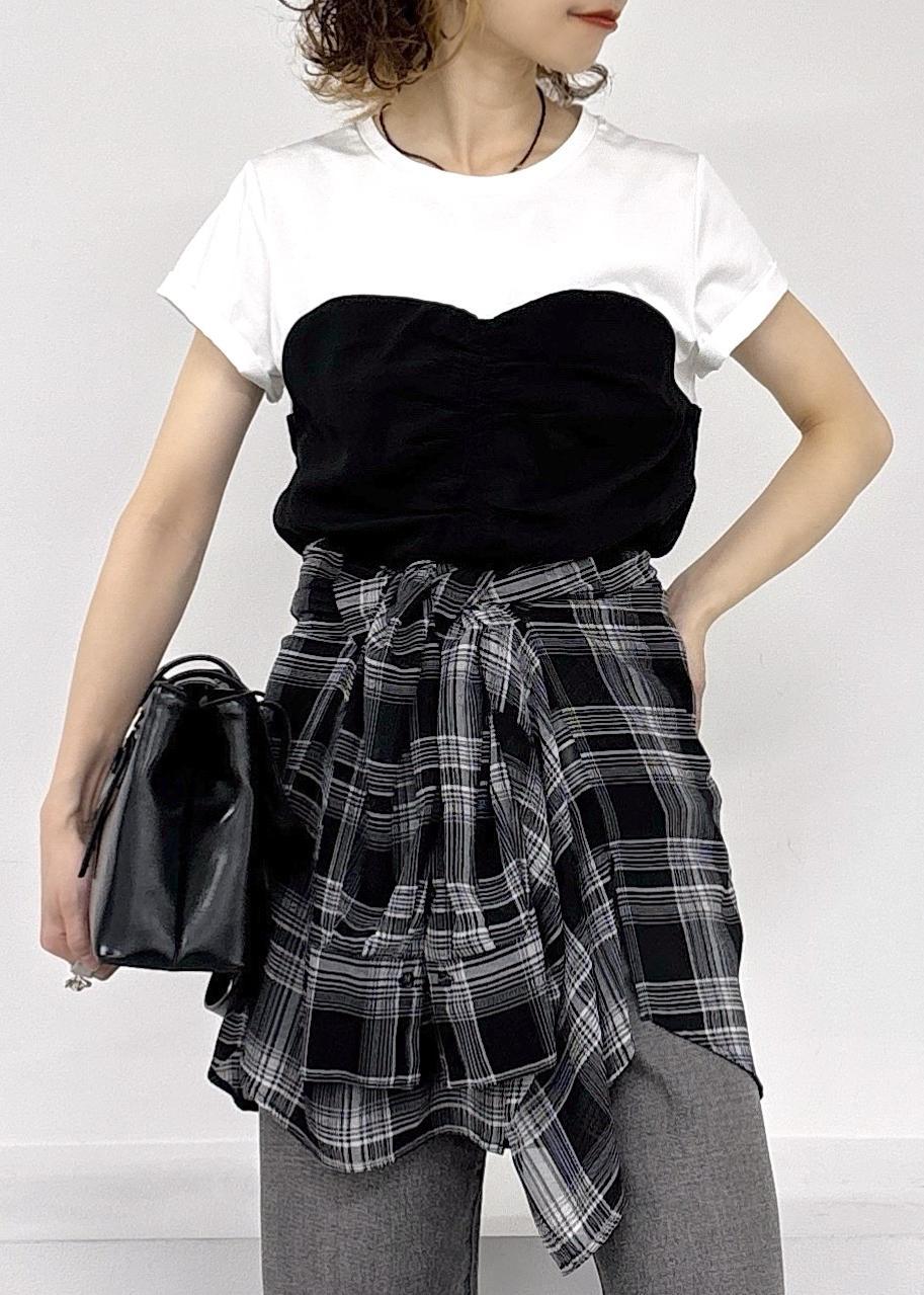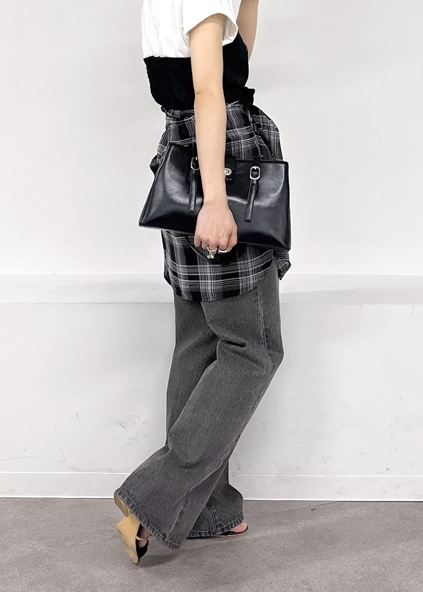 大人気美easyシリーズのWEB限定トップスが大人可愛い♪今回はカジュアルにブラックデニムにチェックのシャツを腰巻きでモノトーンスタイルにまとめました◎アクティブな春夏のお出かけにぴったりな大人カジュアルコーデ。