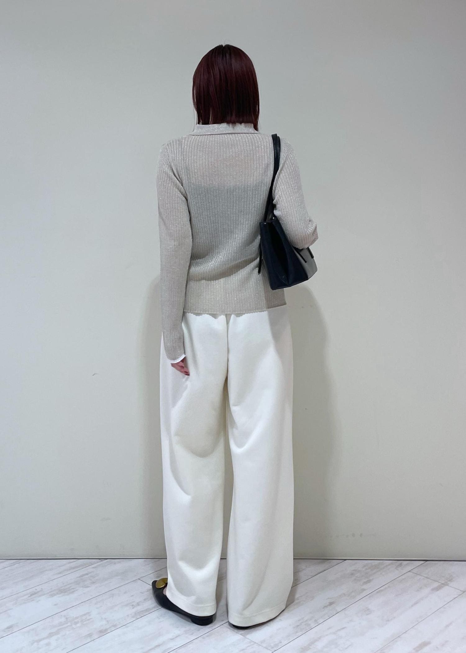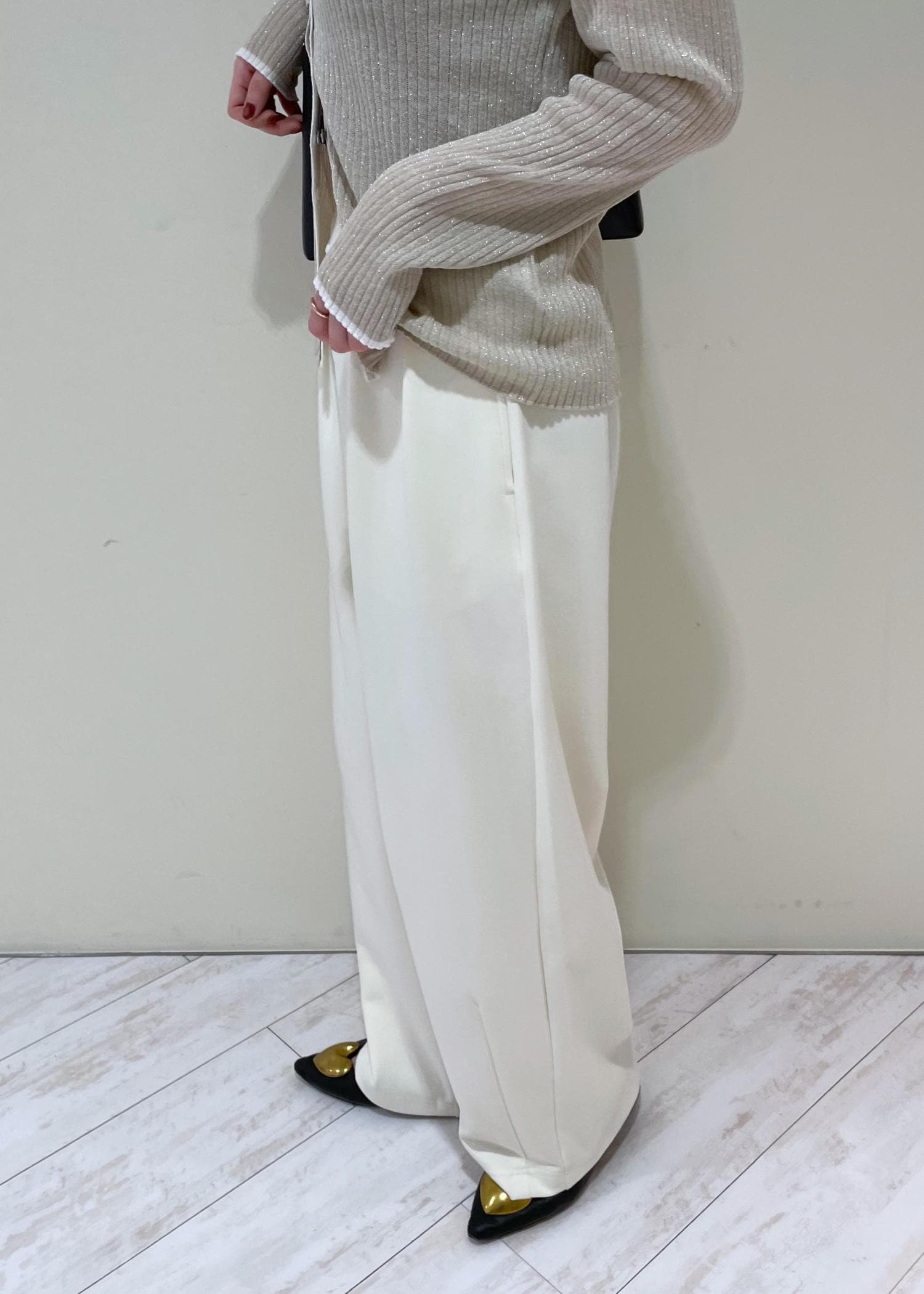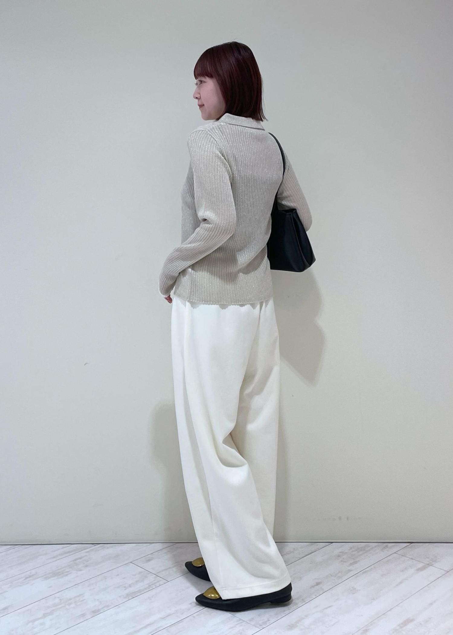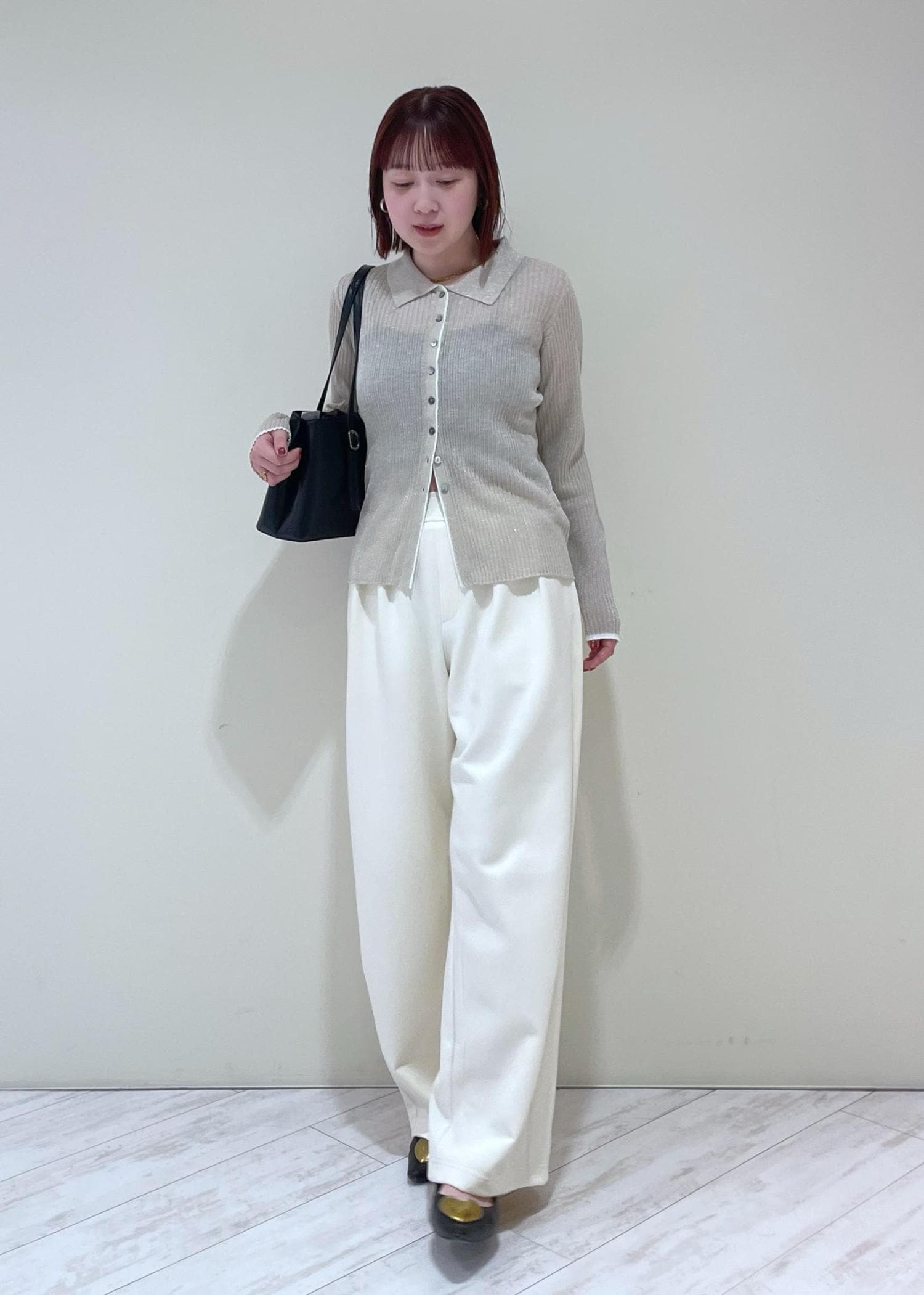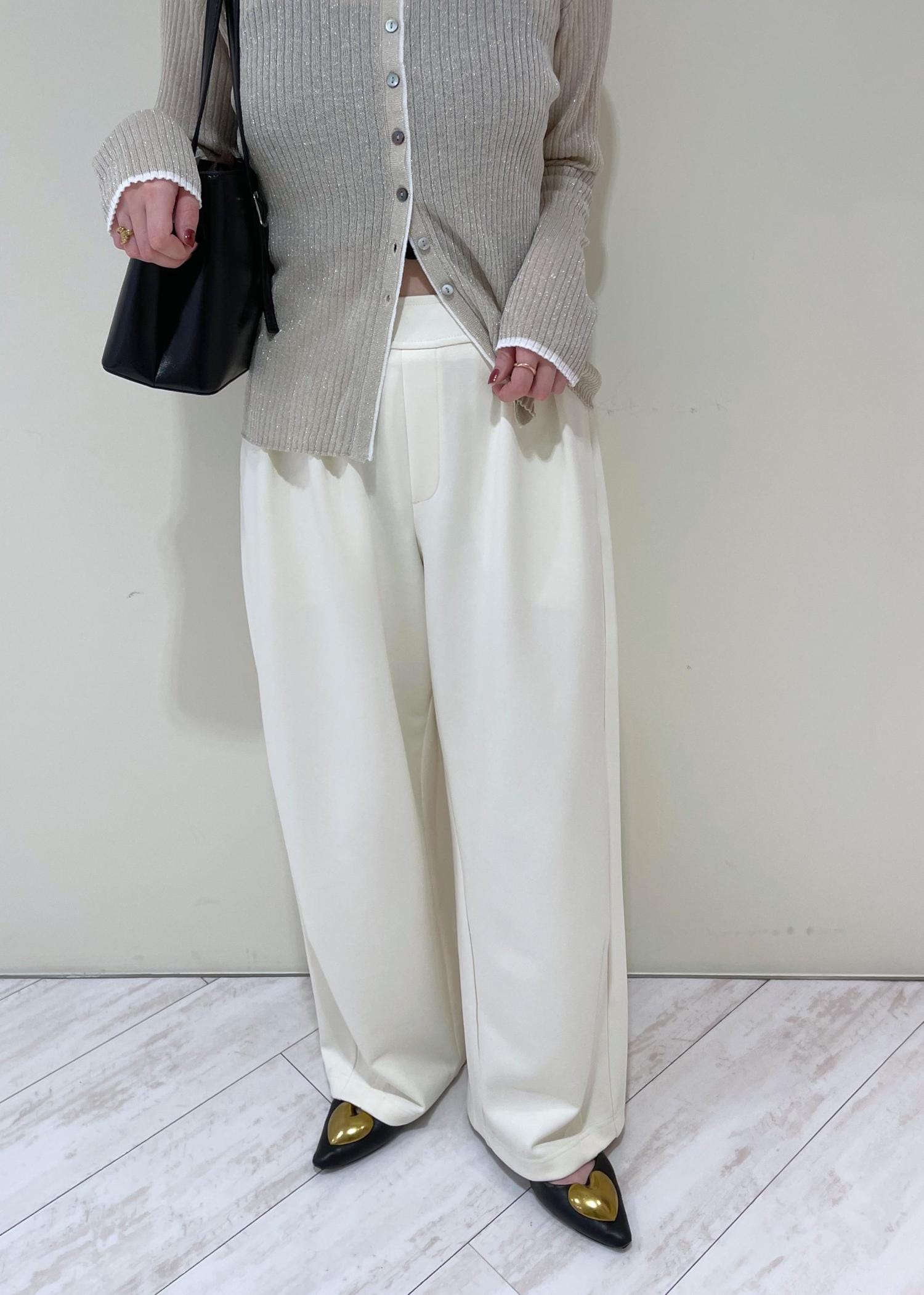 VISカットカーブスラックスパンツオフホワイト / F¥6,589レビュー身長159cmでやや長めの丈感、フラットシューズでも床につかないくらいなのでトレンド感あるサイズ感です◎カーブシルエットでゆったりはしてますがタック入りなので膨張せずスッキリ着れます!光沢感があるので綺麗め使い、オフィスコーデにも合います。