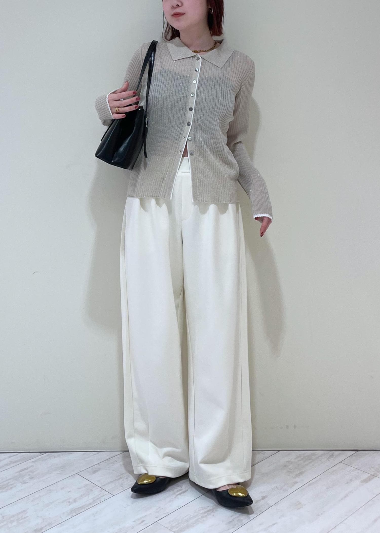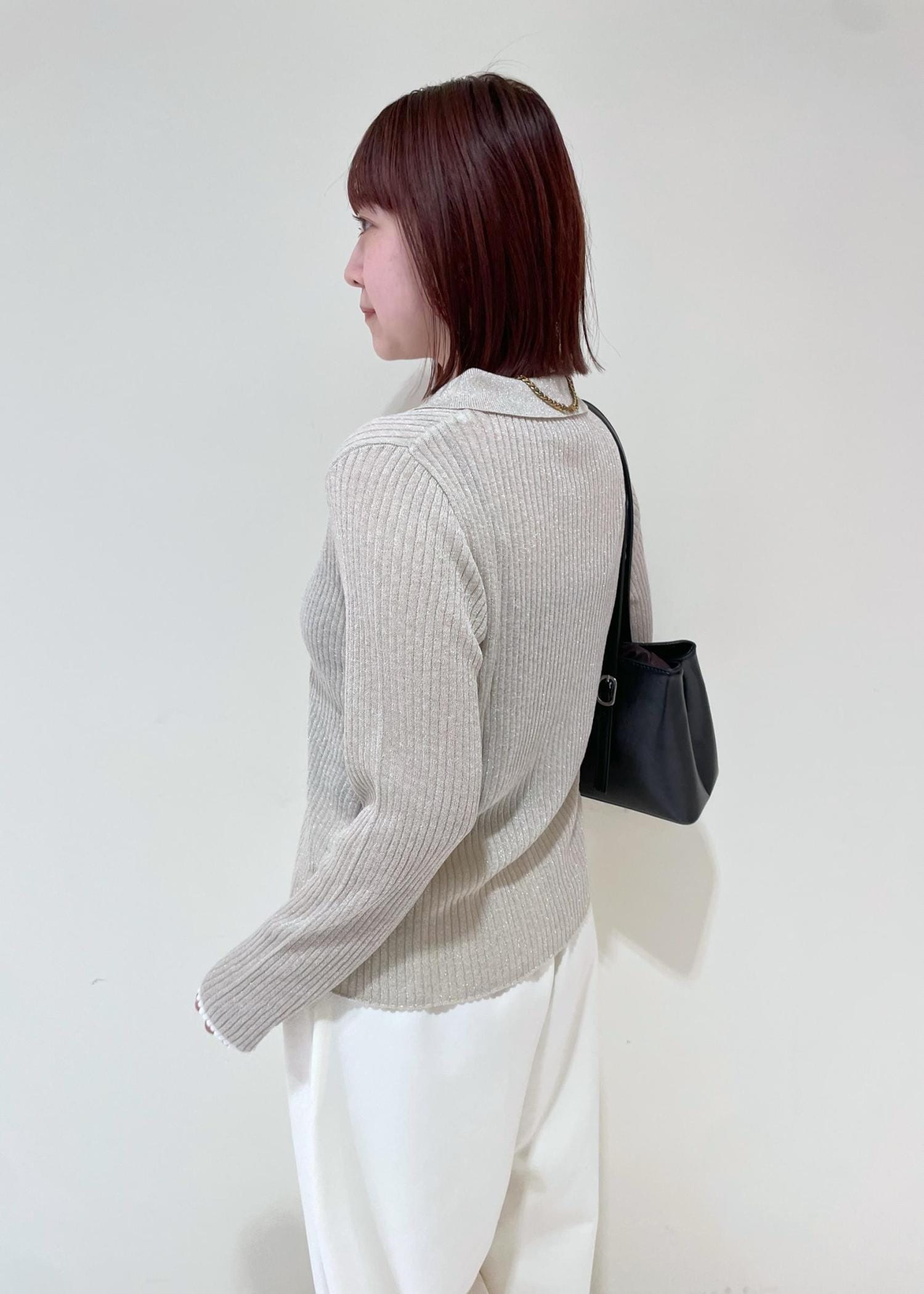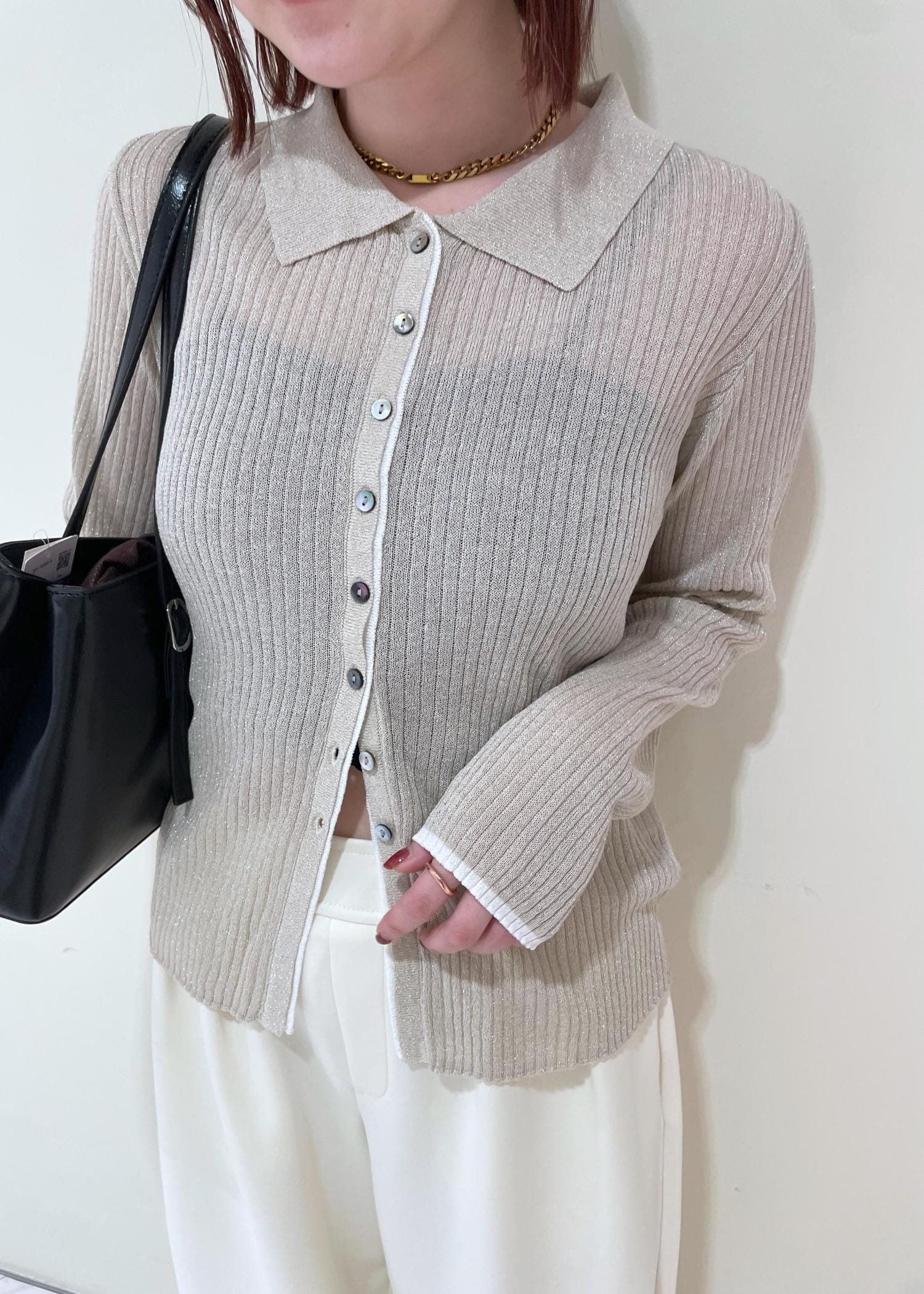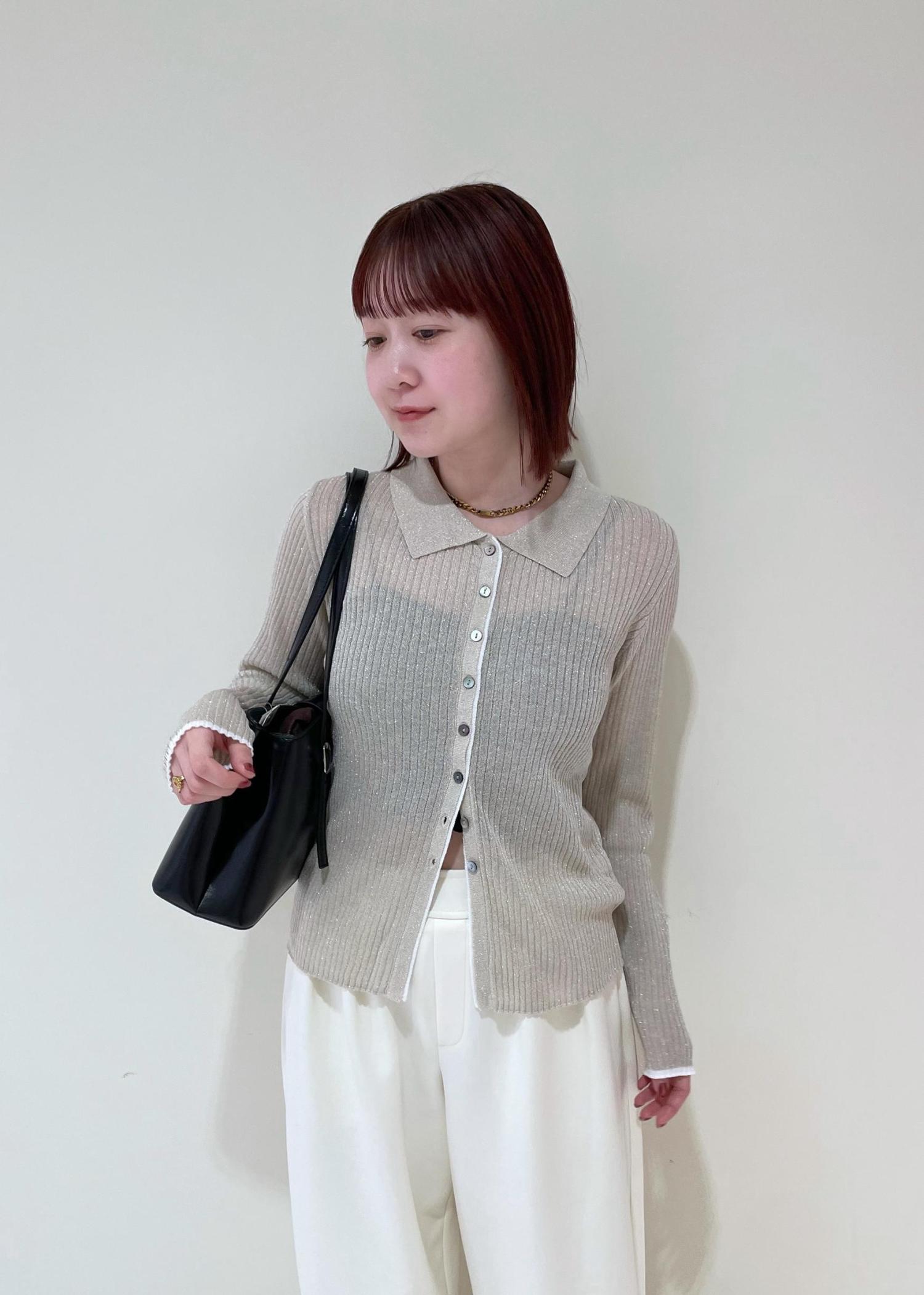 VISポロ襟配色シアーリブカーディガン/イージーケアベージュ / F¥6,589レビュー程よいフィット感でボディラインを綺麗に見せてくれます、肩ストさんは上下どちらか釦を2.3個外して抜け感作るとより華奢見えが叶います◎バイカラー&ラメ感で春夏1枚で着映えするアイテムです!