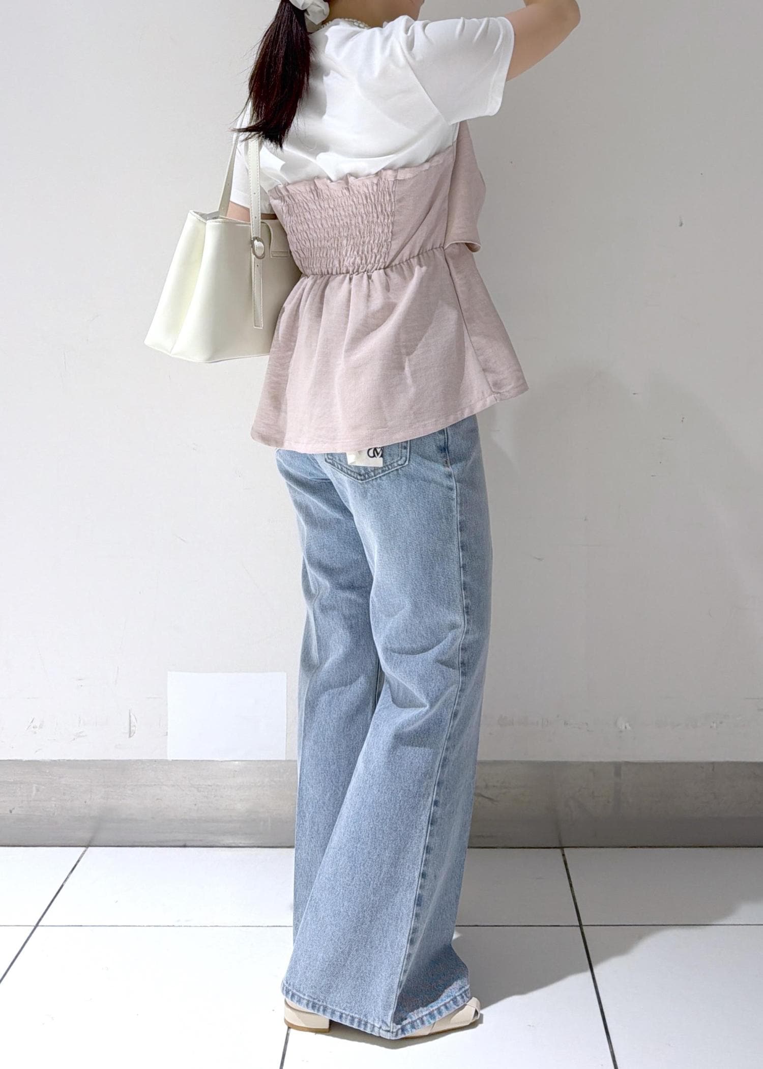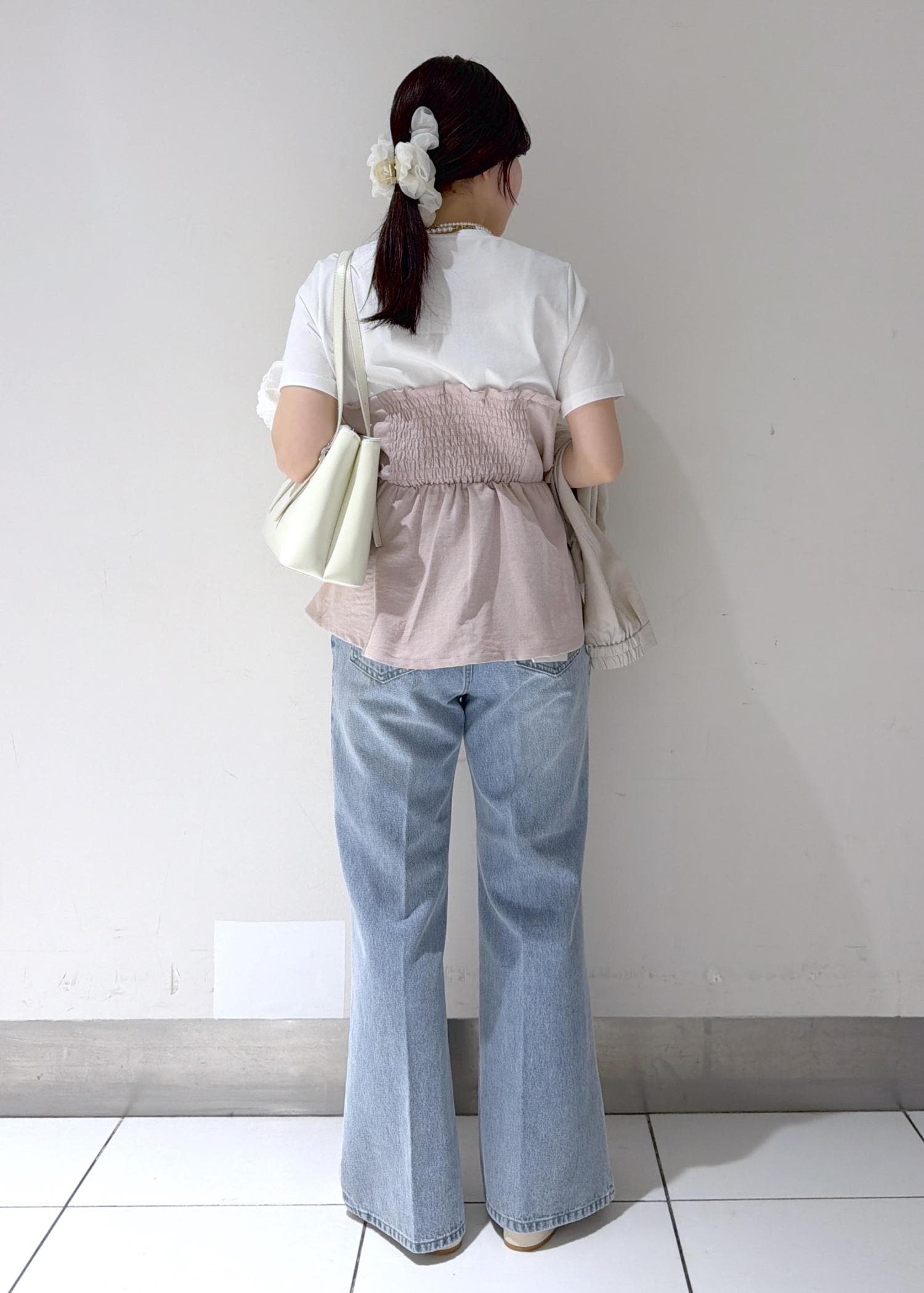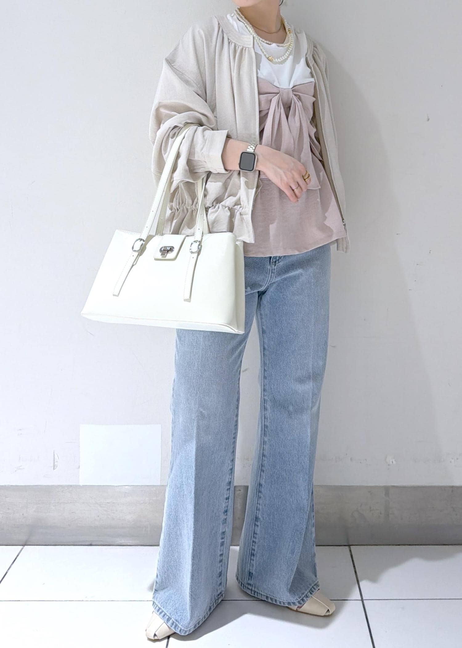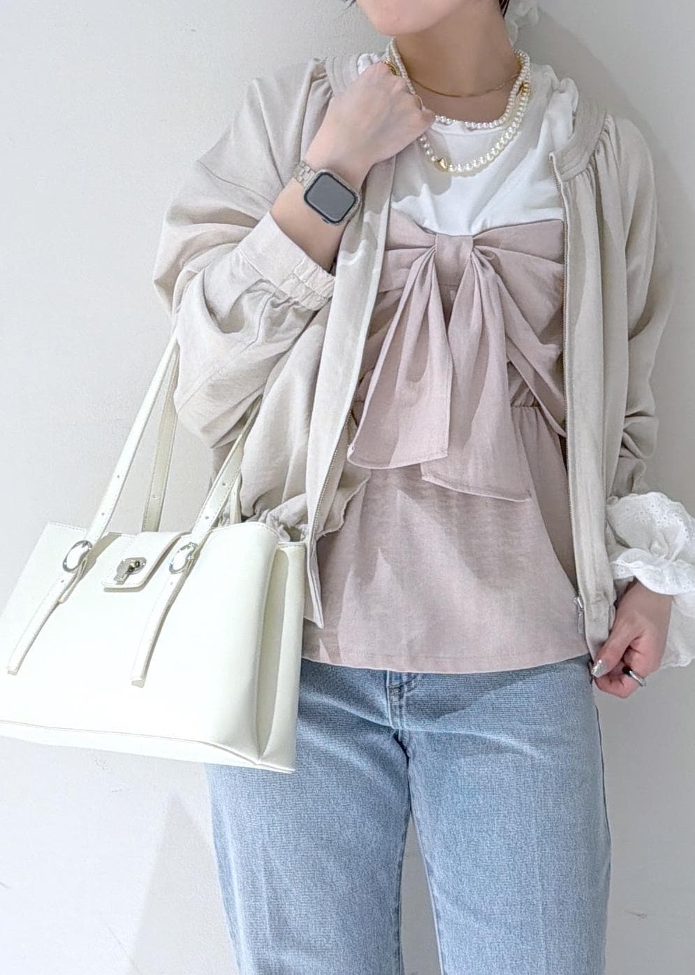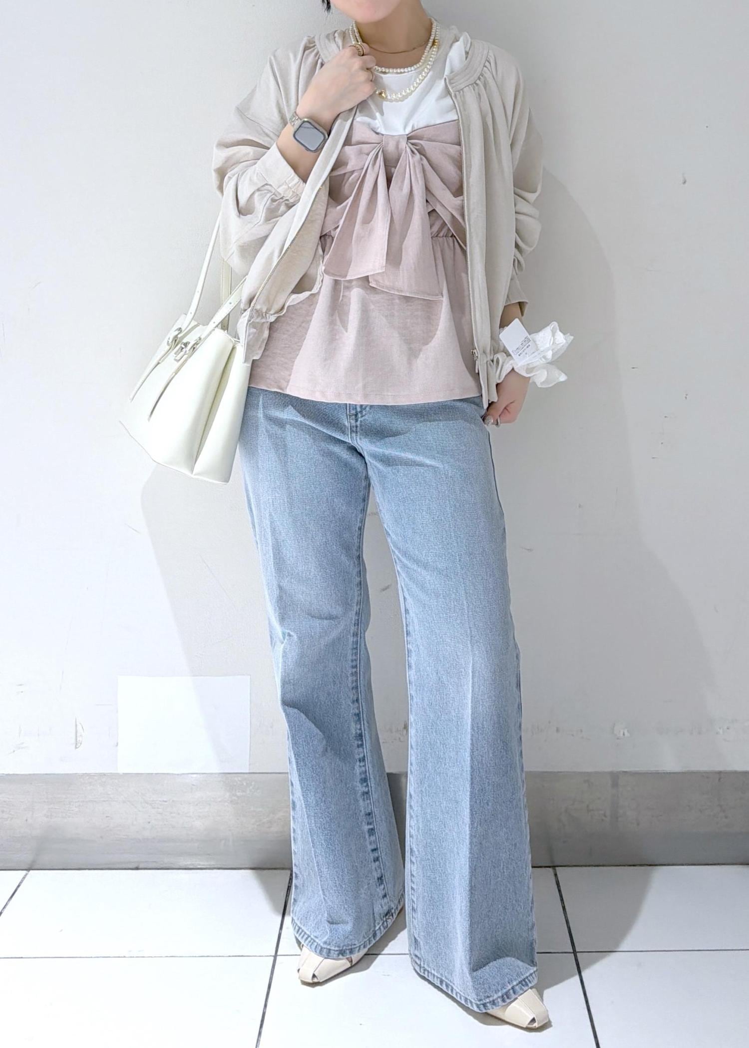 リボンデザインが目を引くトップスを主役にした、フェミニンカジュアルスタイル✨