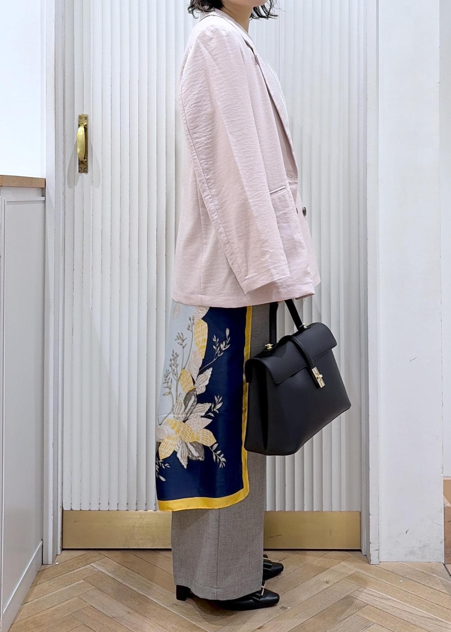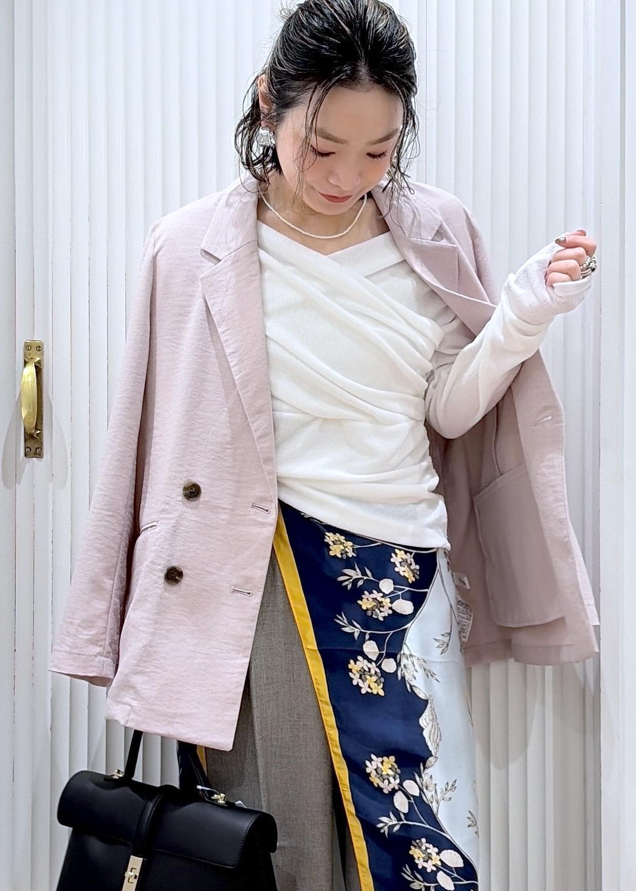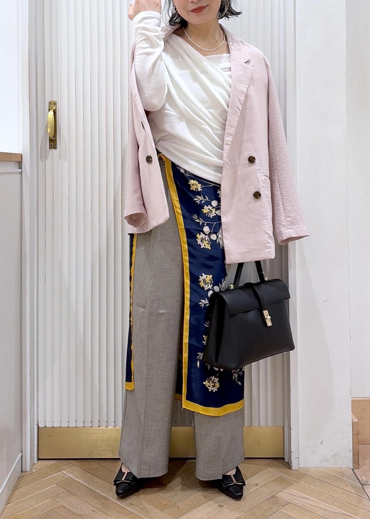 やわらかなピンクジャケットに、ドレープ感のあるホワイトトップスで女性らしさをプラス。柄スカーフのアクセントがシンプルなワイドパンツに動きを出してくれる。抜け感と上品さのバランスがちょうどいい、大人の春スタイル。