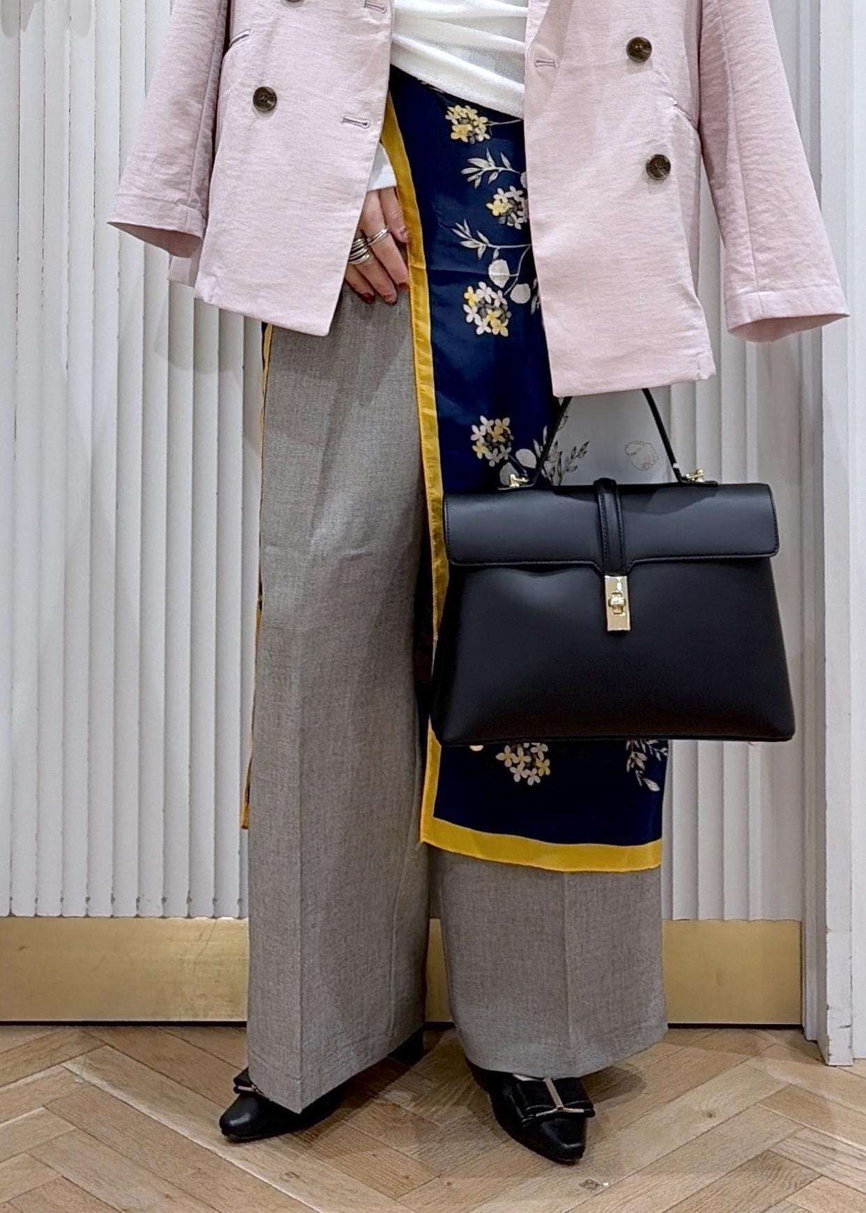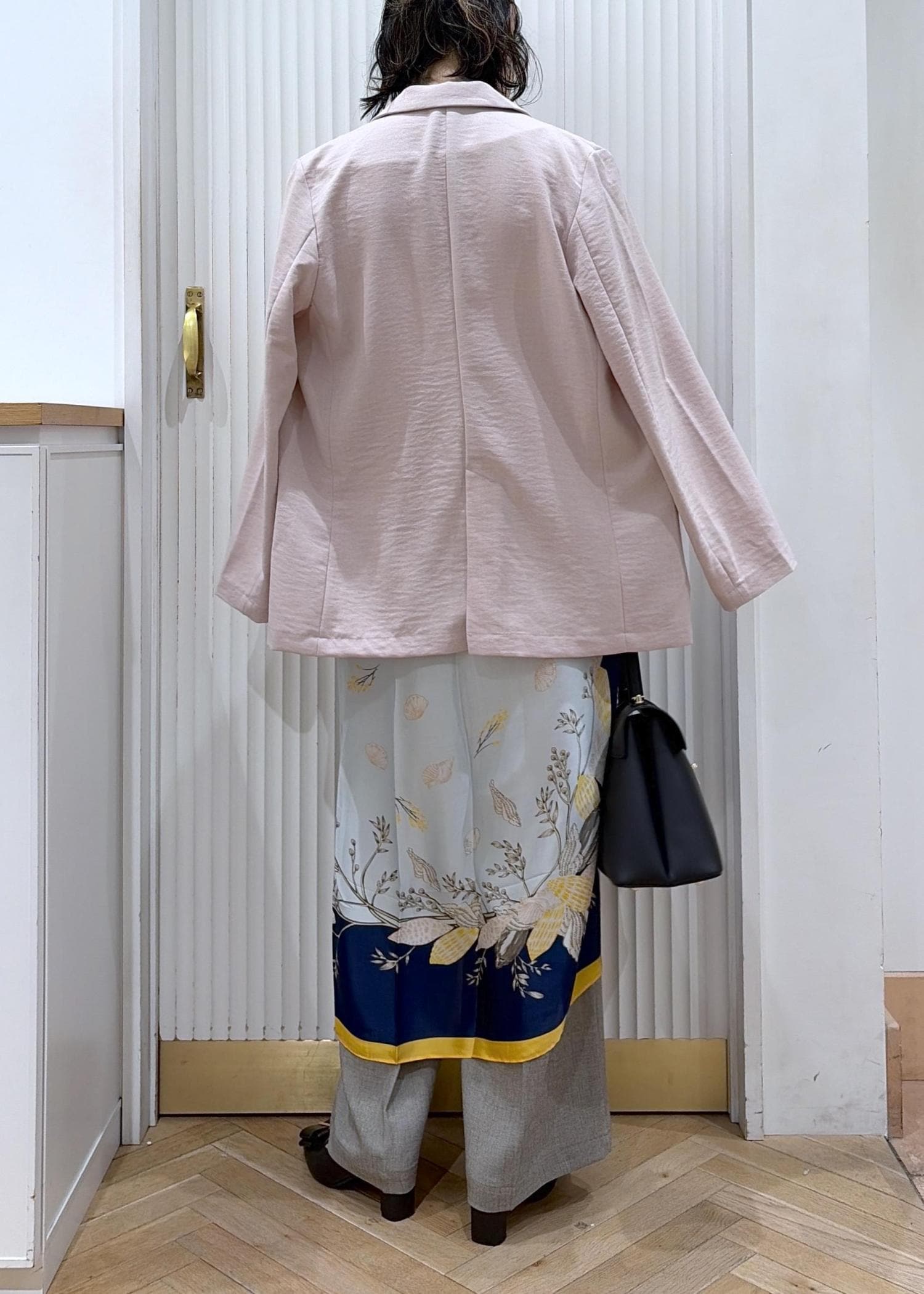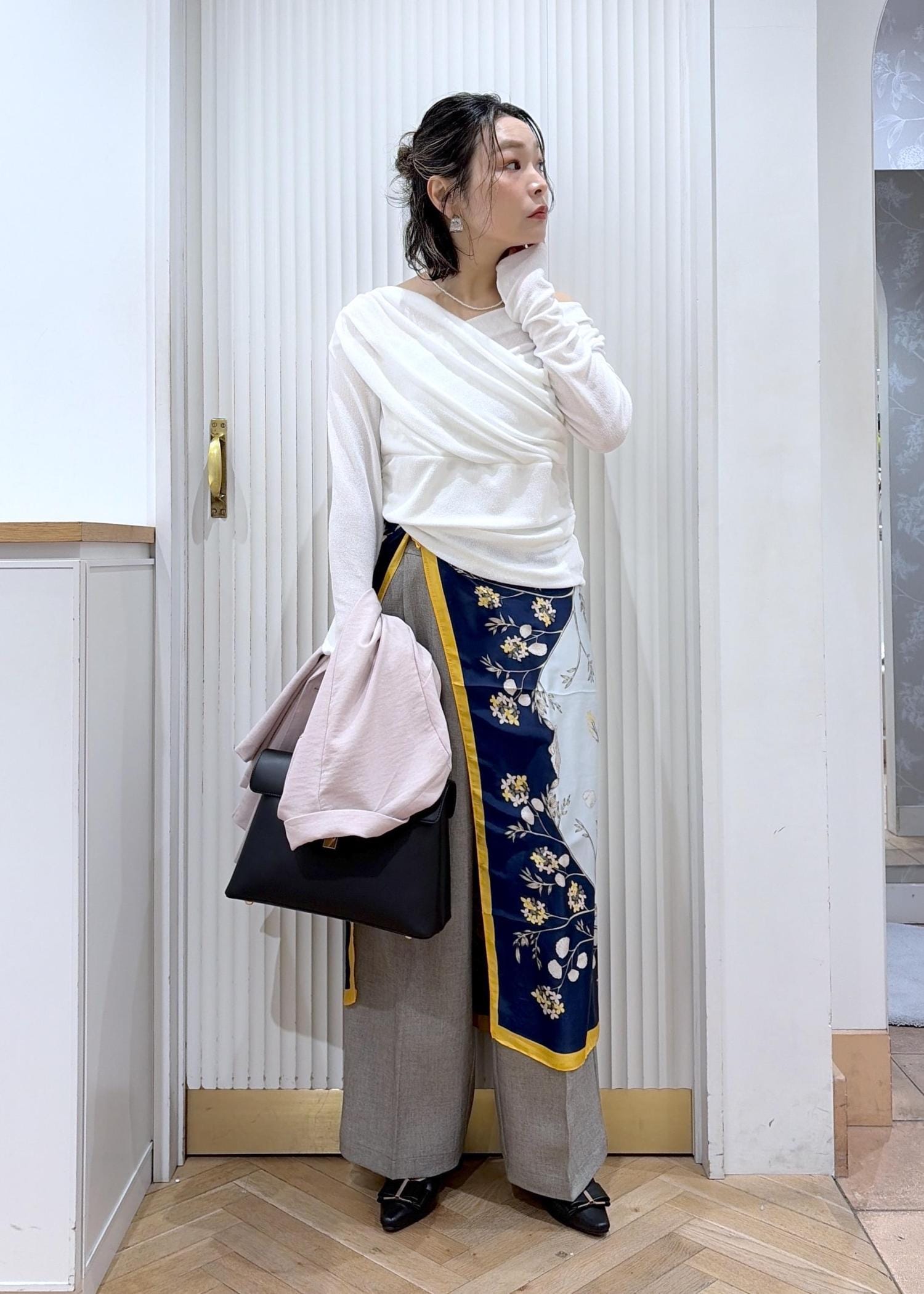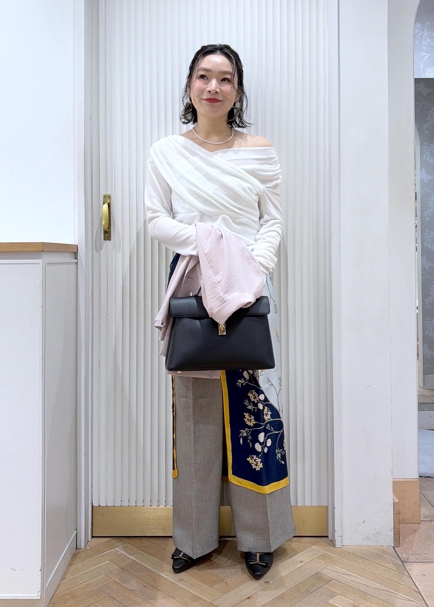 やわらかなピンクジャケットに、ドレープ感のあるホワイトトップスで女性らしさをプラス。柄スカーフのアクセントがシンプルなワイドパンツに動きを出してくれる。抜け感と上品さのバランスがちょうどいい、大人の春スタイル。