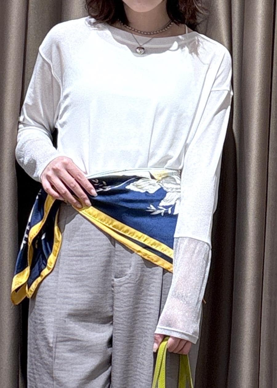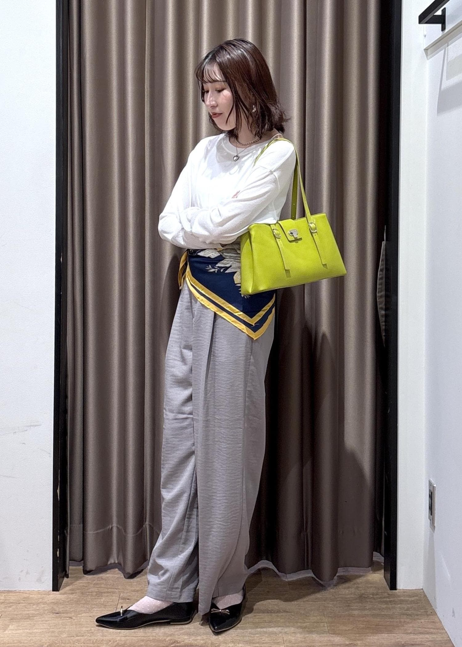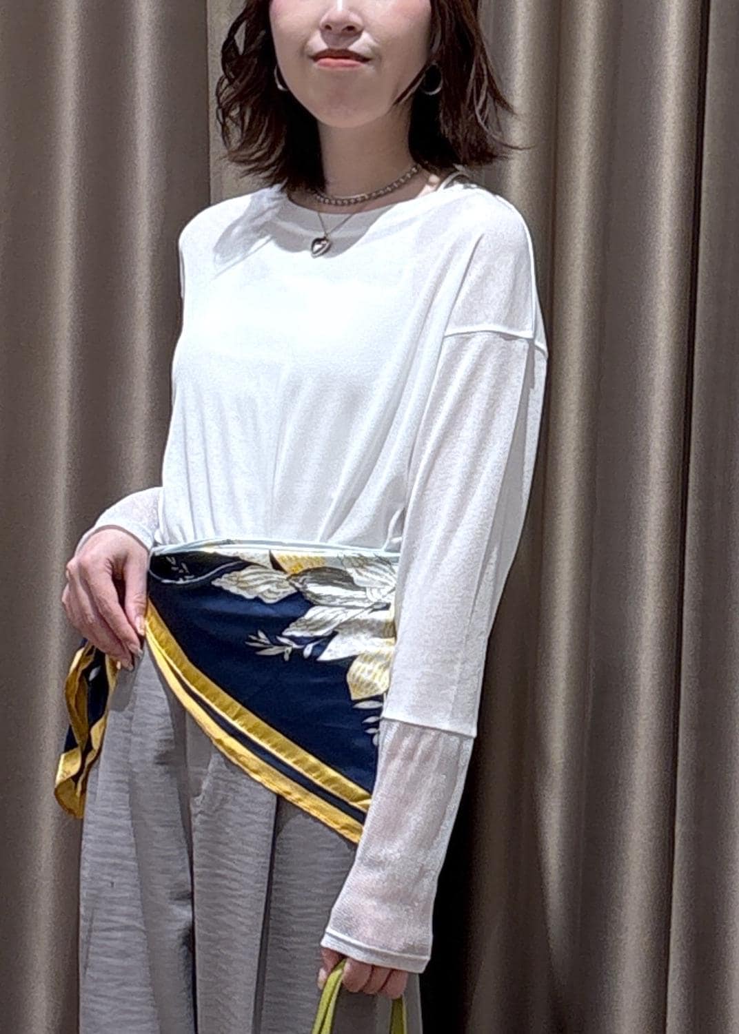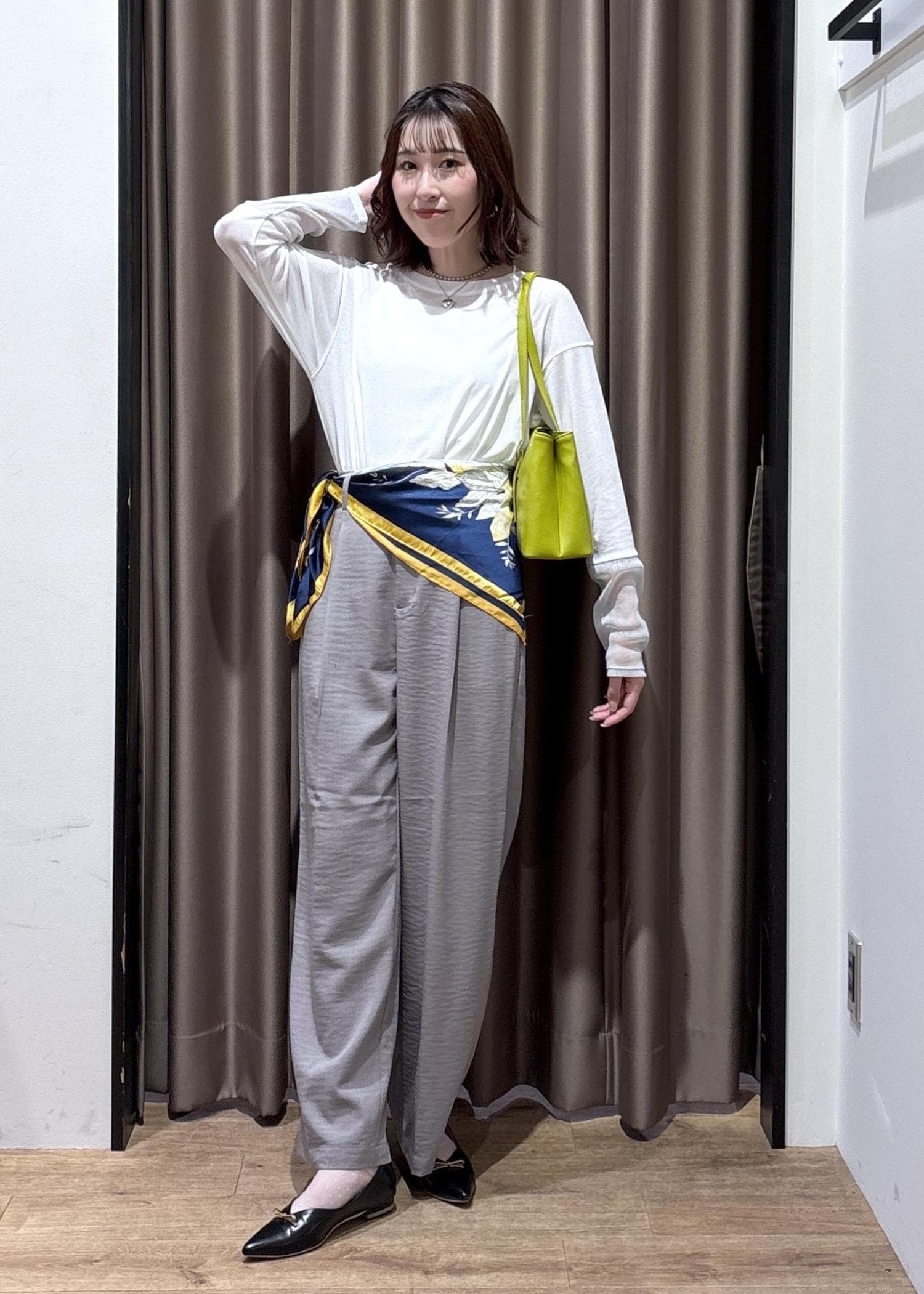 これからの時期にピッタリなシアーロンTにスカーフアレンジをしたパンツコーデ。