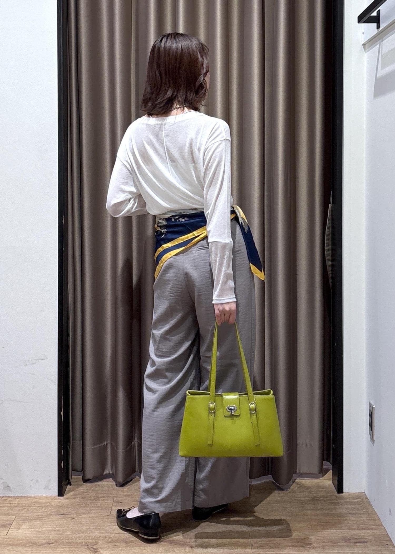 スカーフの色味とバッグの色味が喧嘩しないようにトップスはホワイト系で。