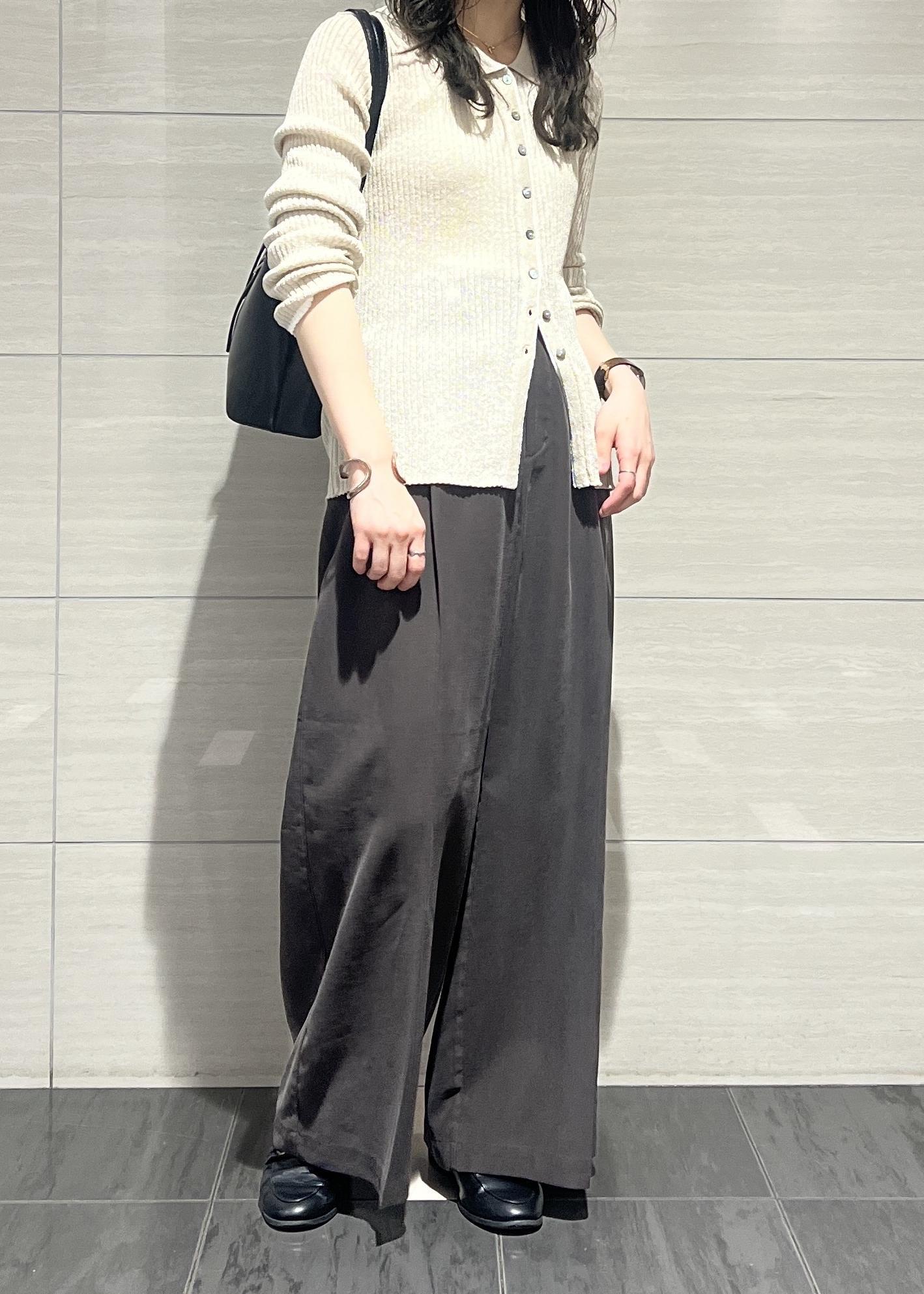 152cmでSサイズ着用。ぺたんこ靴でも床につかない着丈で安心して履けました。ワイドシルエットでお尻周りも気にならず体型カバーしてくれます✨