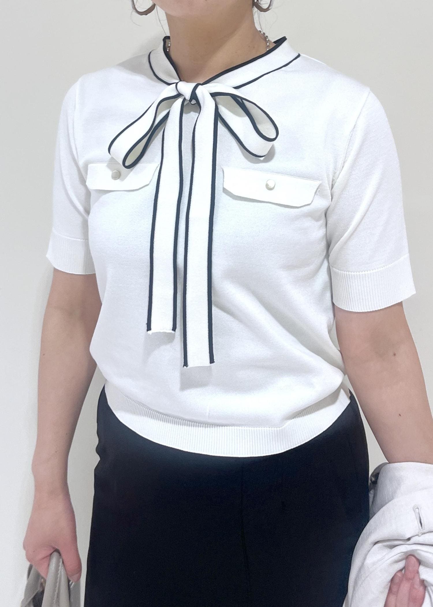 VISリボン付き半袖ニットプルオーバー/イージーケアキナリ系 / F¥5,489レビューきちんと見えしつつリボンとポケットデザインがかわいい着映えニットです。