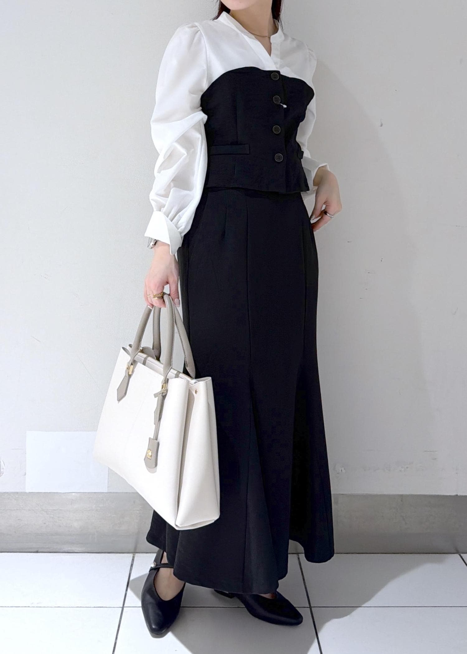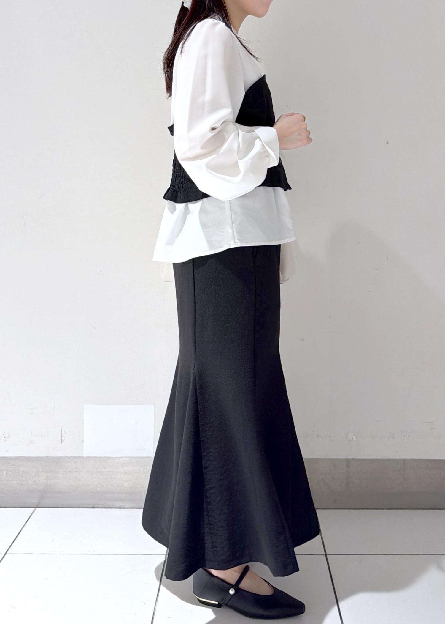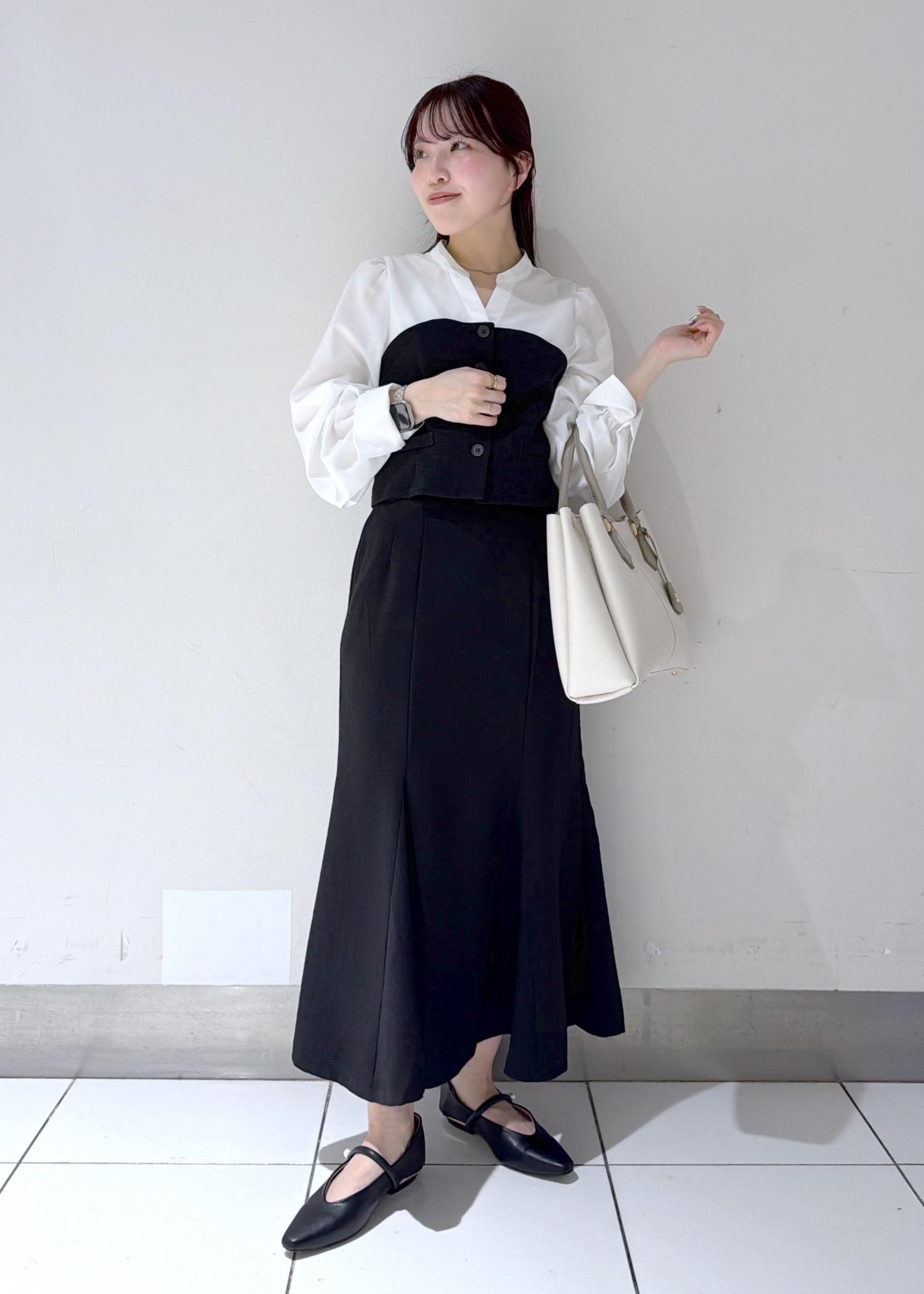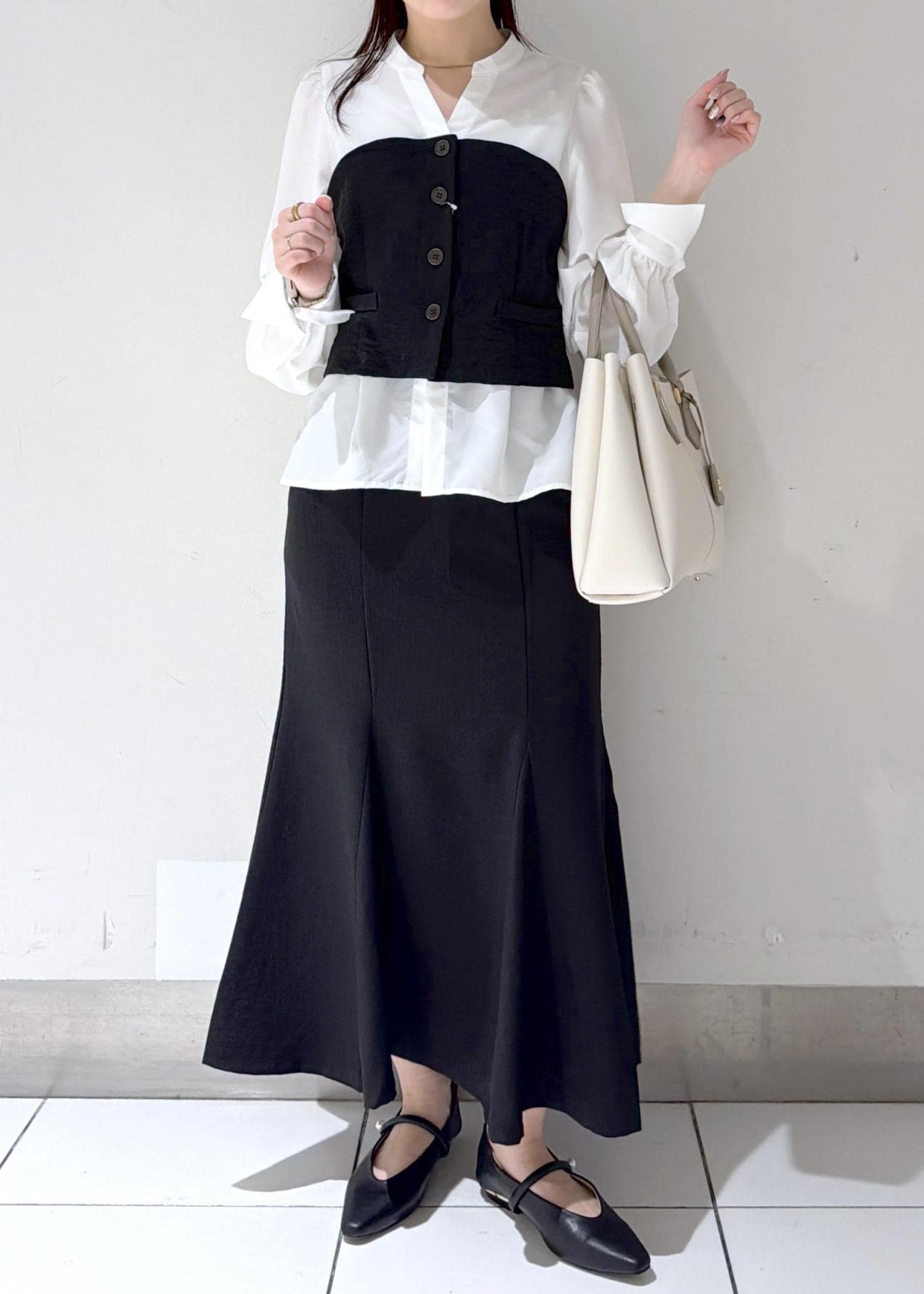 ウエスト位置を高く見せてくれるビスチェドッキングシャツと、すっきりとしたシルエットのスカートでスタイルアップ効果も◎