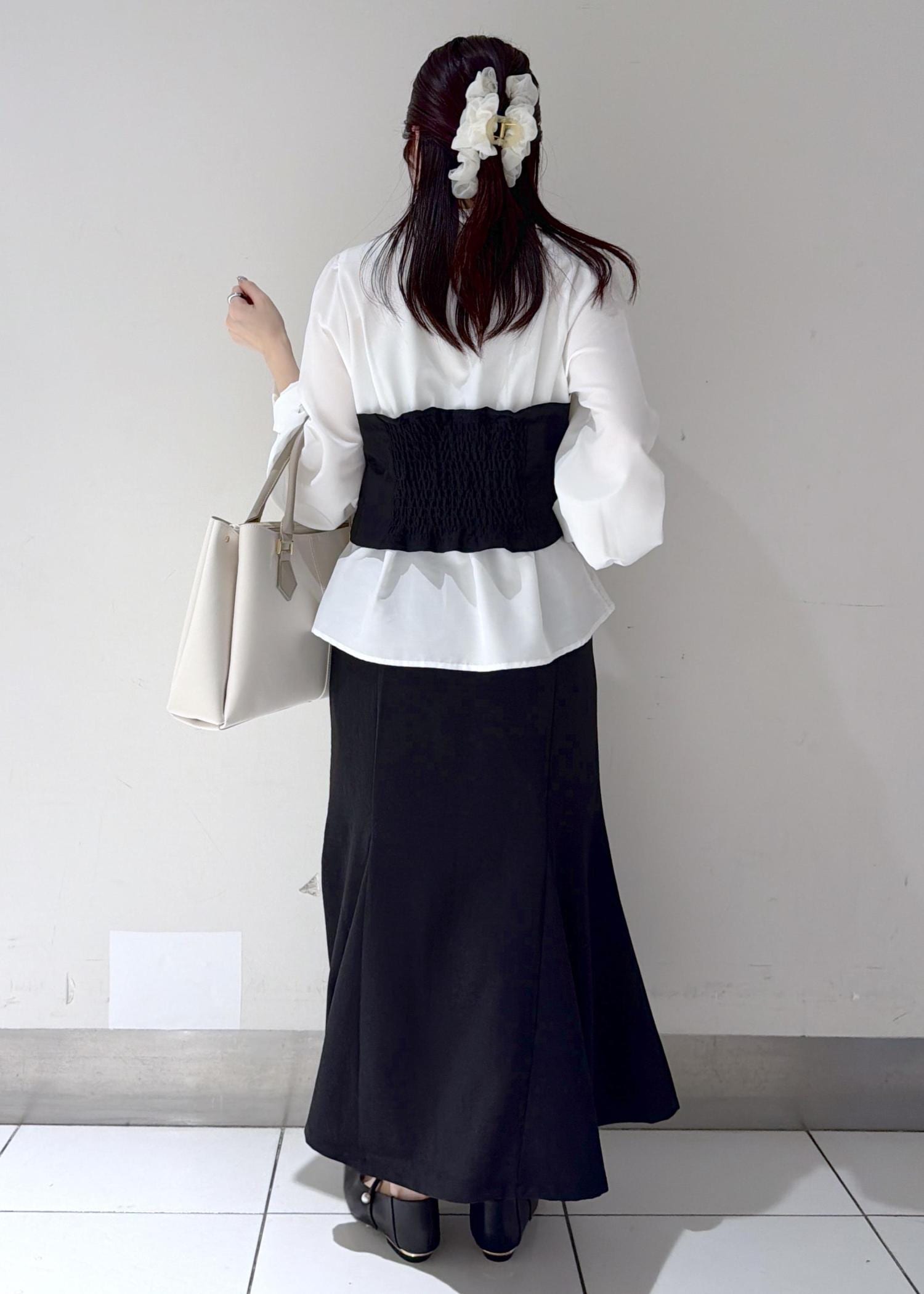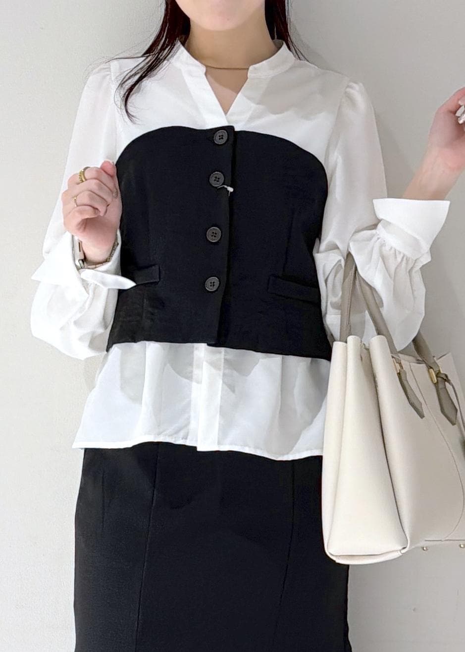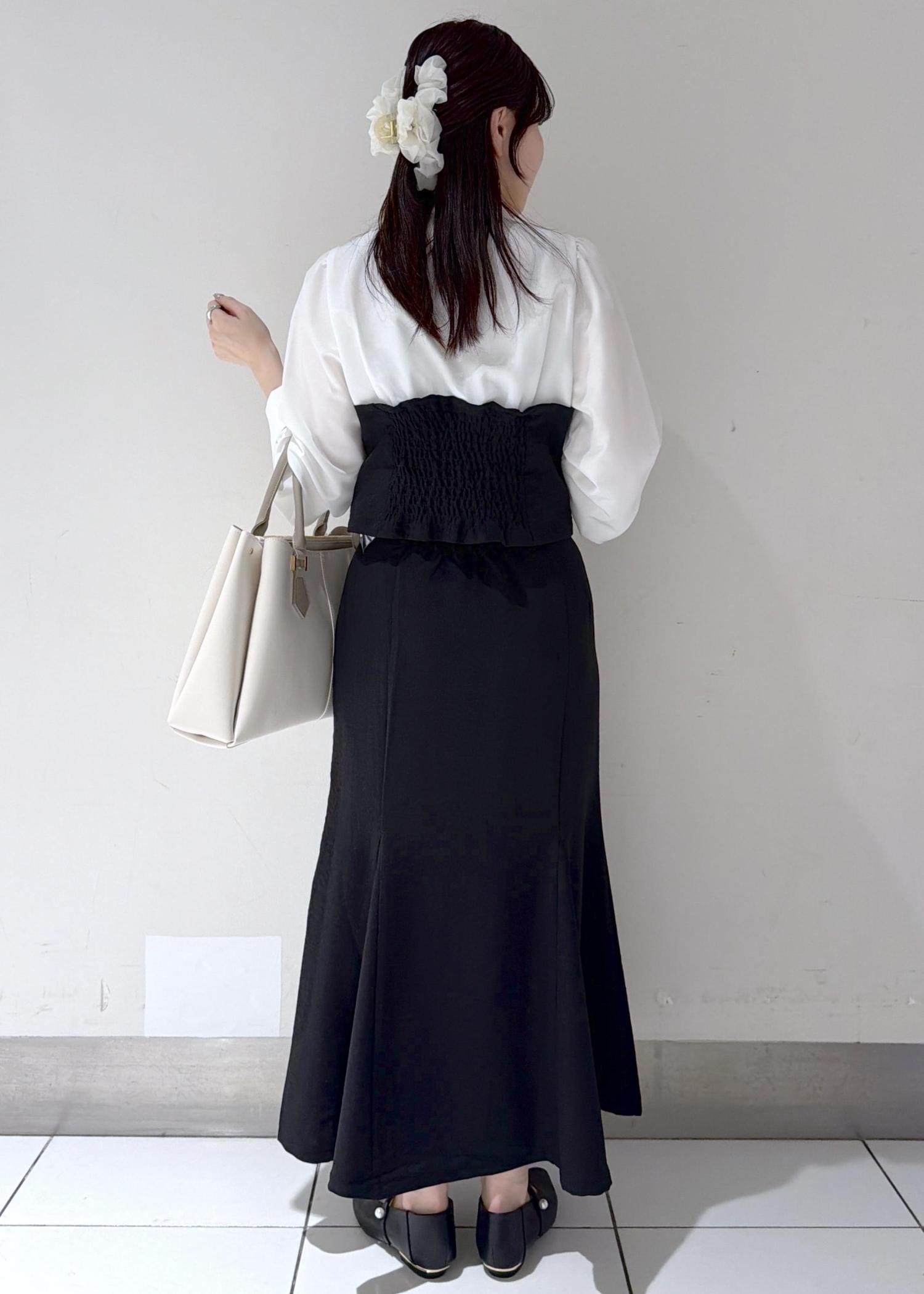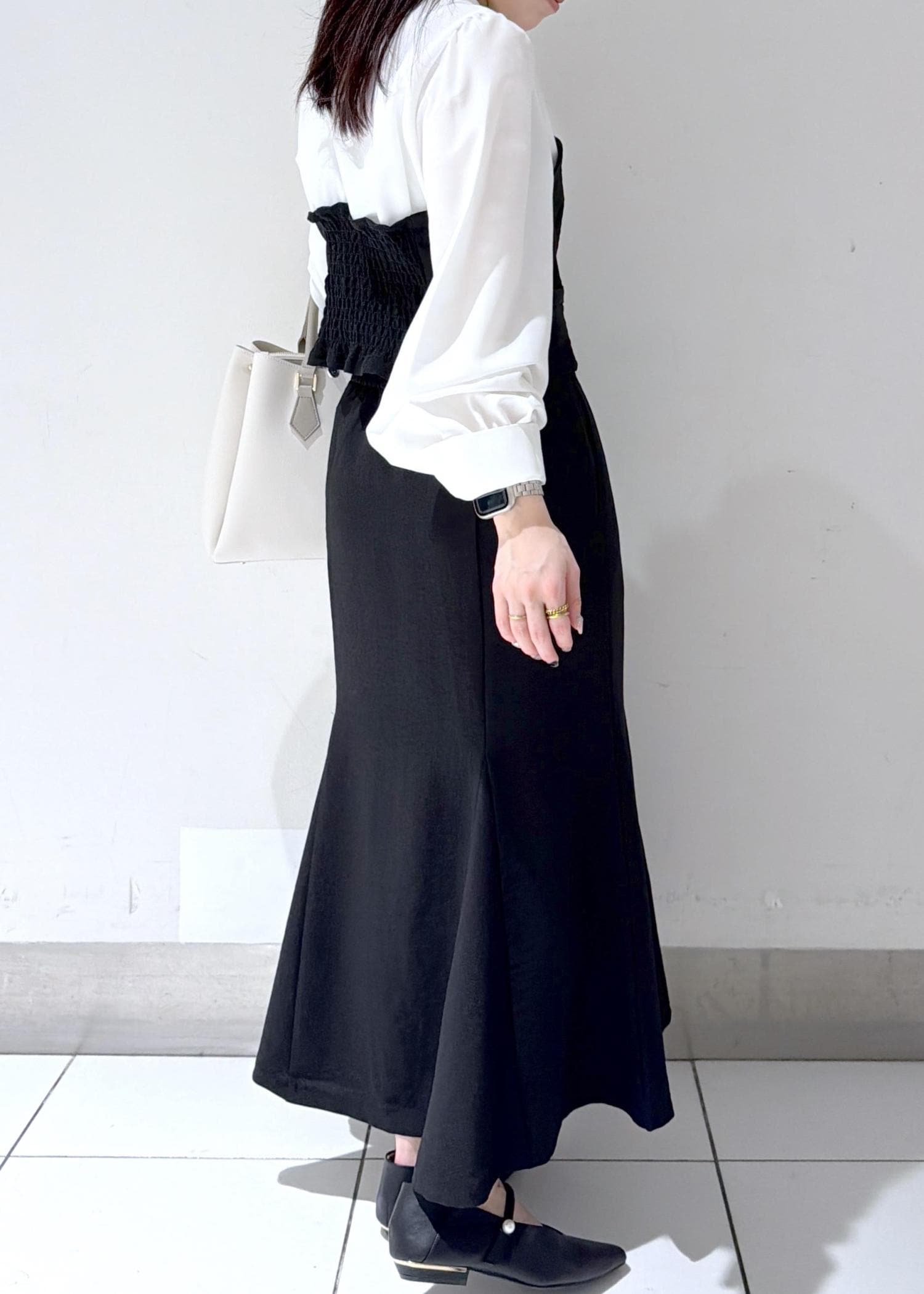 ウエスト位置を高く見せてくれるビスチェドッキングシャツと、すっきりとしたシルエットのスカートでスタイルアップ効果も◎