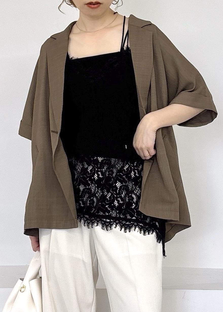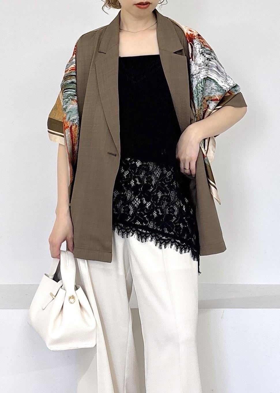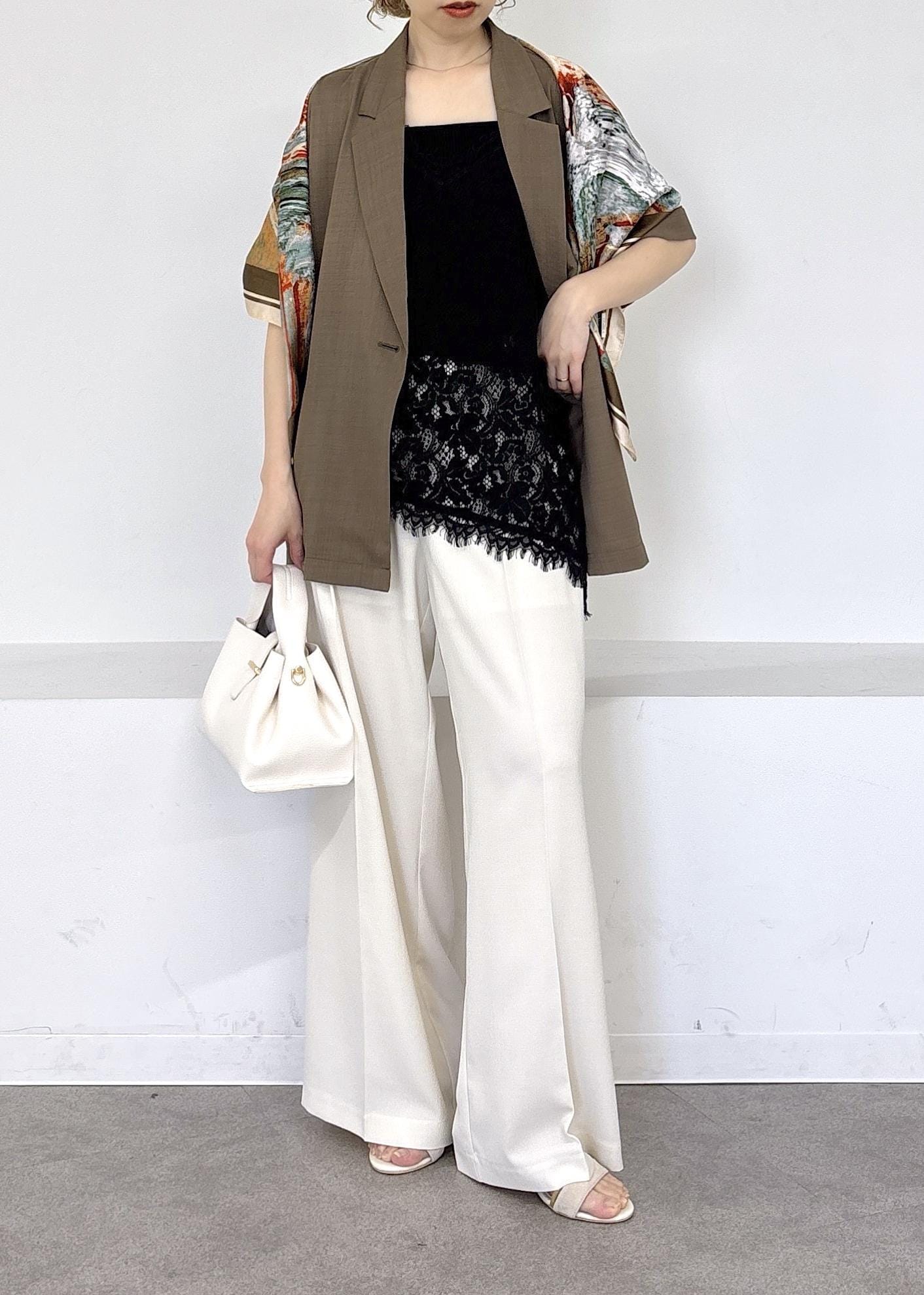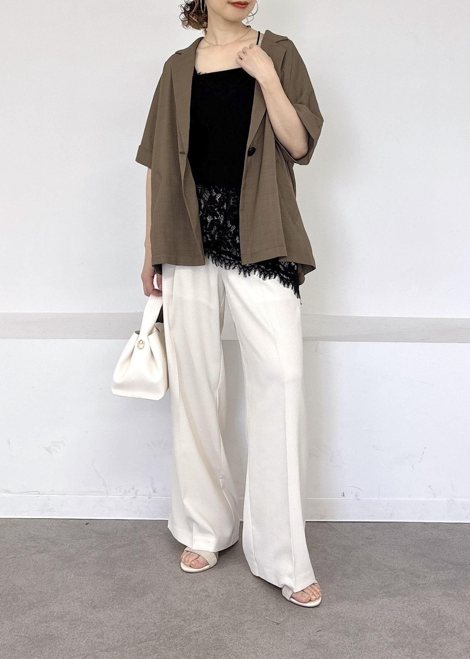 さらっと羽織れるAiryシリーズのジャケット、パンツは今日みたいな汗ばむ気温に最適♪締め付けすぎないシルエットなのでとても着やすく、レーストップスをあわせることで今年らしいトレンドスタイルに◎春夏オススメの大人カジュアルコーデ。