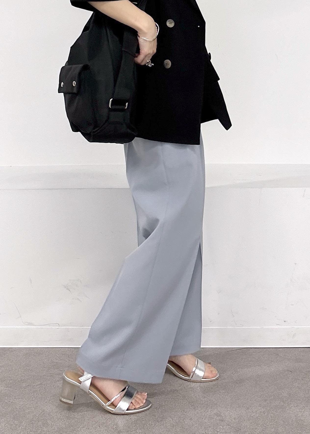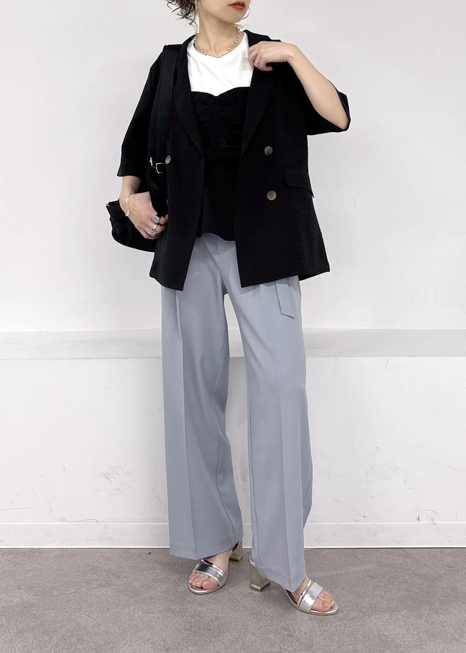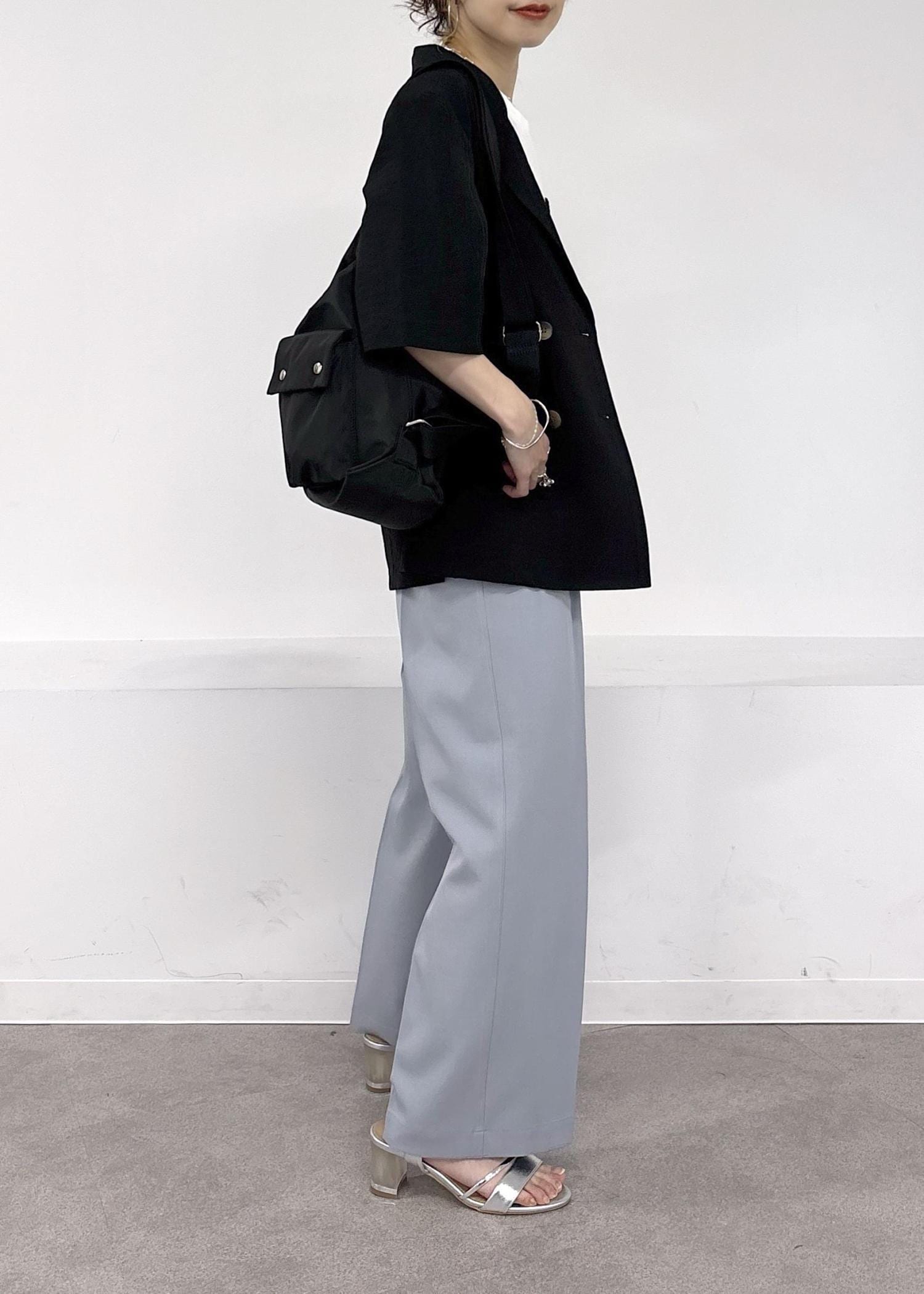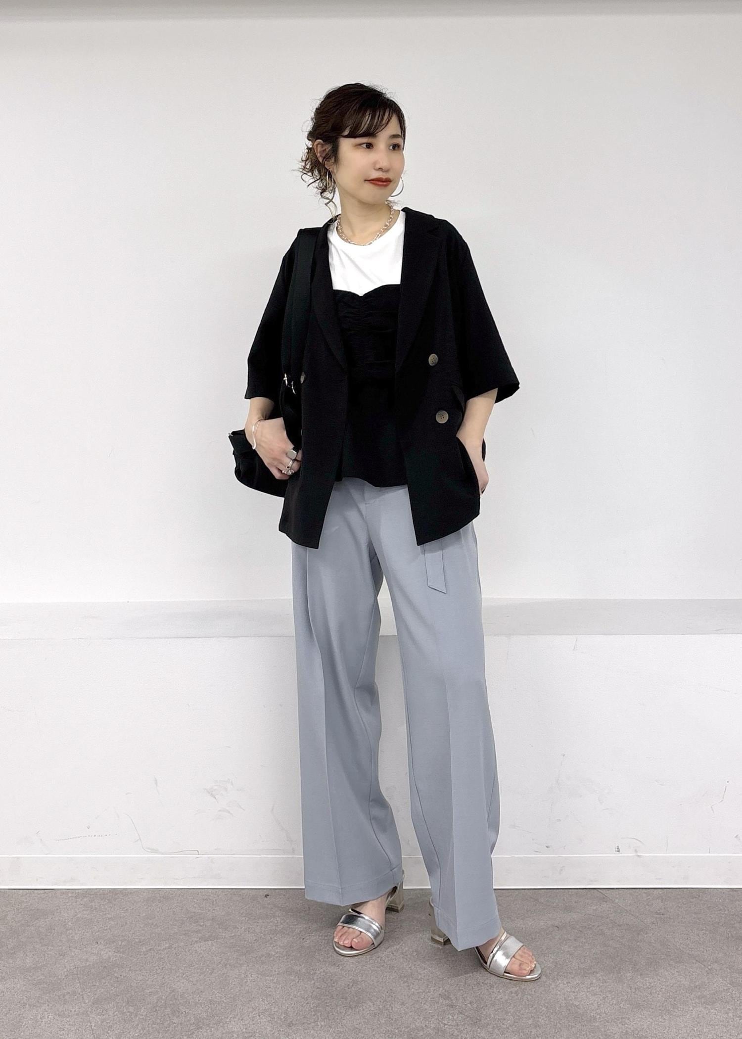 お仕事も快適な着心地で夏まで長く着たい方へオススメ♪接触冷感機能が施されたジャケット×パンツのオフィスカジュアルスタイルです。重く見えがちなブラックは爽やかなサックスブルーと合わせることで一気に夏らしく。今年っぽく通勤はリュックでまとめました◎