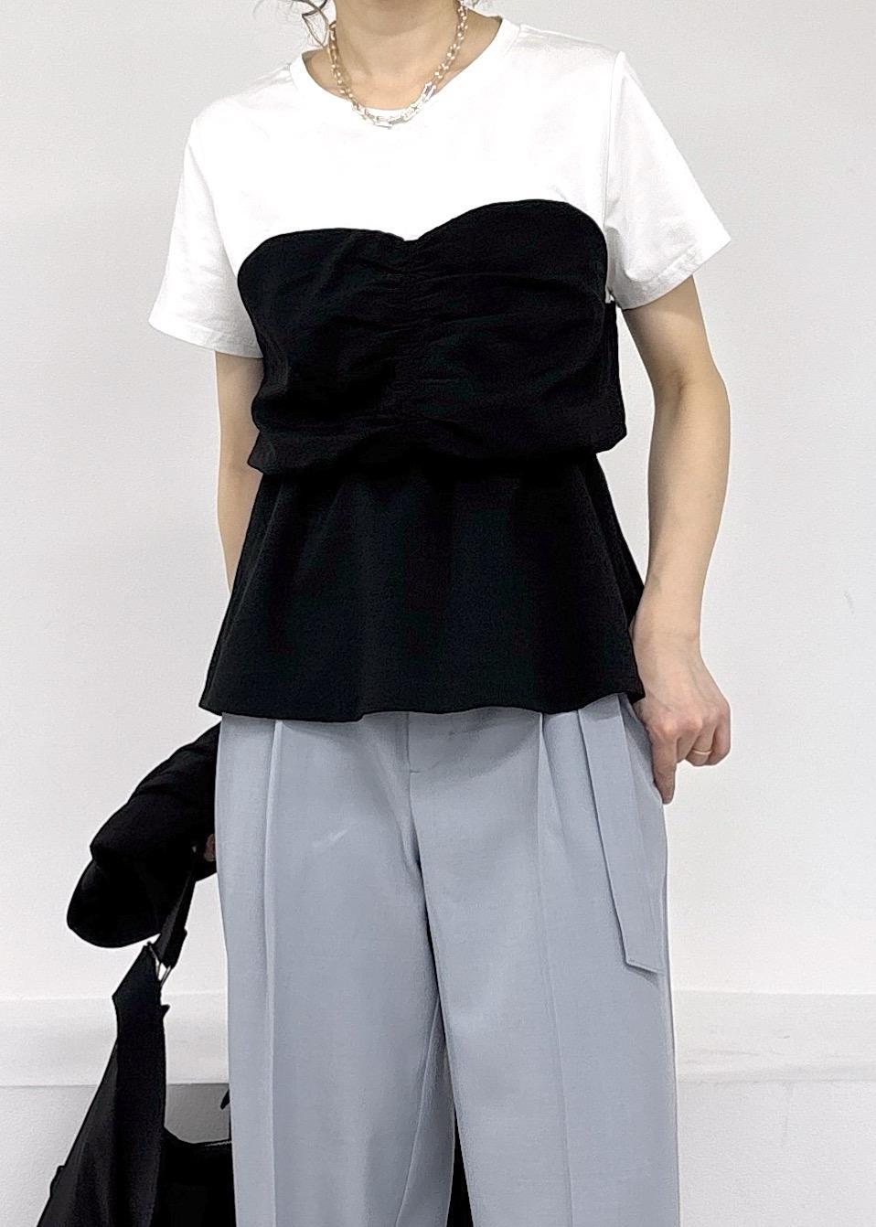 人気シリーズ、美easyのWEB限定トップス♪ドッキング仕様、ビスチェ部分はシャーリングデザインで大人可愛い印象に◎ペプラムシルエットがスタイルup見えするのもポイントです◎さらっとした着心地で軽く、とても着やすい。全体的に程よくフィット、着丈は腰がしっかり隠れる長さでした。