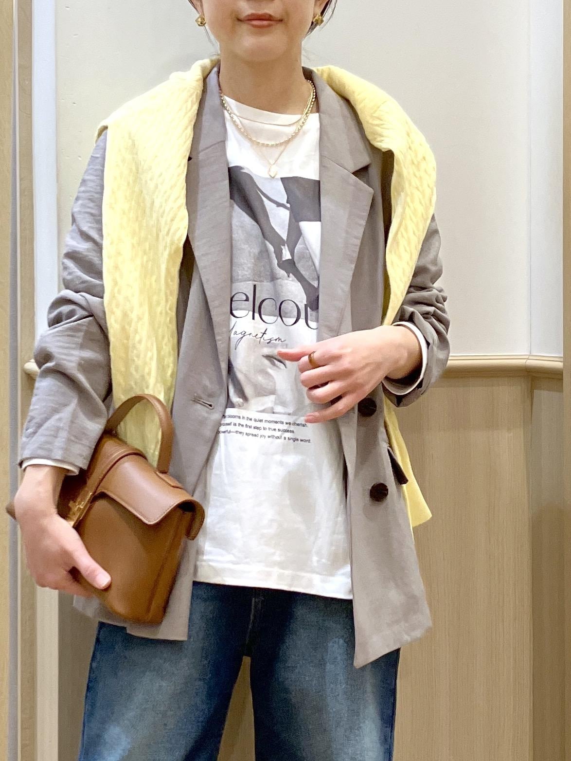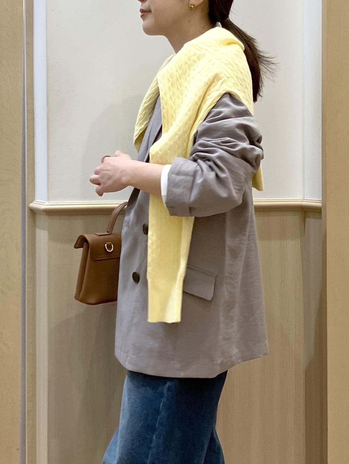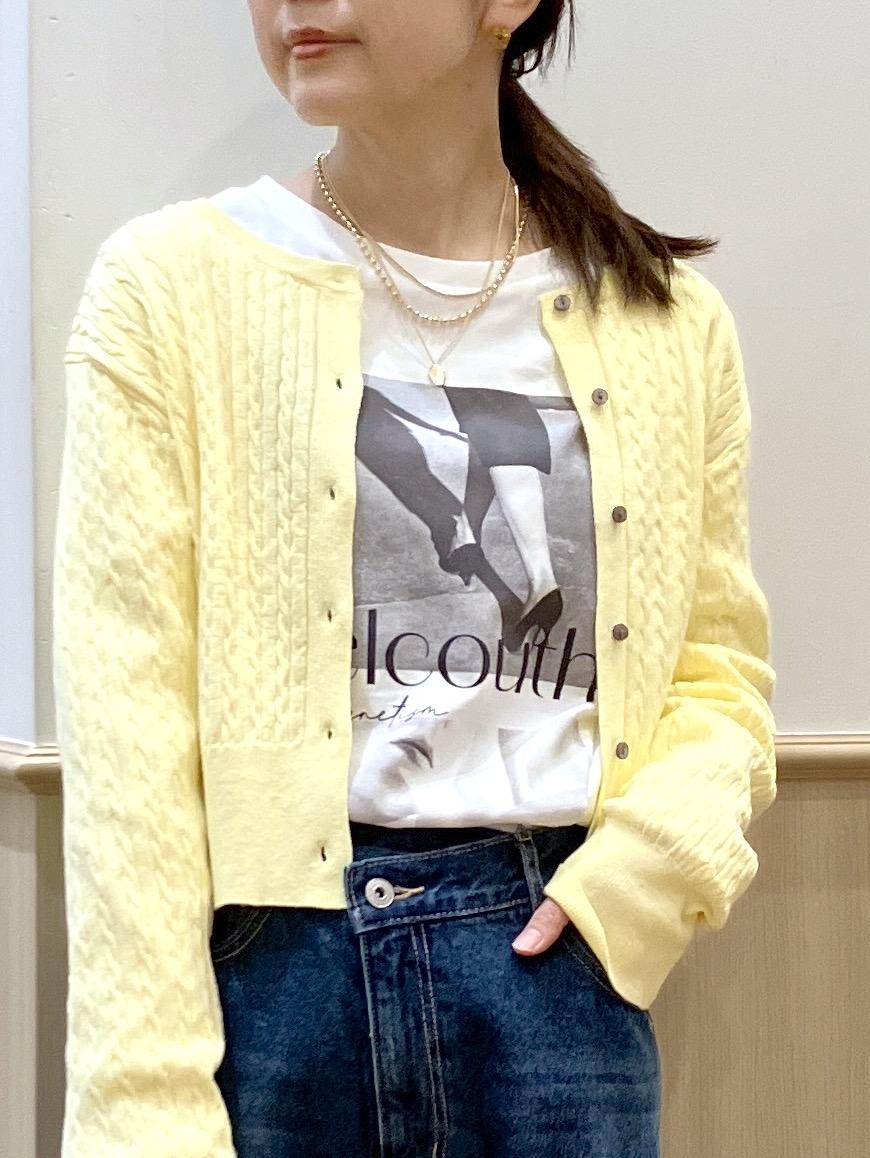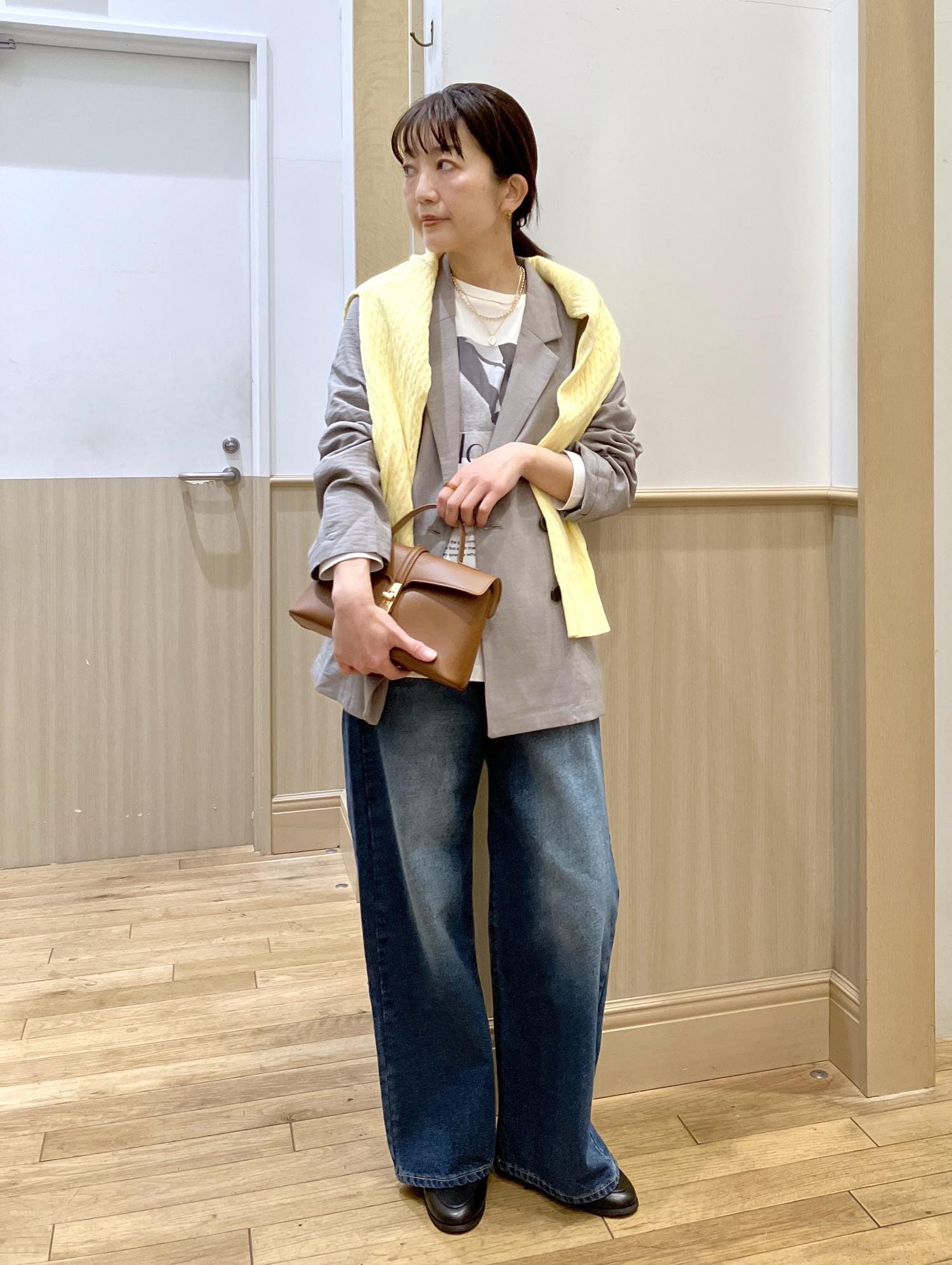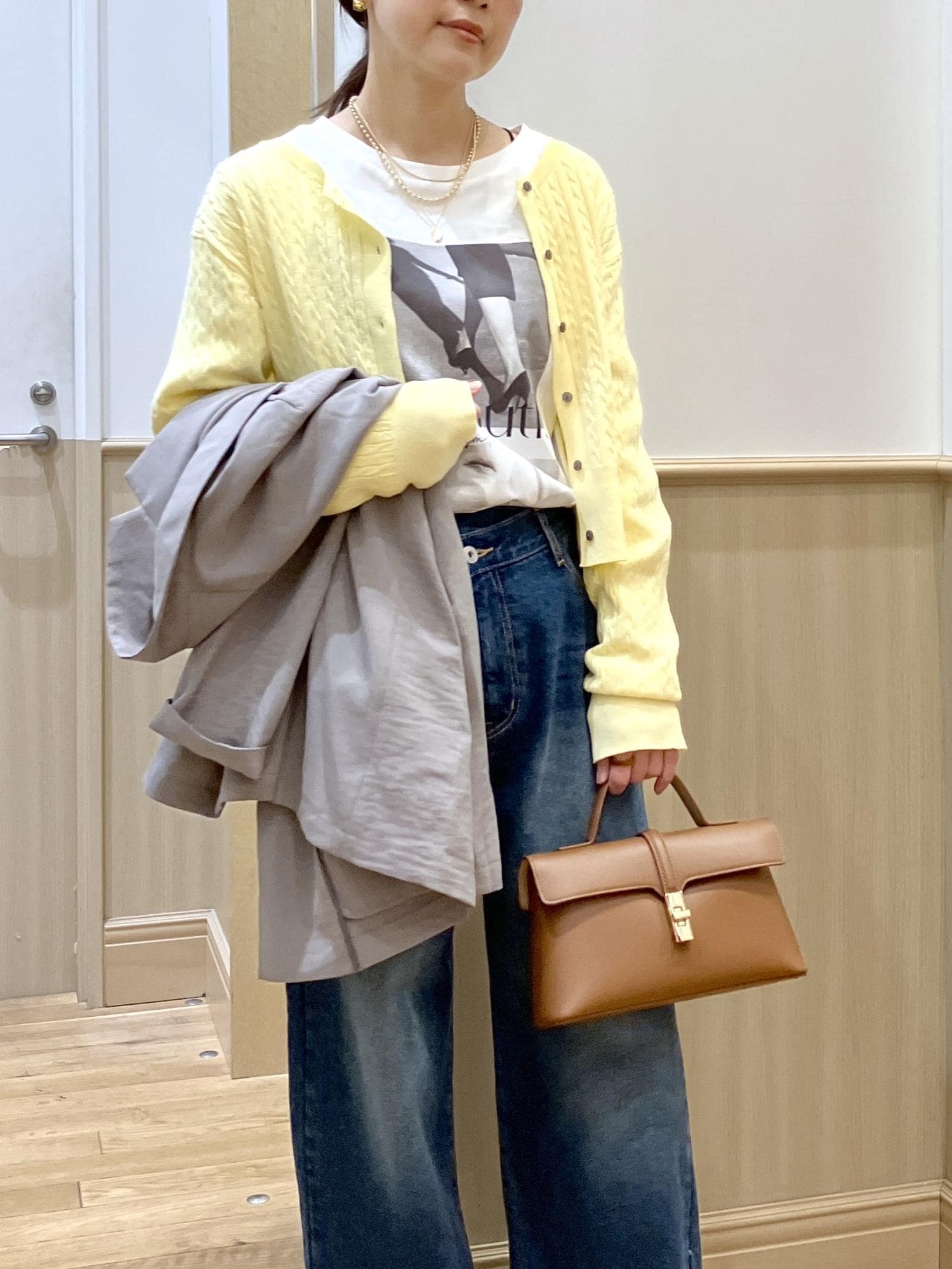 肩に掛けた黄色のカーデをポイントにした、シンプルなデニムstylingです。オシャレ感UPだけで無く、気温に応じてカーデを着たりもできるので気温変化のある春先に◎