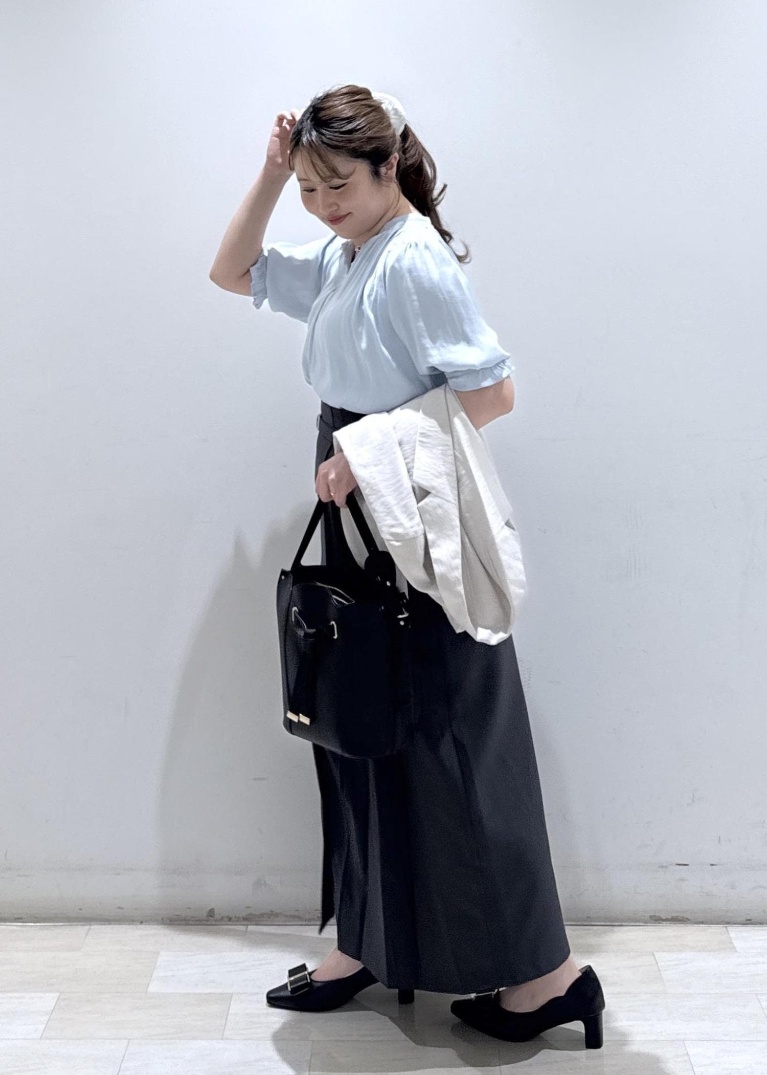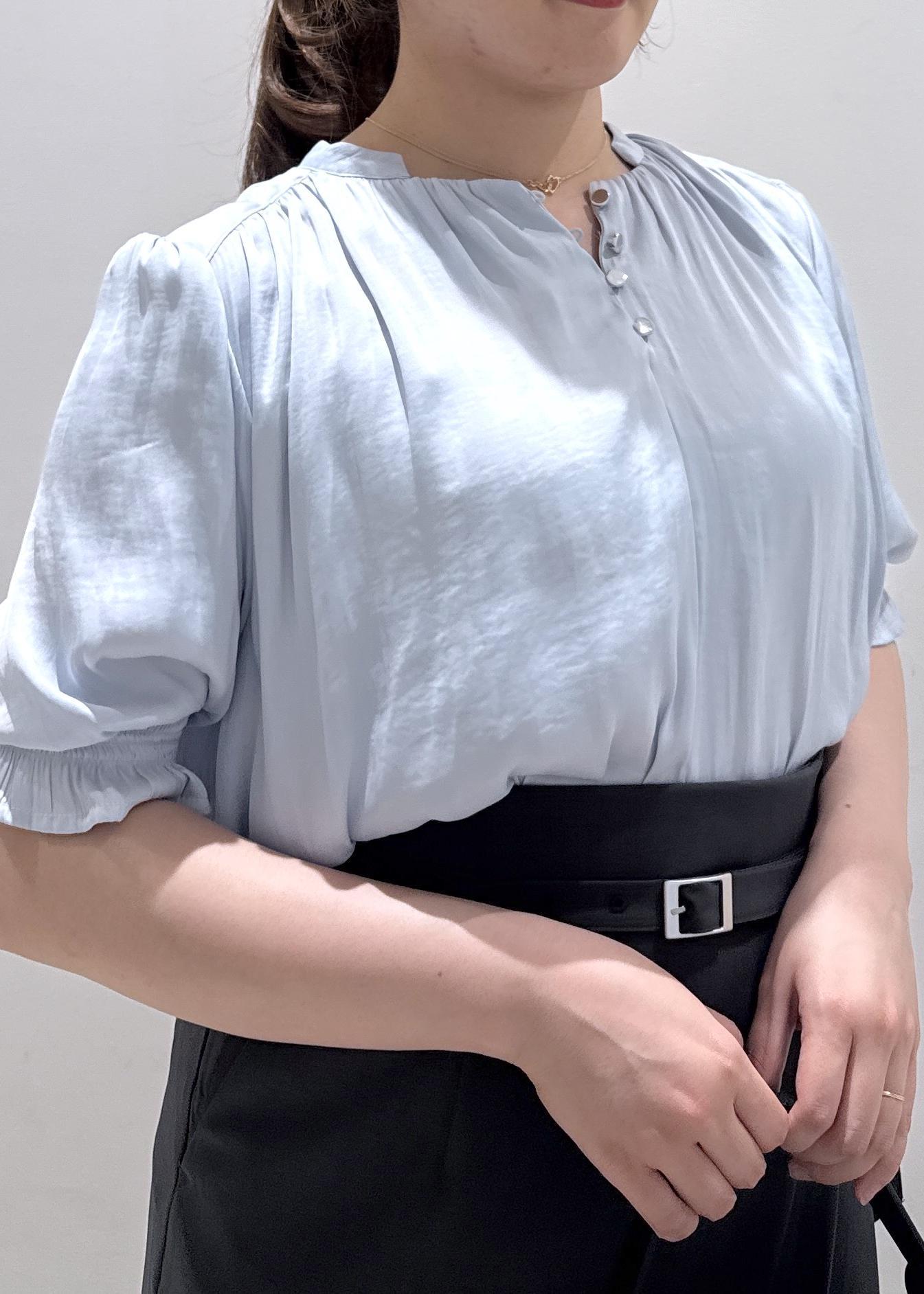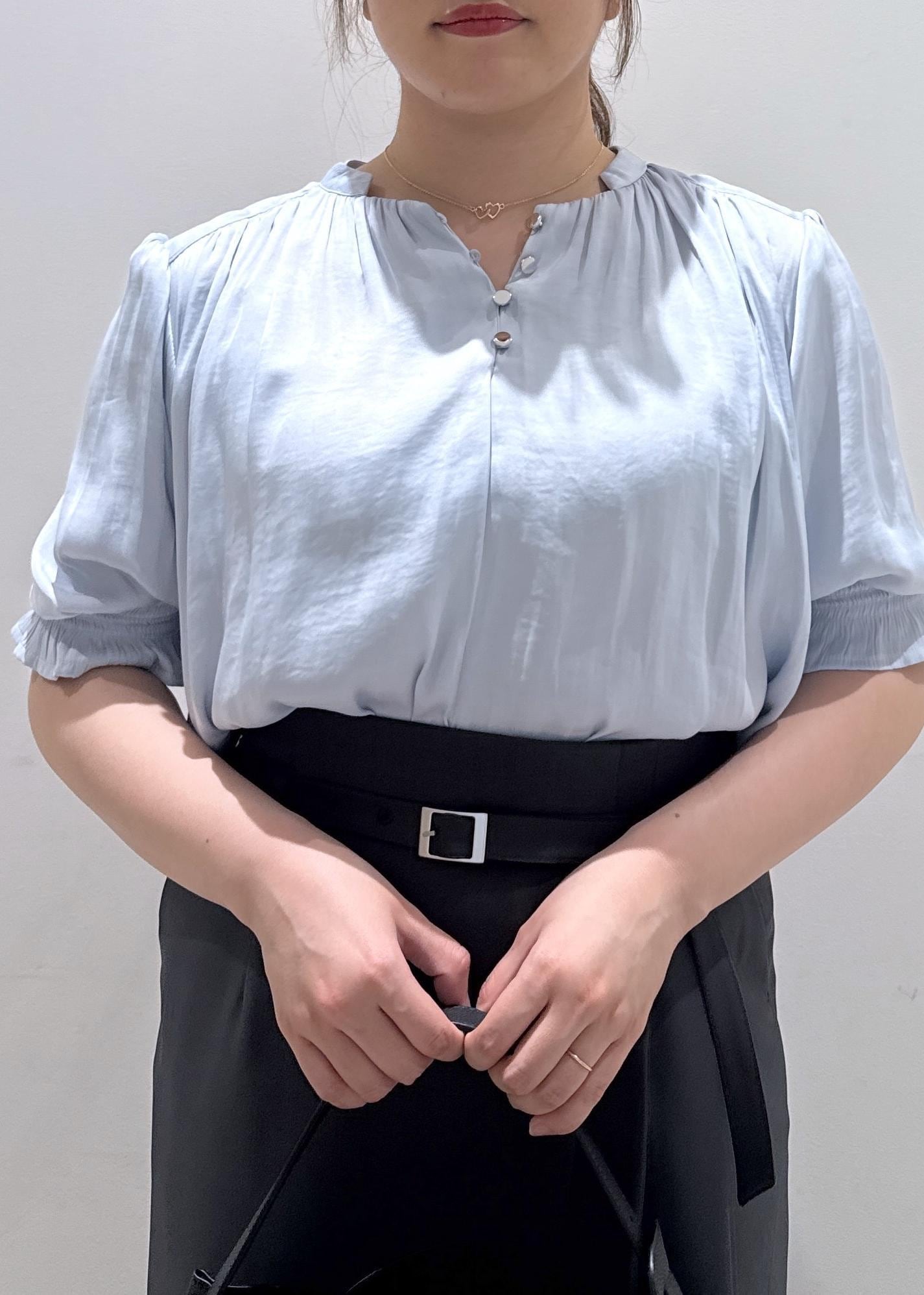 今回は新作で入荷しました、春夏に使える半袖のサテンブラウスにIラインのタイトスカートと合わせて綺麗めなコーディネートにしてみました。綺麗な色味のサックスブルーなので、肌の色もワントーン明るくなりますよ*