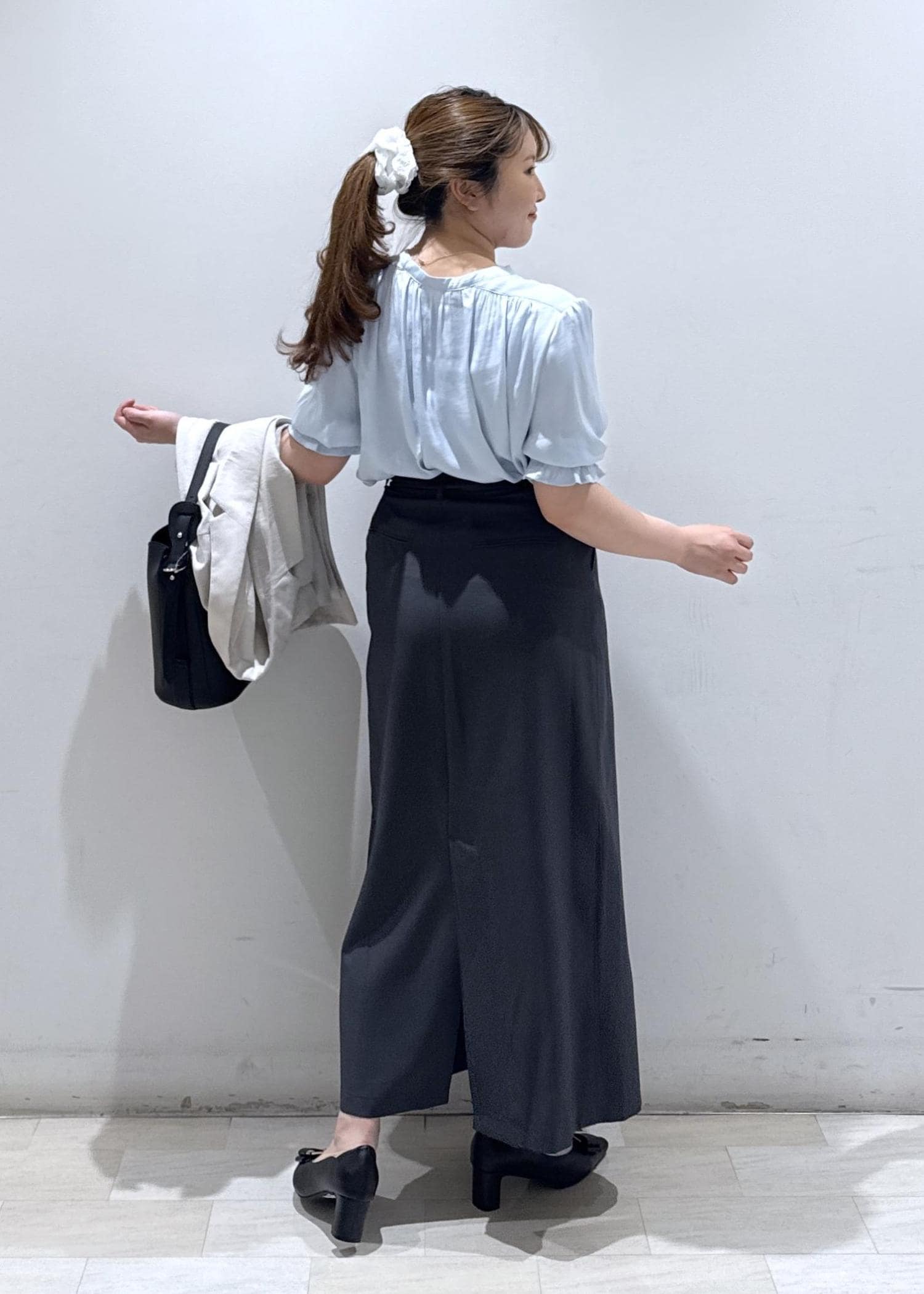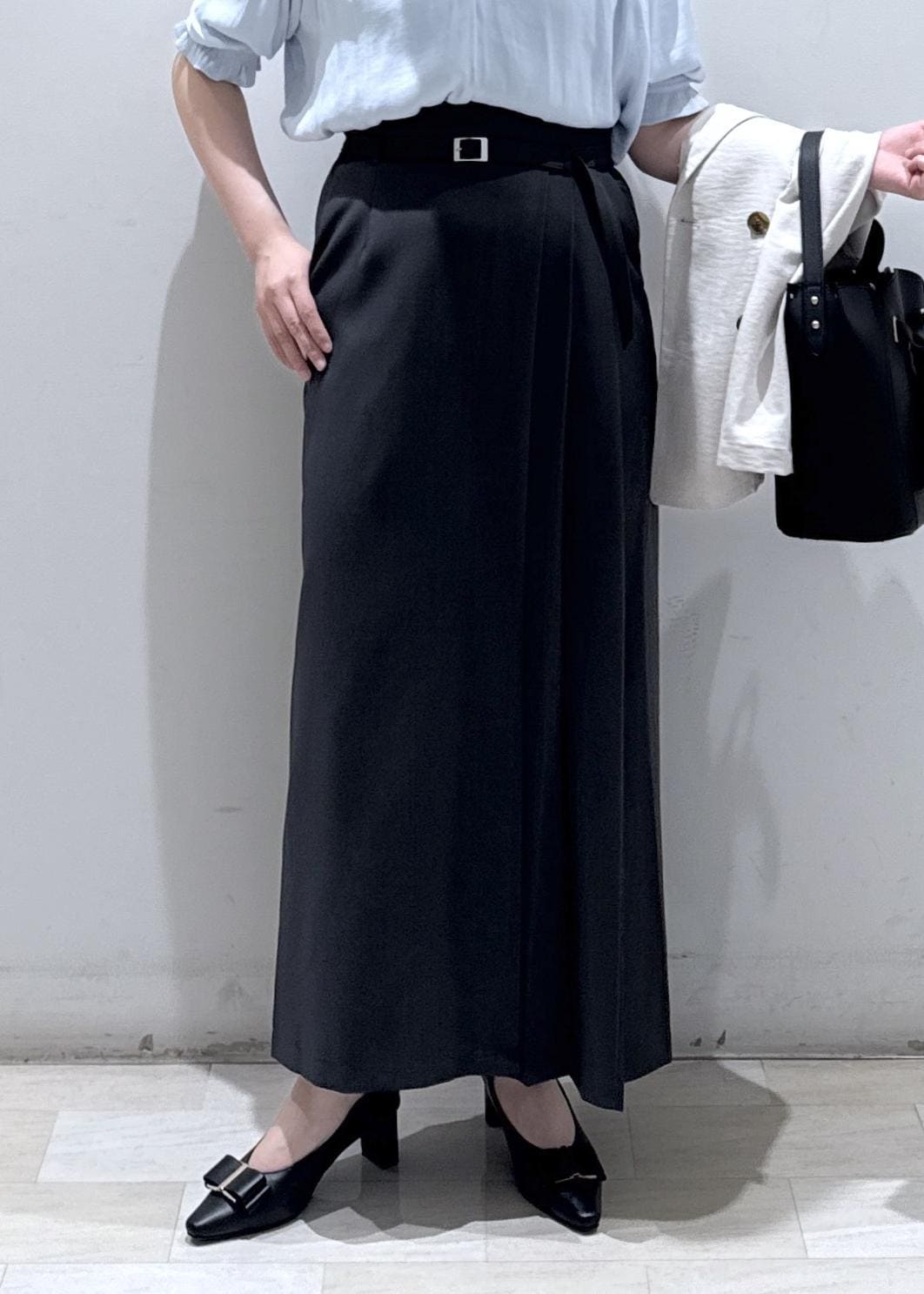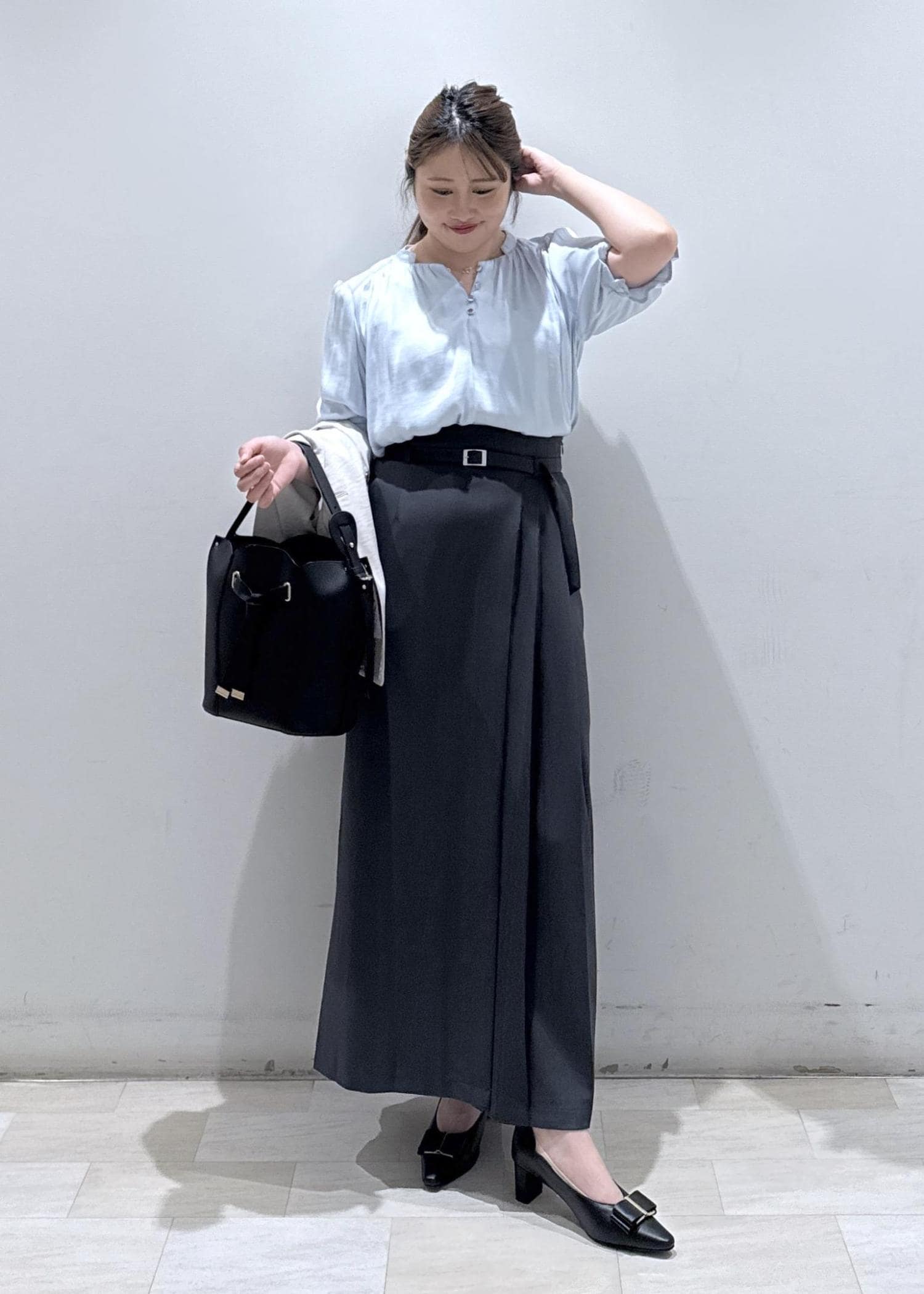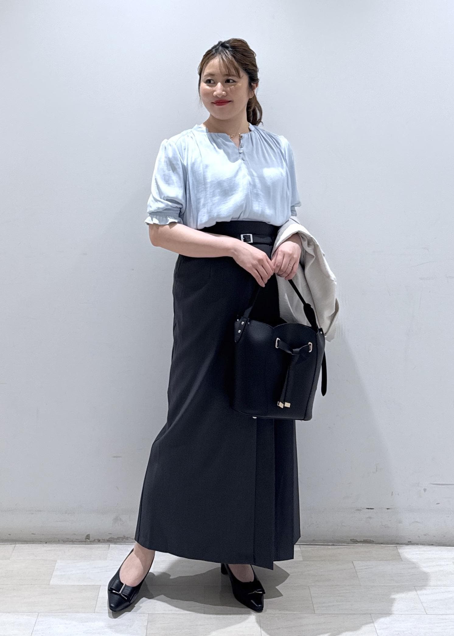 今回は新作で入荷しました、春夏に使える半袖のサテンブラウスにIラインのタイトスカートと合わせて綺麗めなコーディネートにしてみました。綺麗な色味のサックスブルーなので、肌の色もワントーン明るくなりますよ*