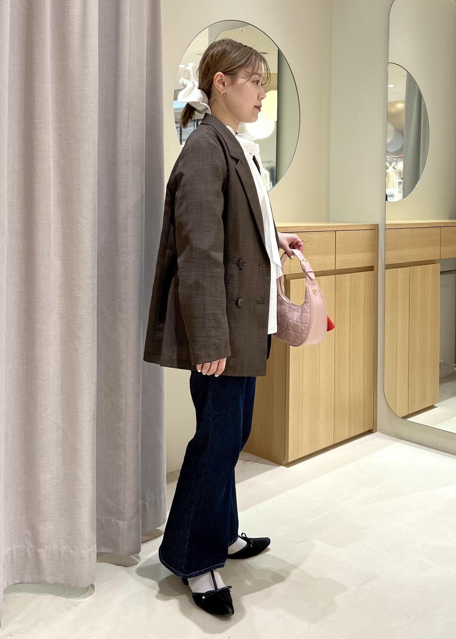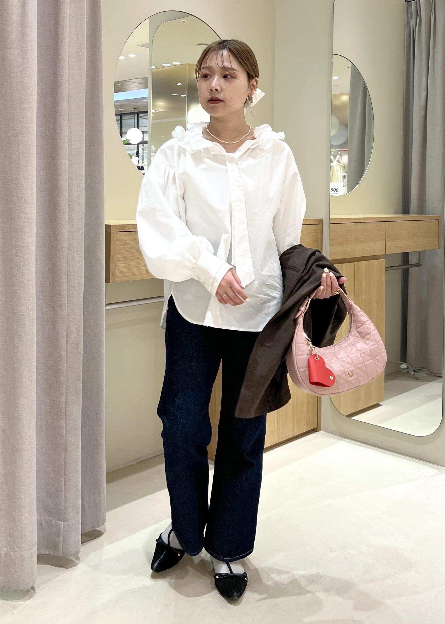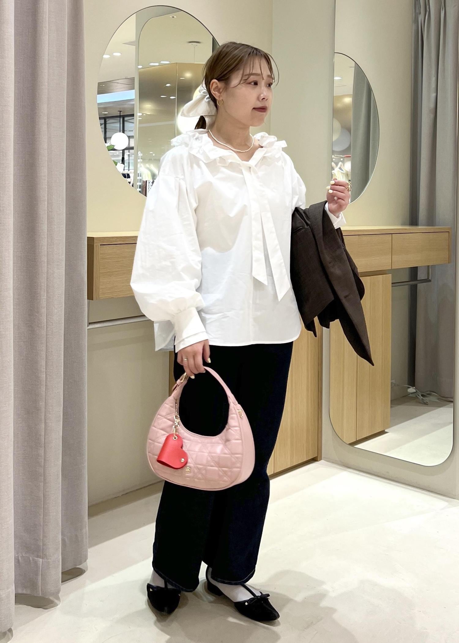 ジャケットを着ても脱いでも、可愛さを保てる春コーデにして見ました。バッグに差し色を入れて春っぽさをプラスです!