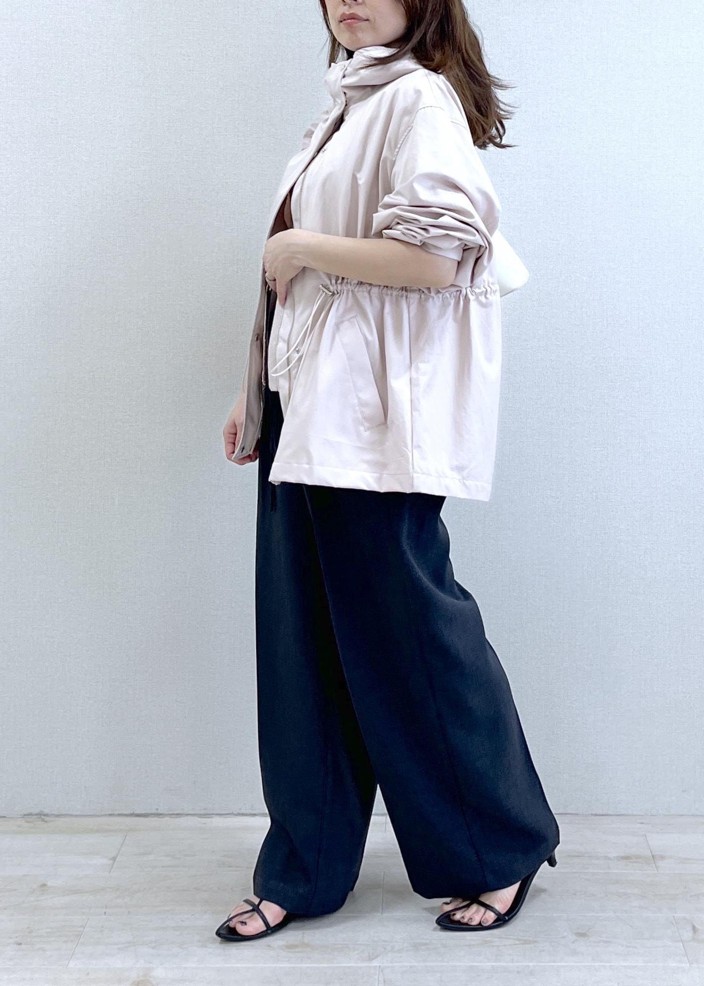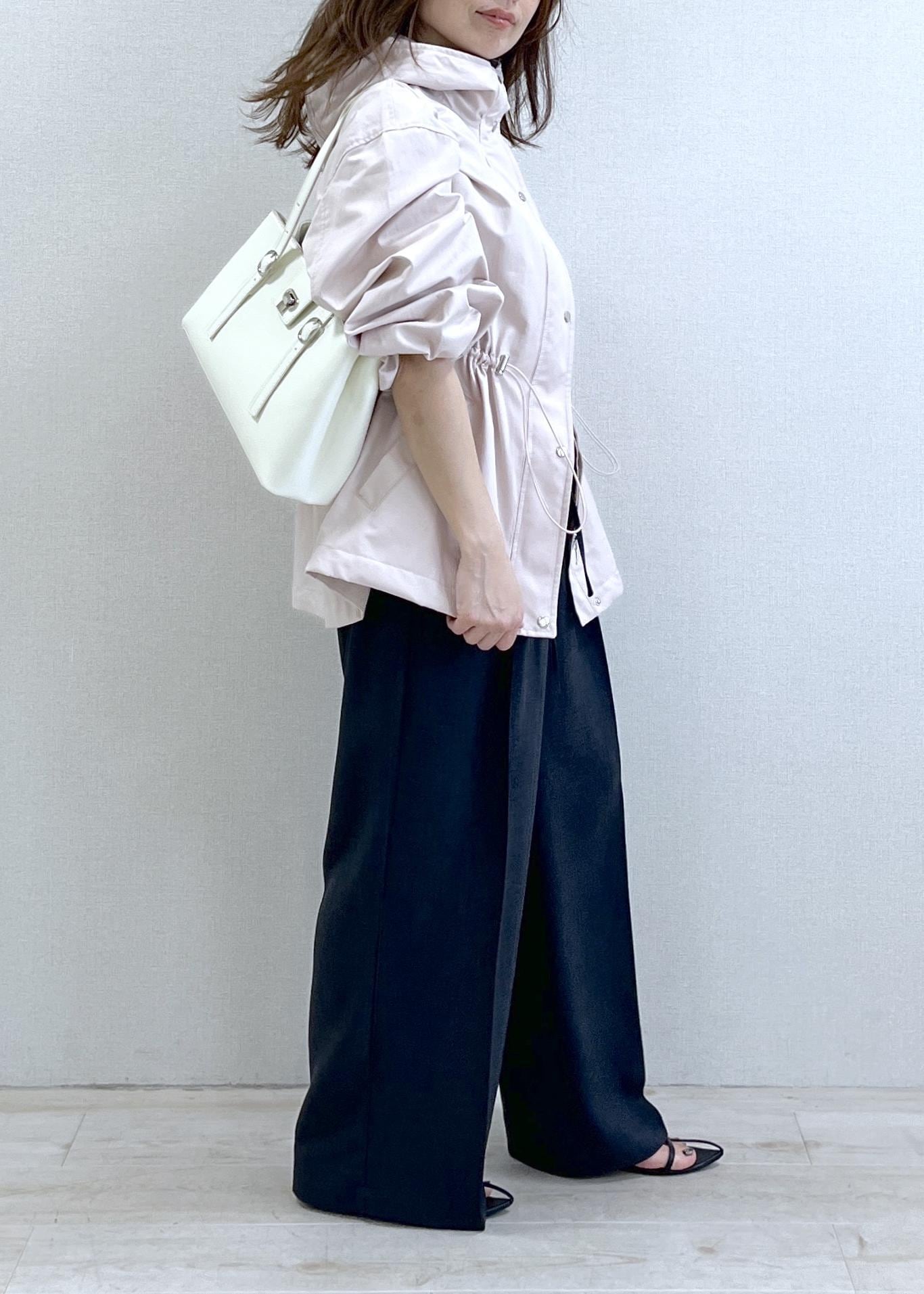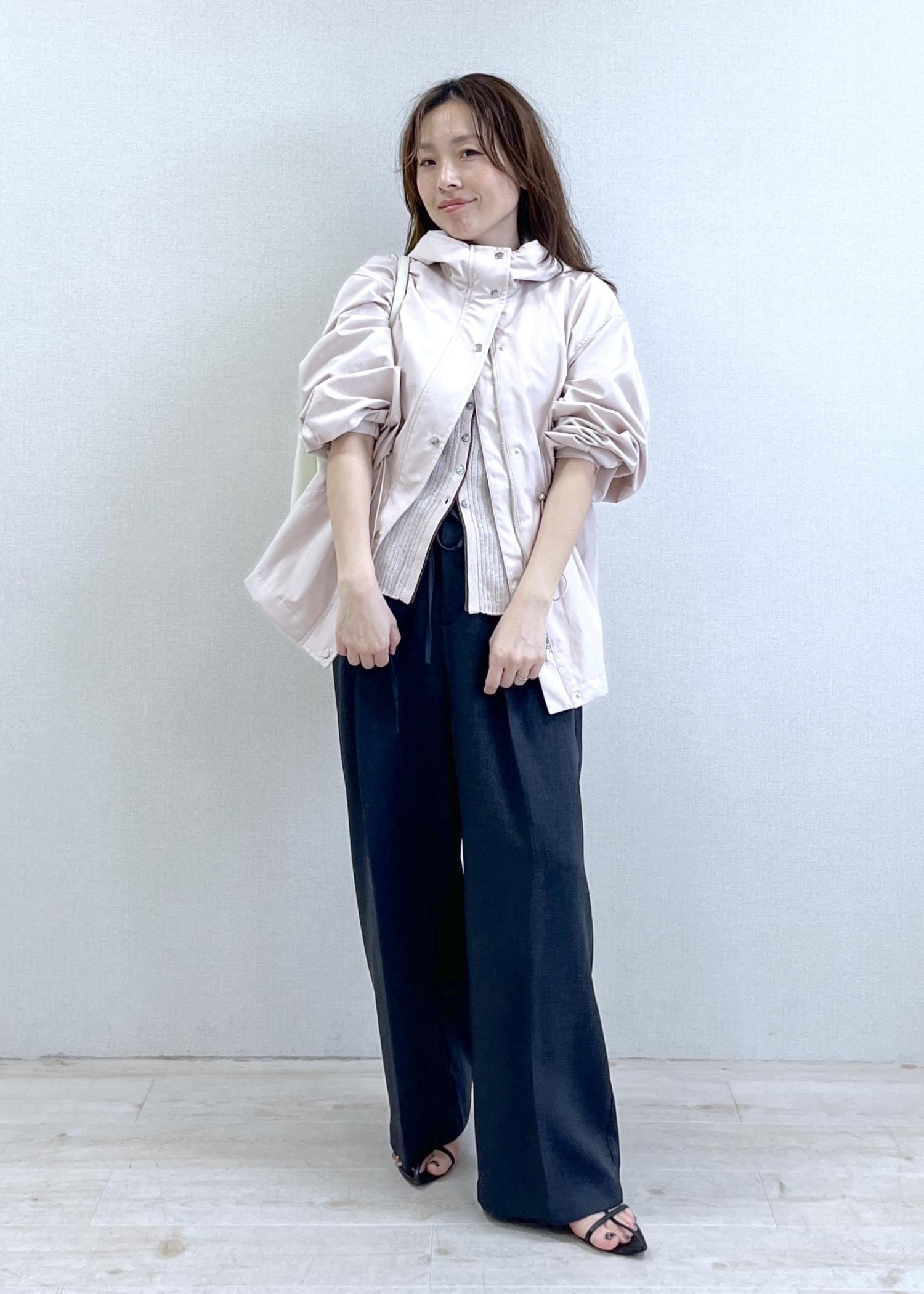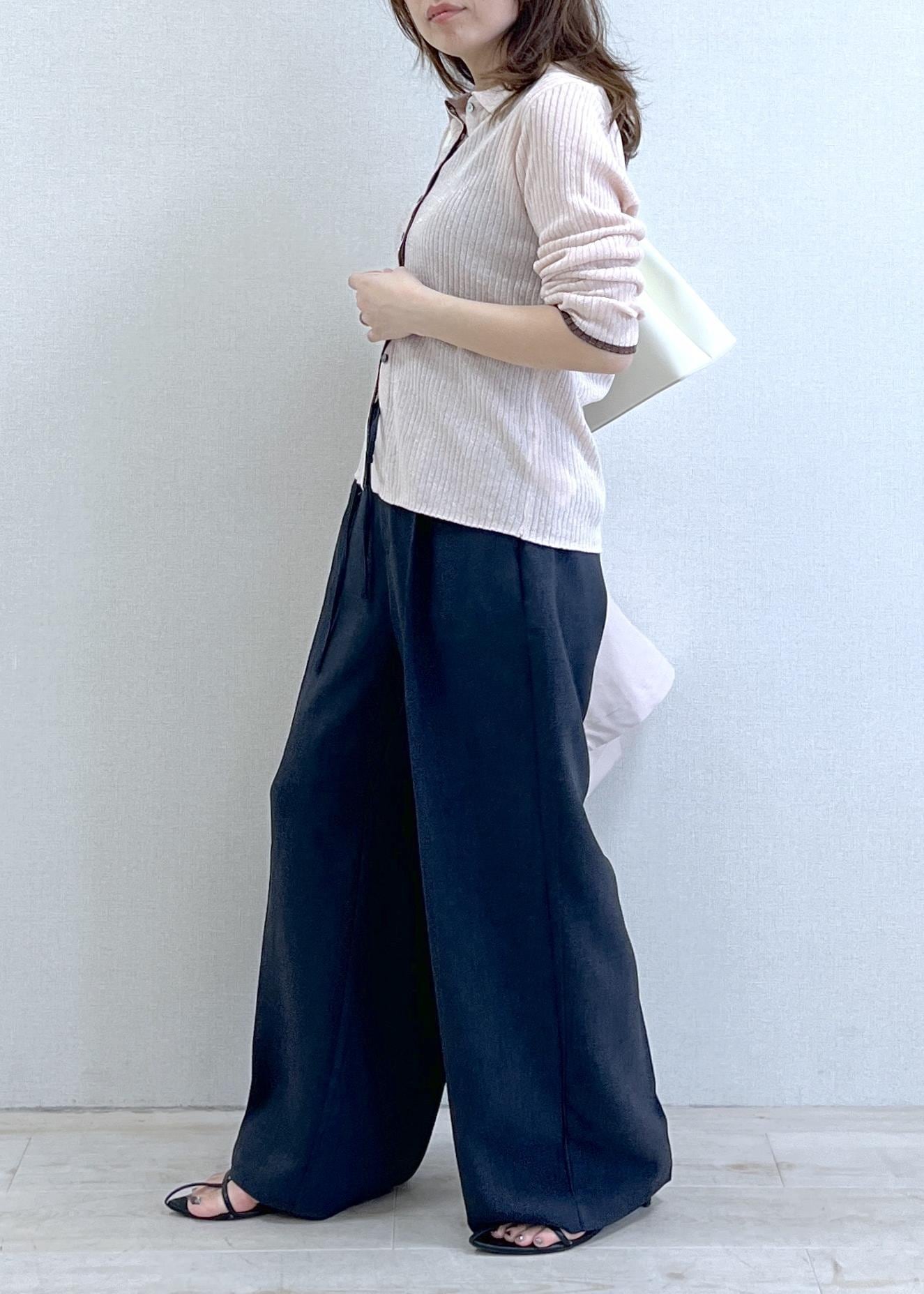 ワイドパンツ合わせで全体はゆるっとまとめつつ、