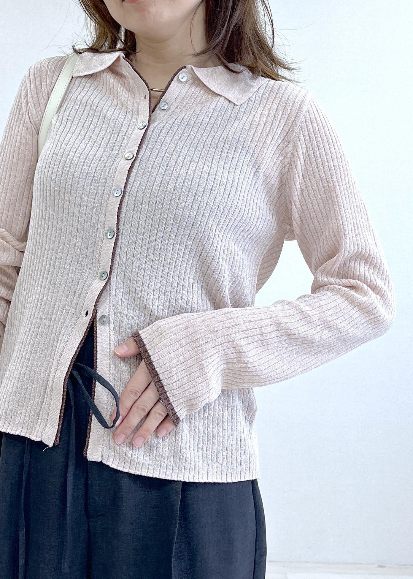VISポロ襟配色シアーリブカーディガン/イージーケアピンク / F¥6,589レビュー152cmでFサイズ着用し、着丈はお尻にかかるくらいの丈。程よいシアーニットは気温の安定しない時期におすすめです♪サイズ感はゆとりありで身体にフィットしすぎませんでした。さりげないラメ入りで表面感もあり◎