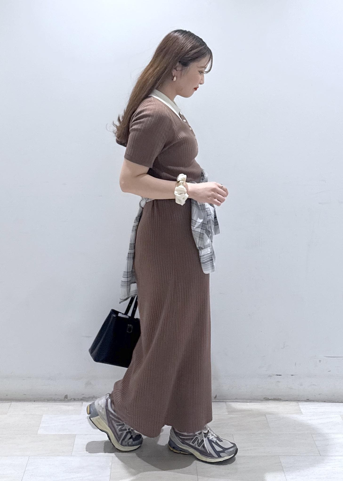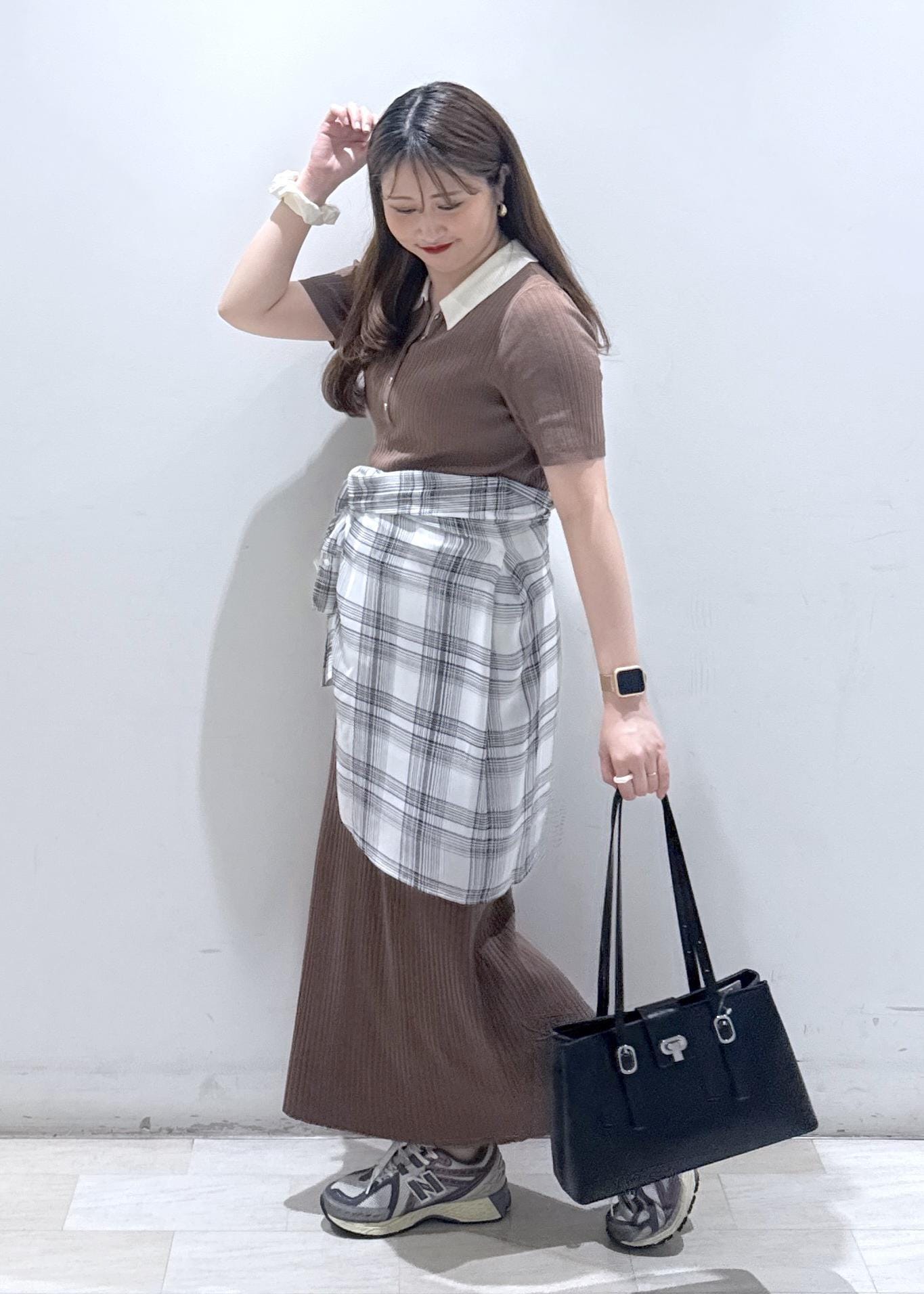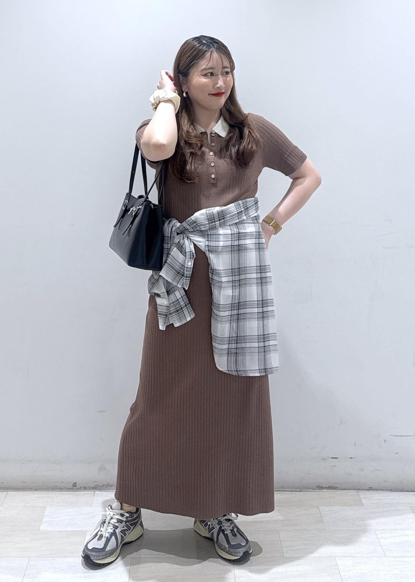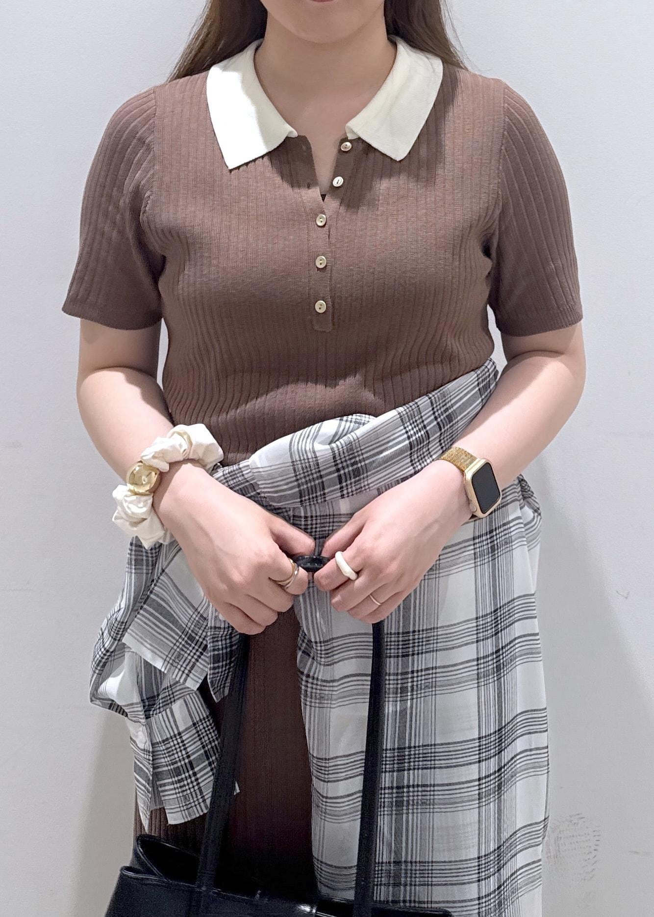今回は新作で入荷しました、襟ポロワンピースにチェック柄のシャツを腰巻きにして体型カバーを隠しつつスッキリとしたコーディネートにしました。休日のどこかお出掛けの日にぜひ着ていただきたいワンピースです