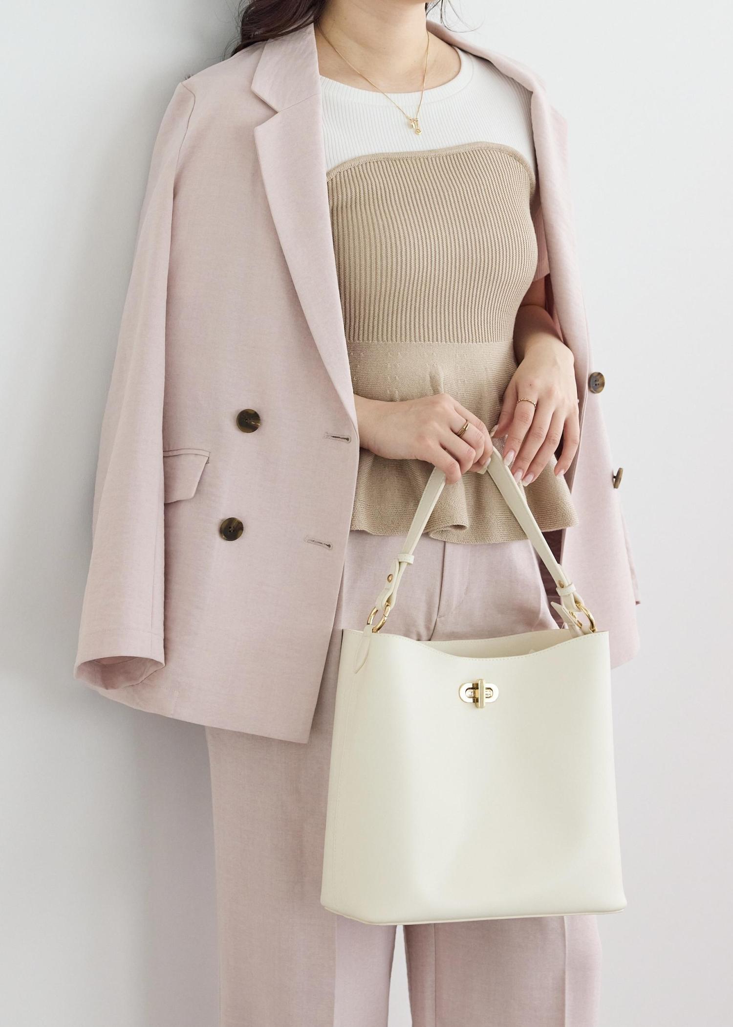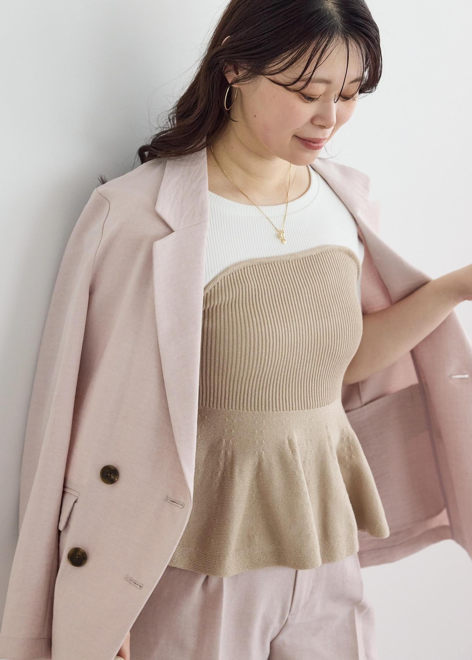 ピンクカラーのジャケットとセットアップ対応のワイドパンツに、インナーはドッキングのトップスで上品に。
