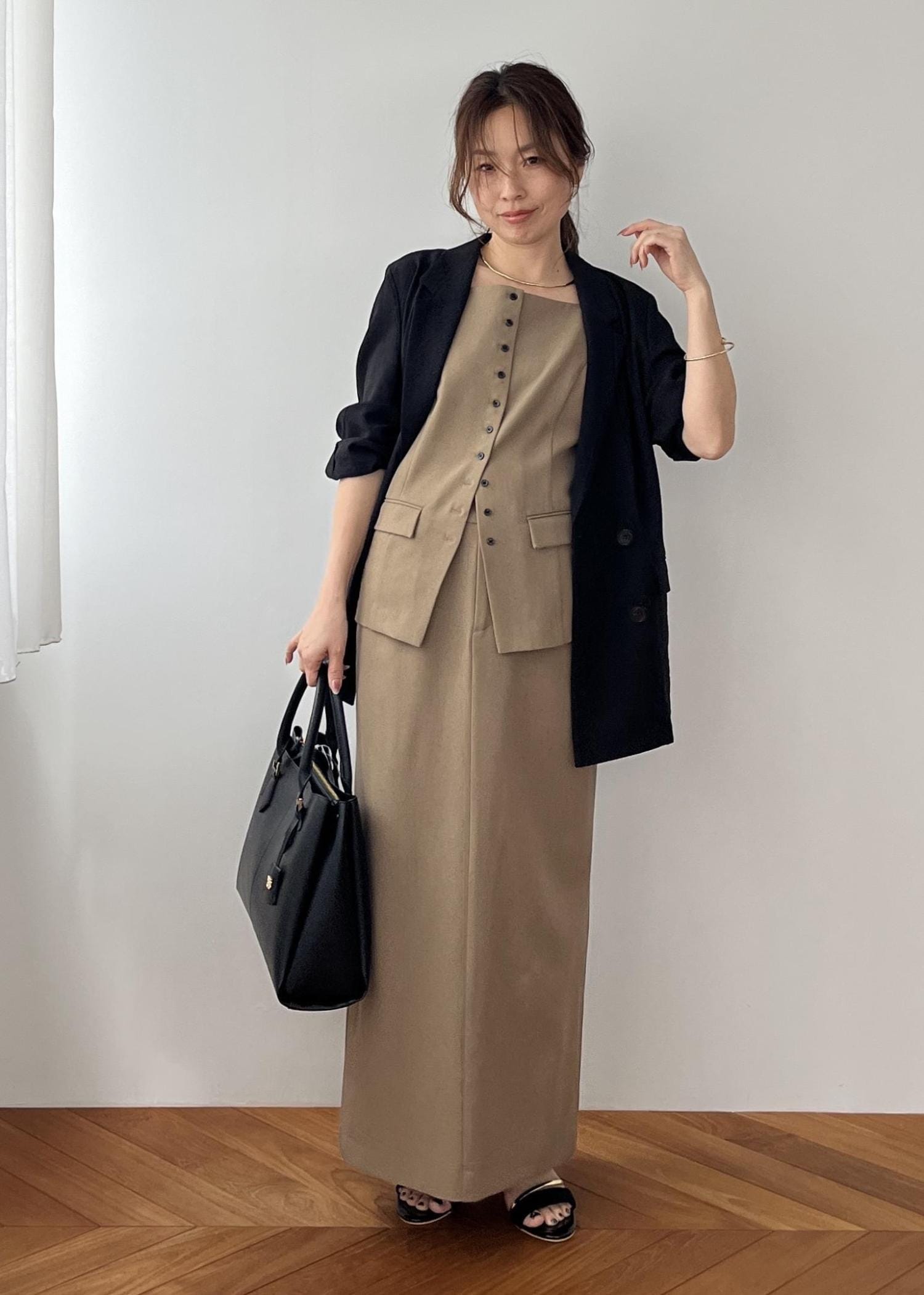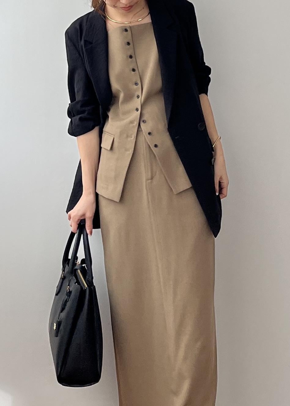 Iラインのワンピを合わせた大人コーデ
