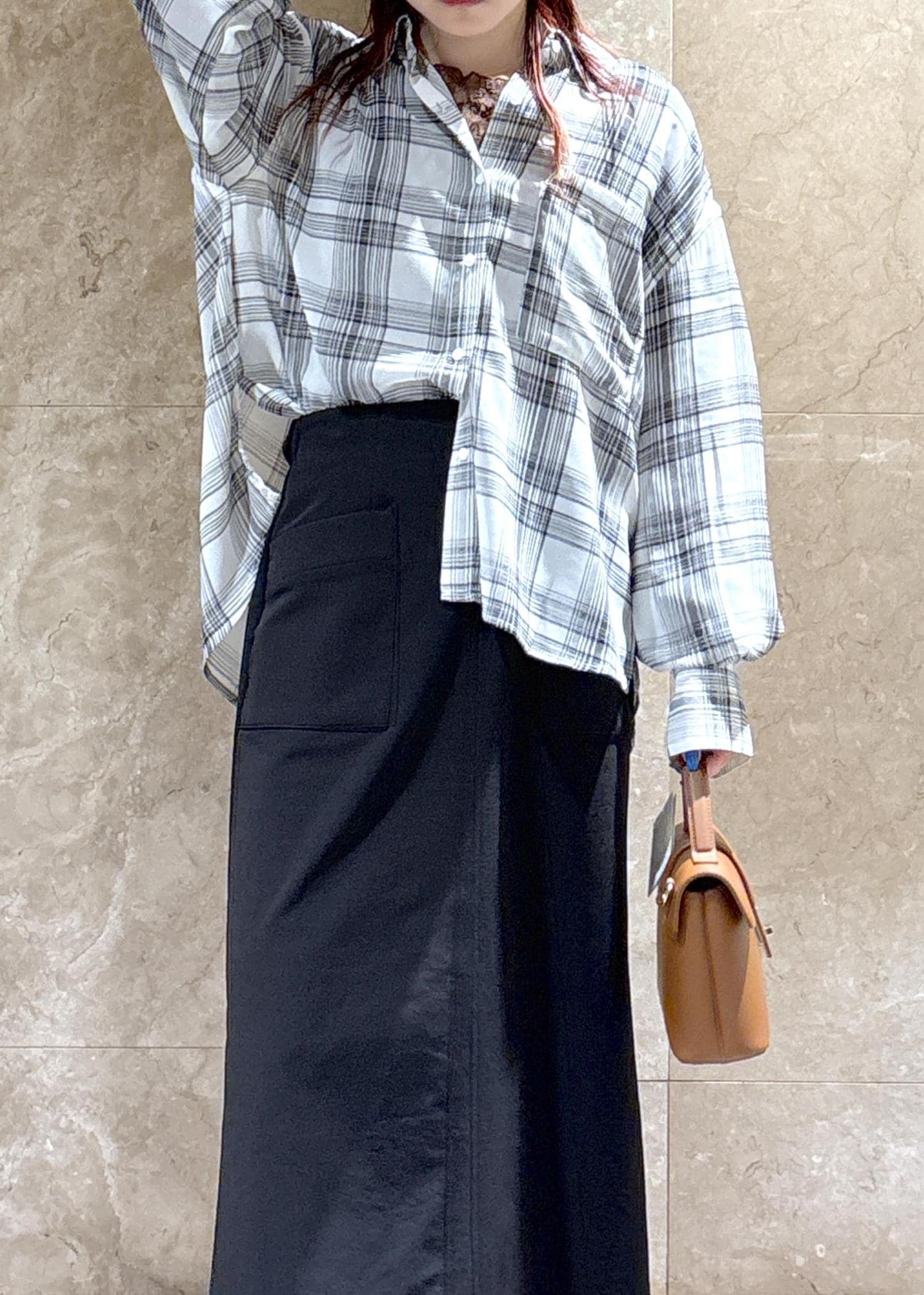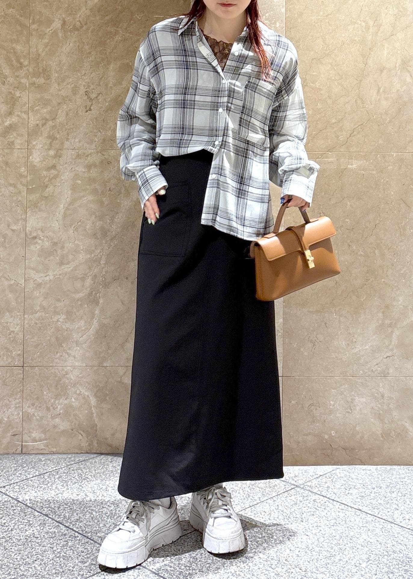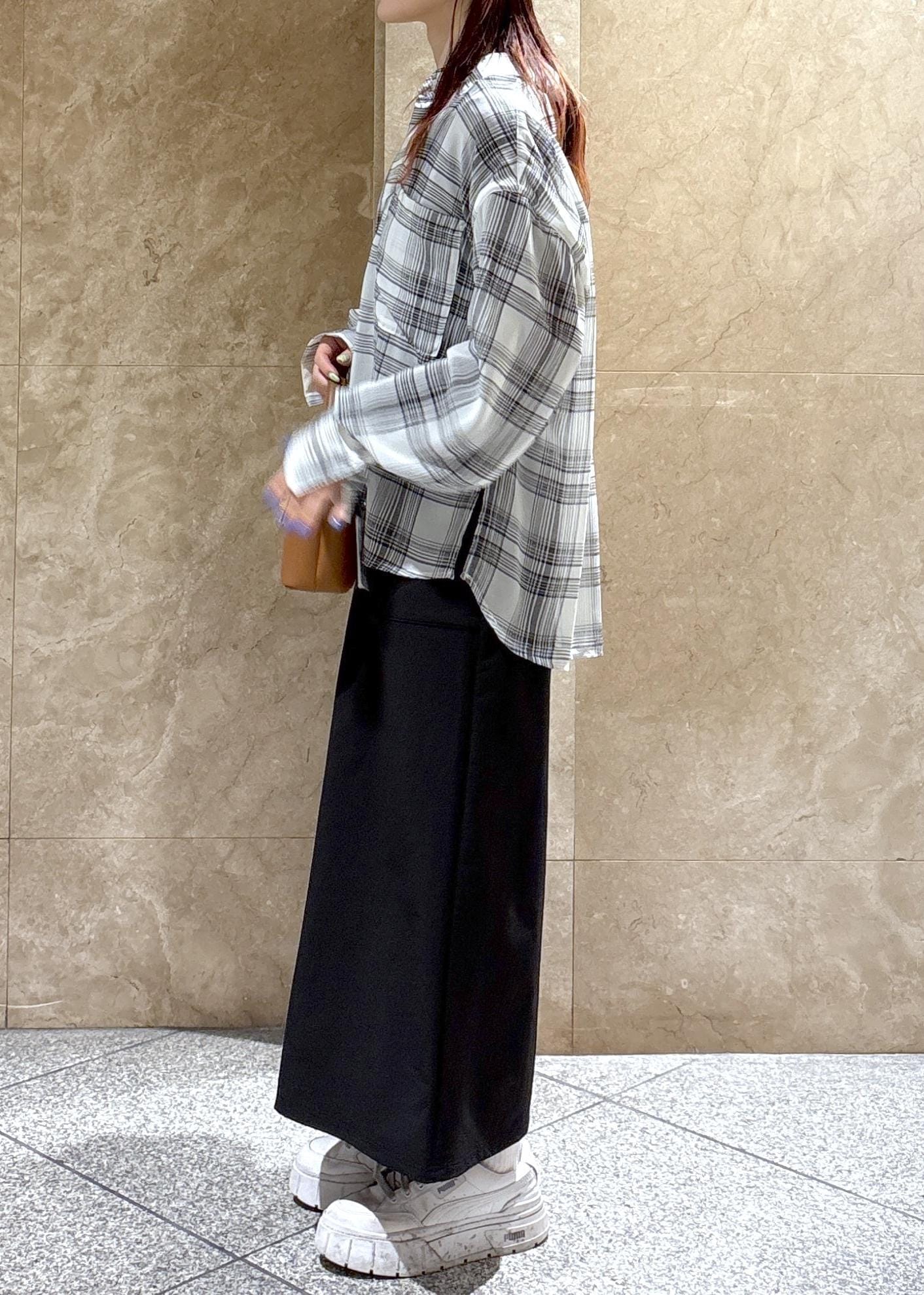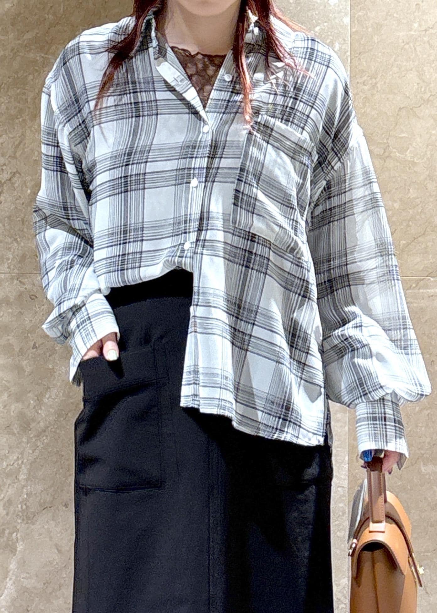 チェックのシアーシャツにレーストップスをレイヤードして、Iラインスカートと合わせました。