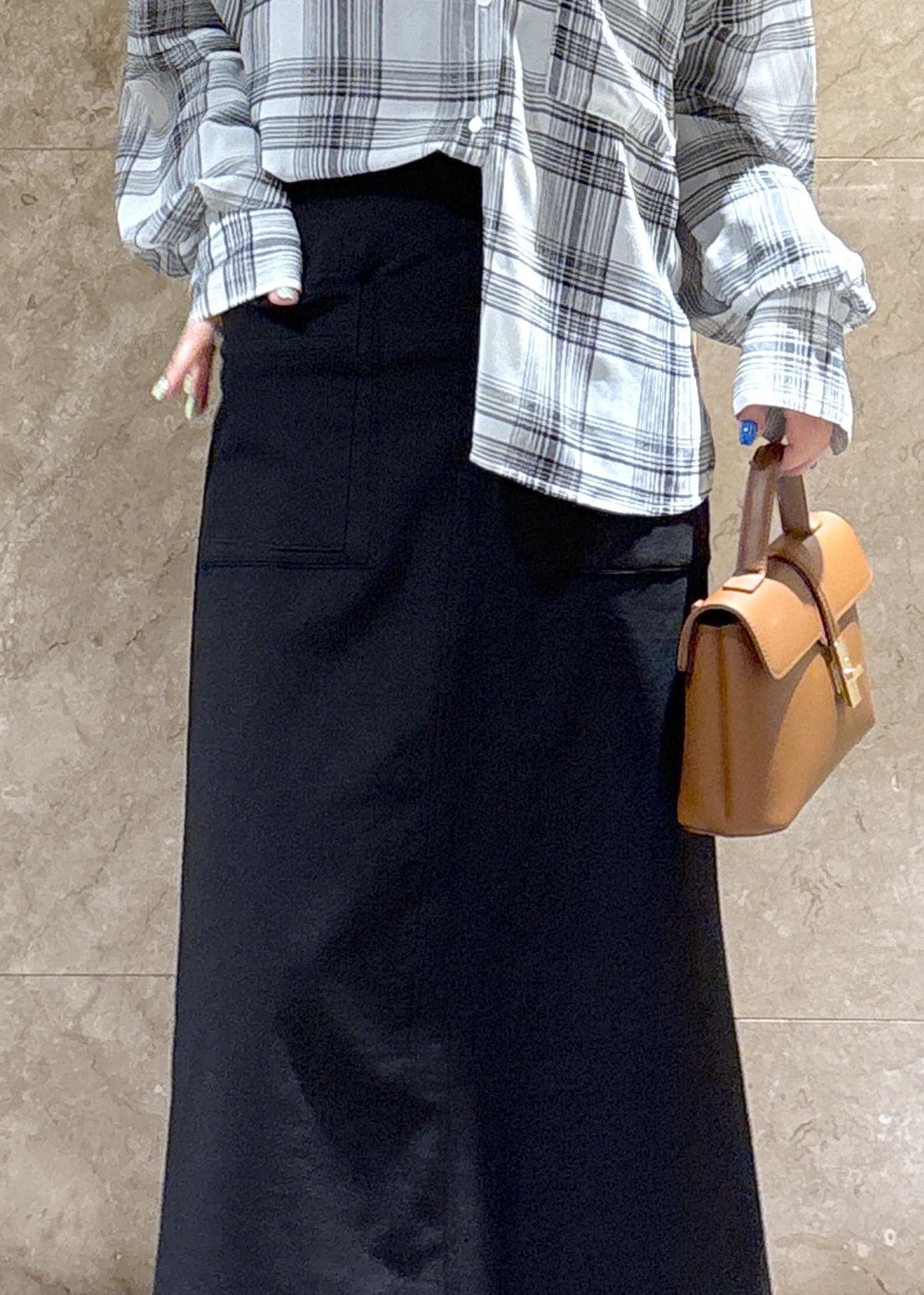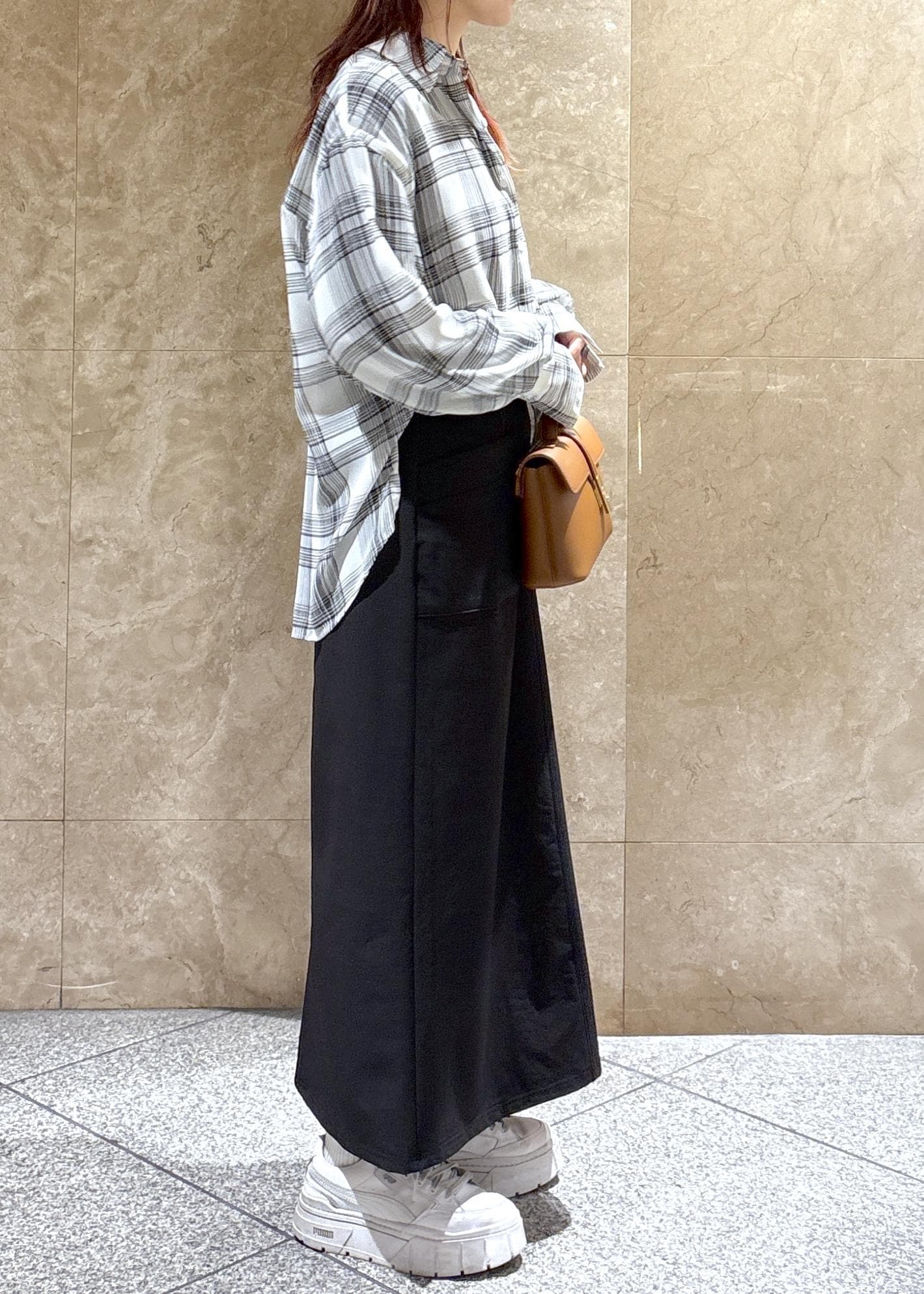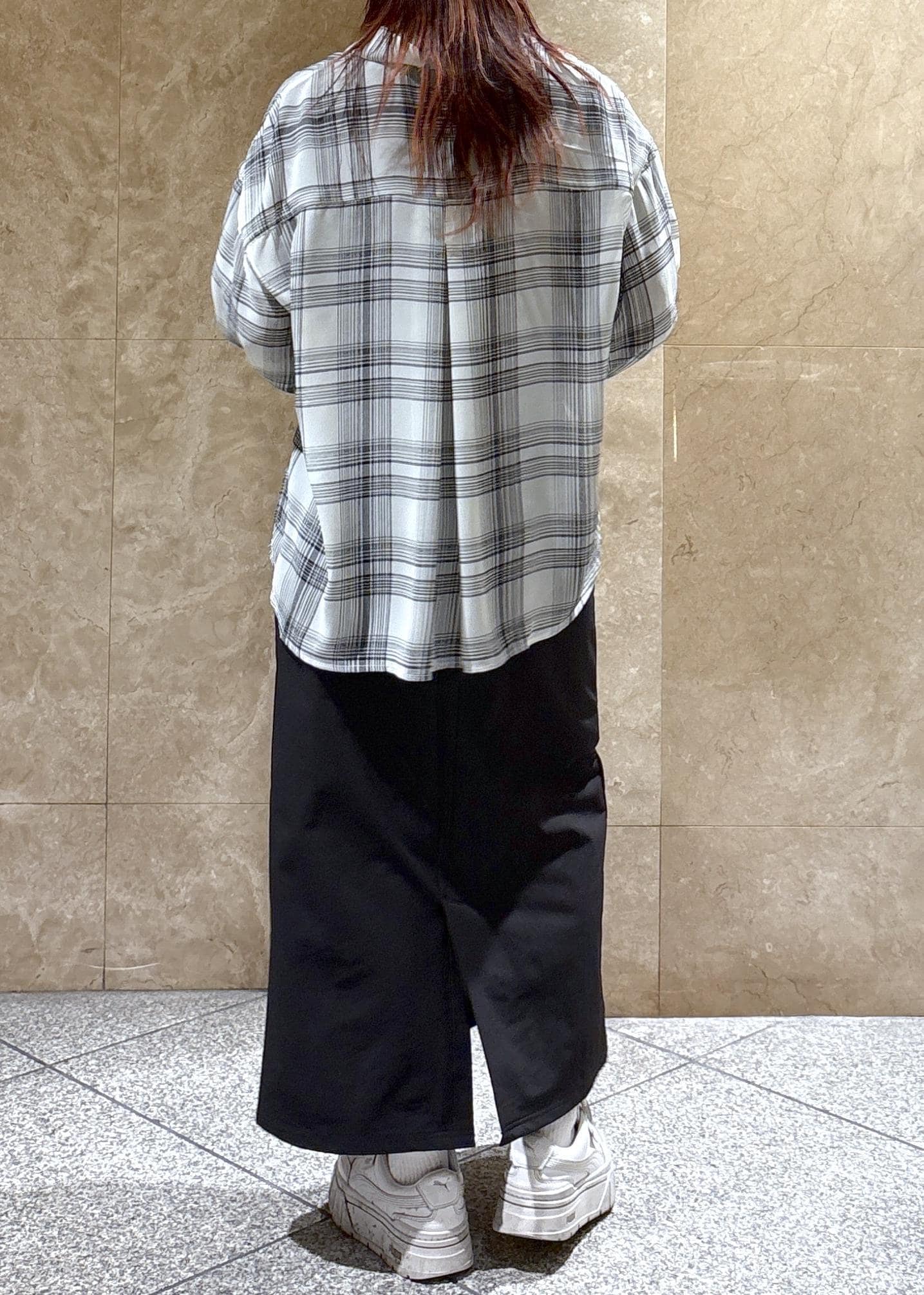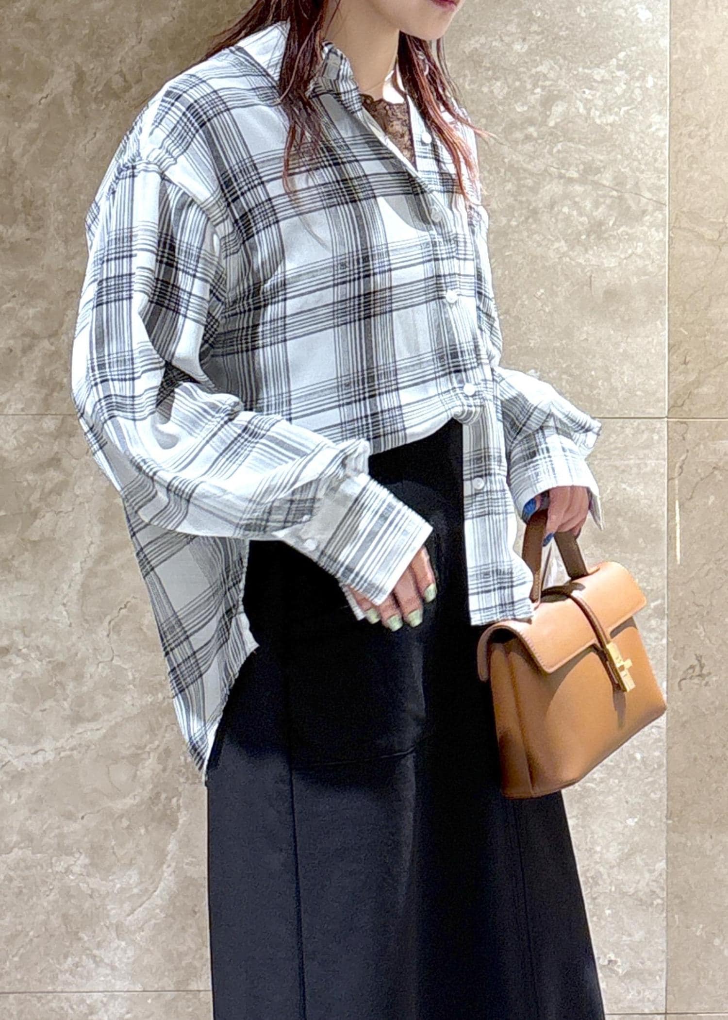 チェックのシアーシャツにレーストップスをレイヤードして、Iラインスカートと合わせました。