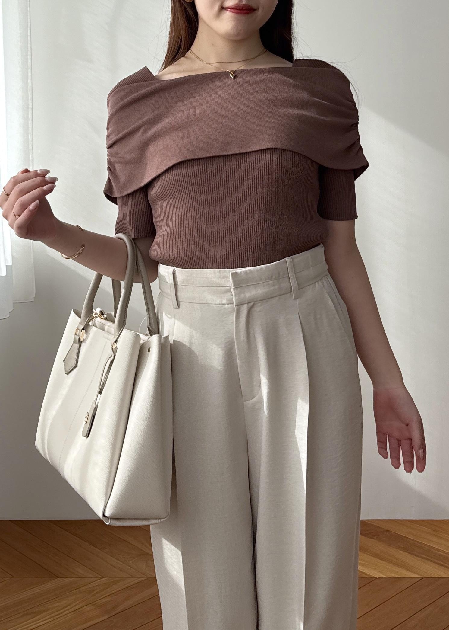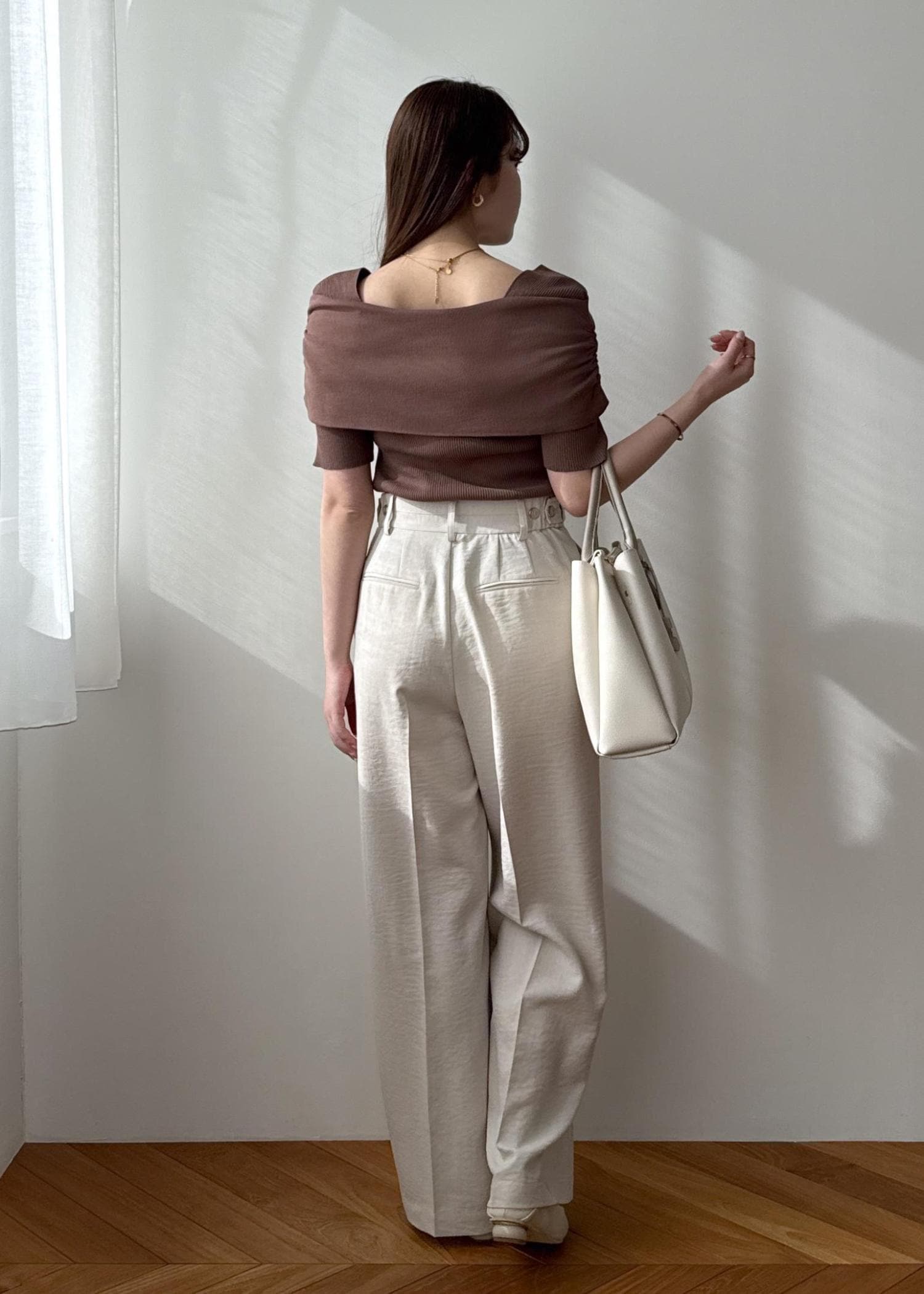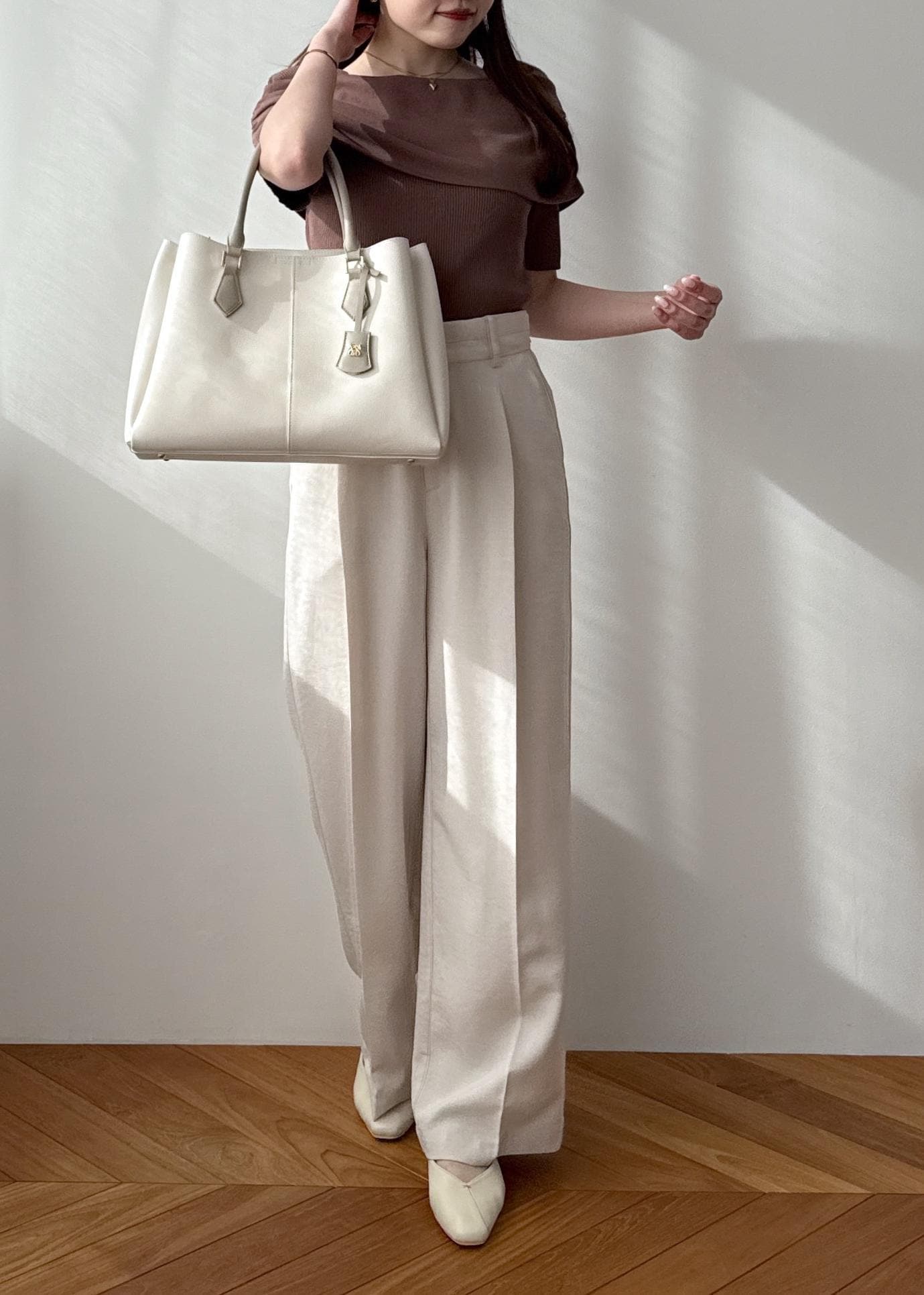 大人気のマチ付きオフショルニットに美easyリネンライクワイドパンツを合わせてすっきりお仕事スタイルに!◎