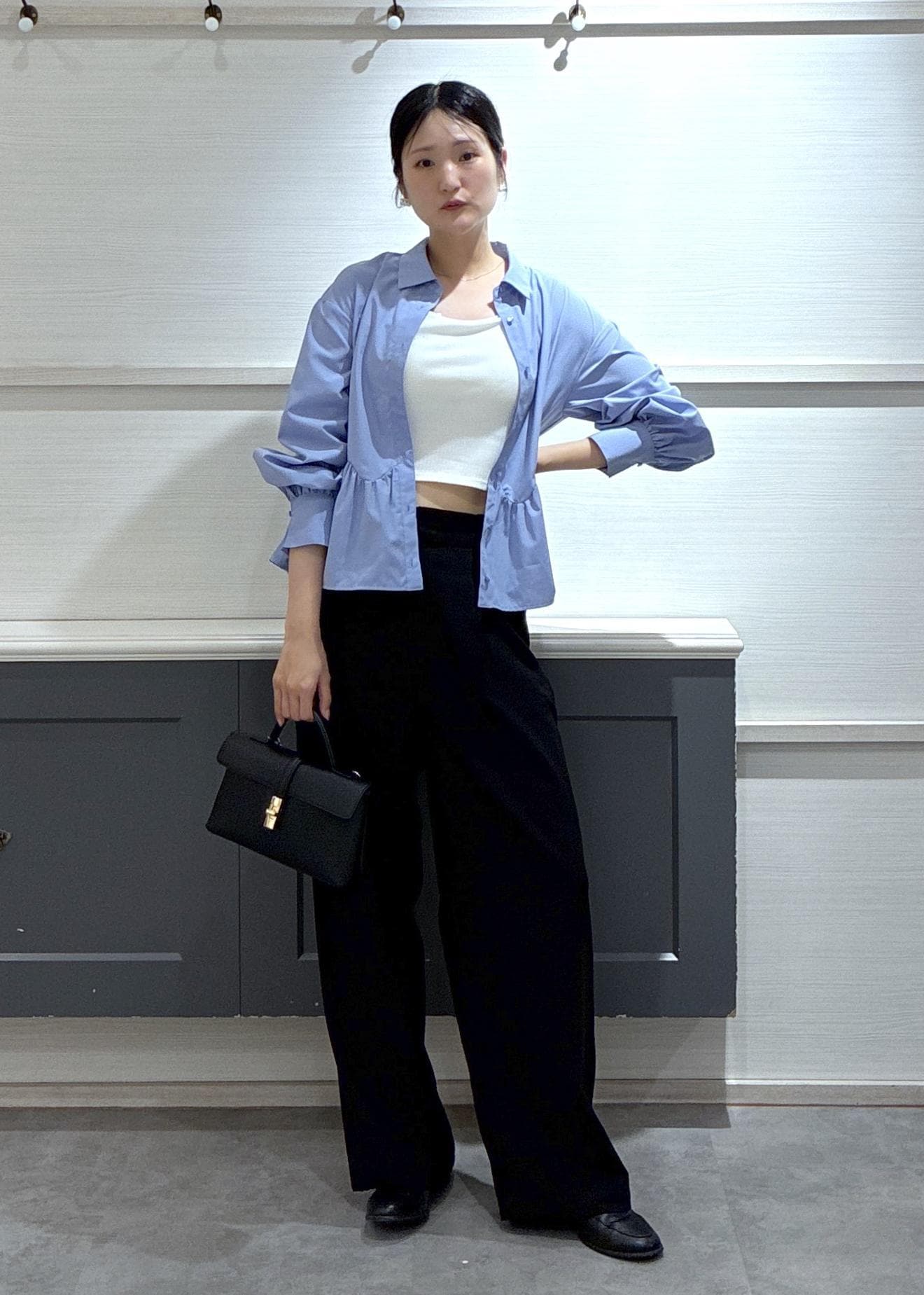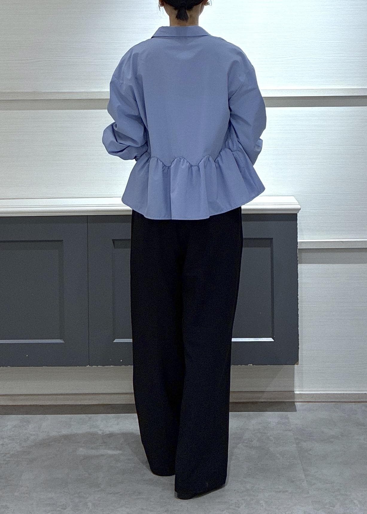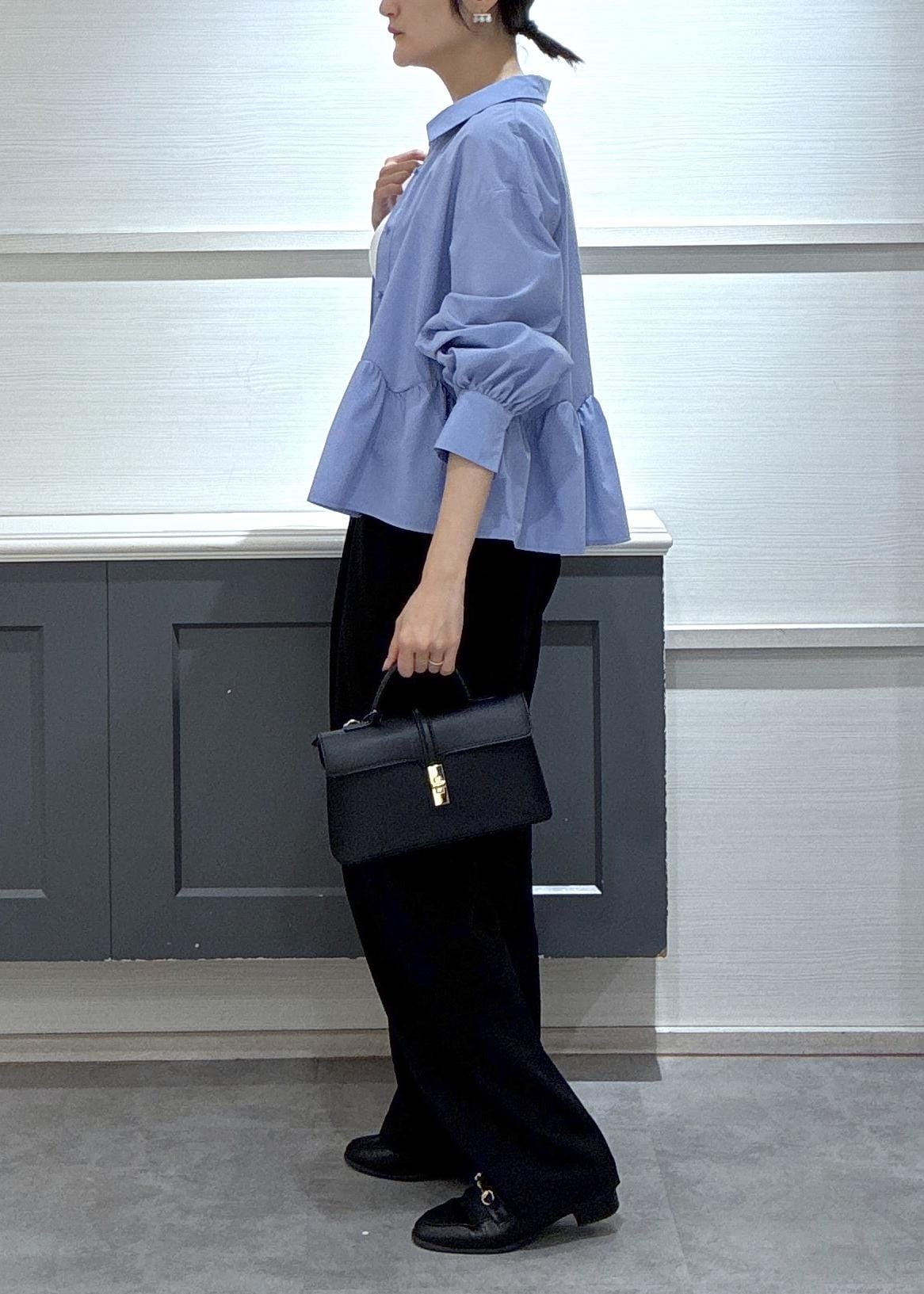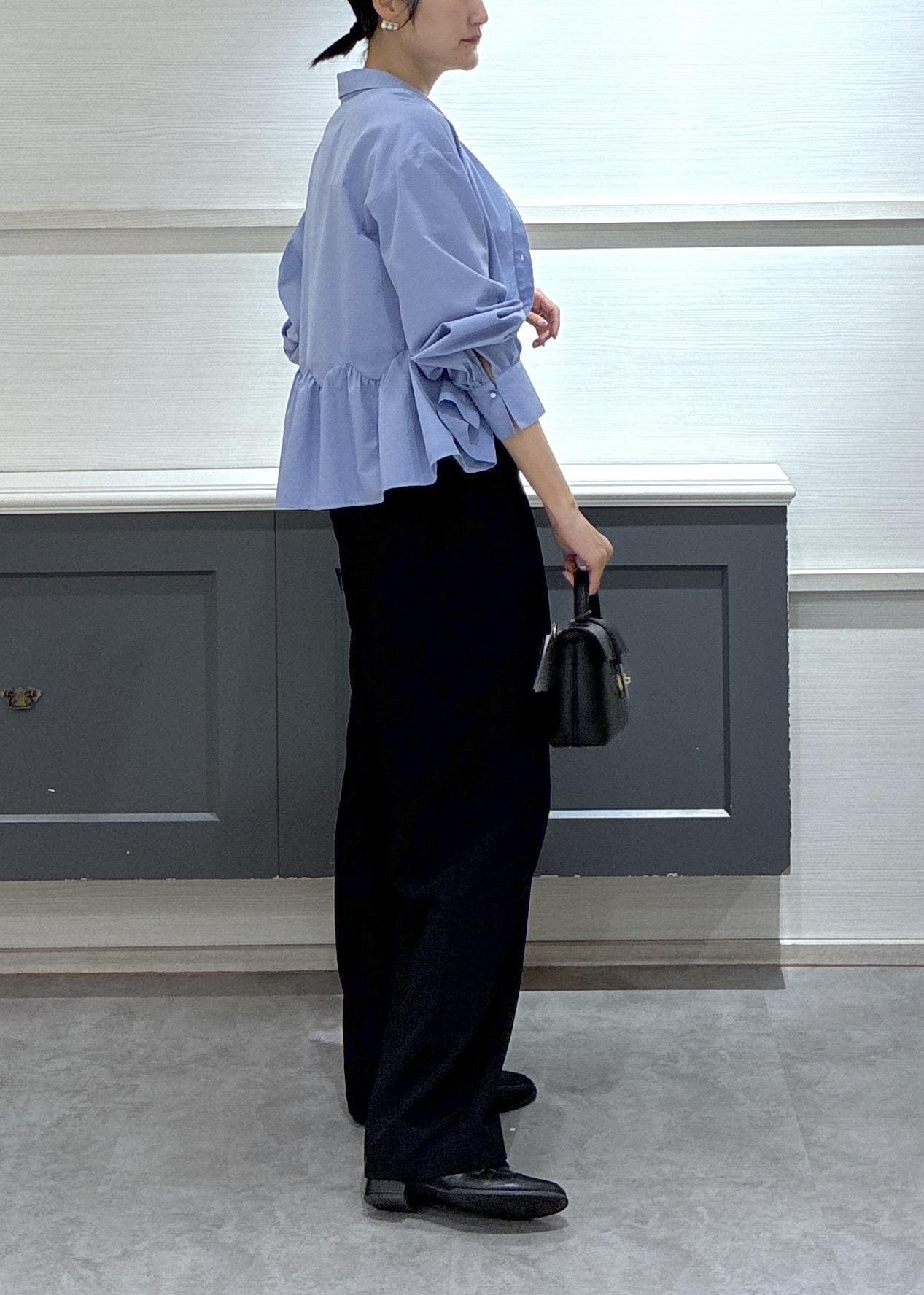 ブルーの裾フリルブラウスをヘルシーに着こなしワイドパンツと合わせました!