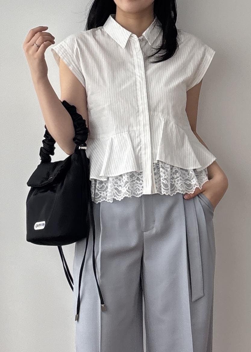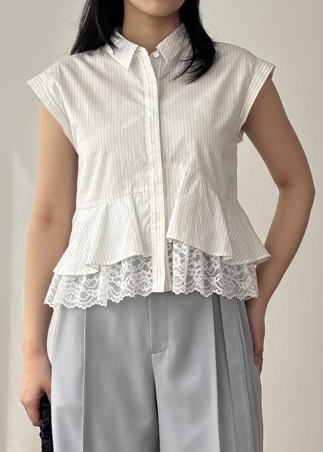 NEW! 予約VIS裾レース切替 襟付きフレンチスリーブブラウス/接触冷感・イージーケアホワイト系 / F¥5,929レビュー裾からレースが見えて華やかに◎