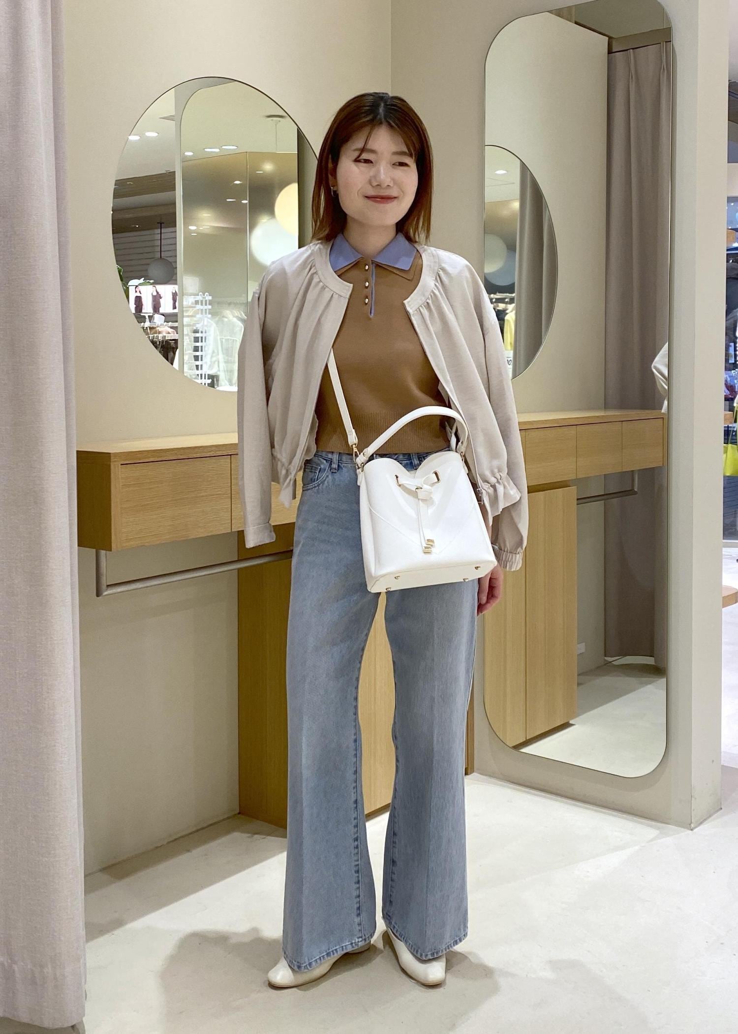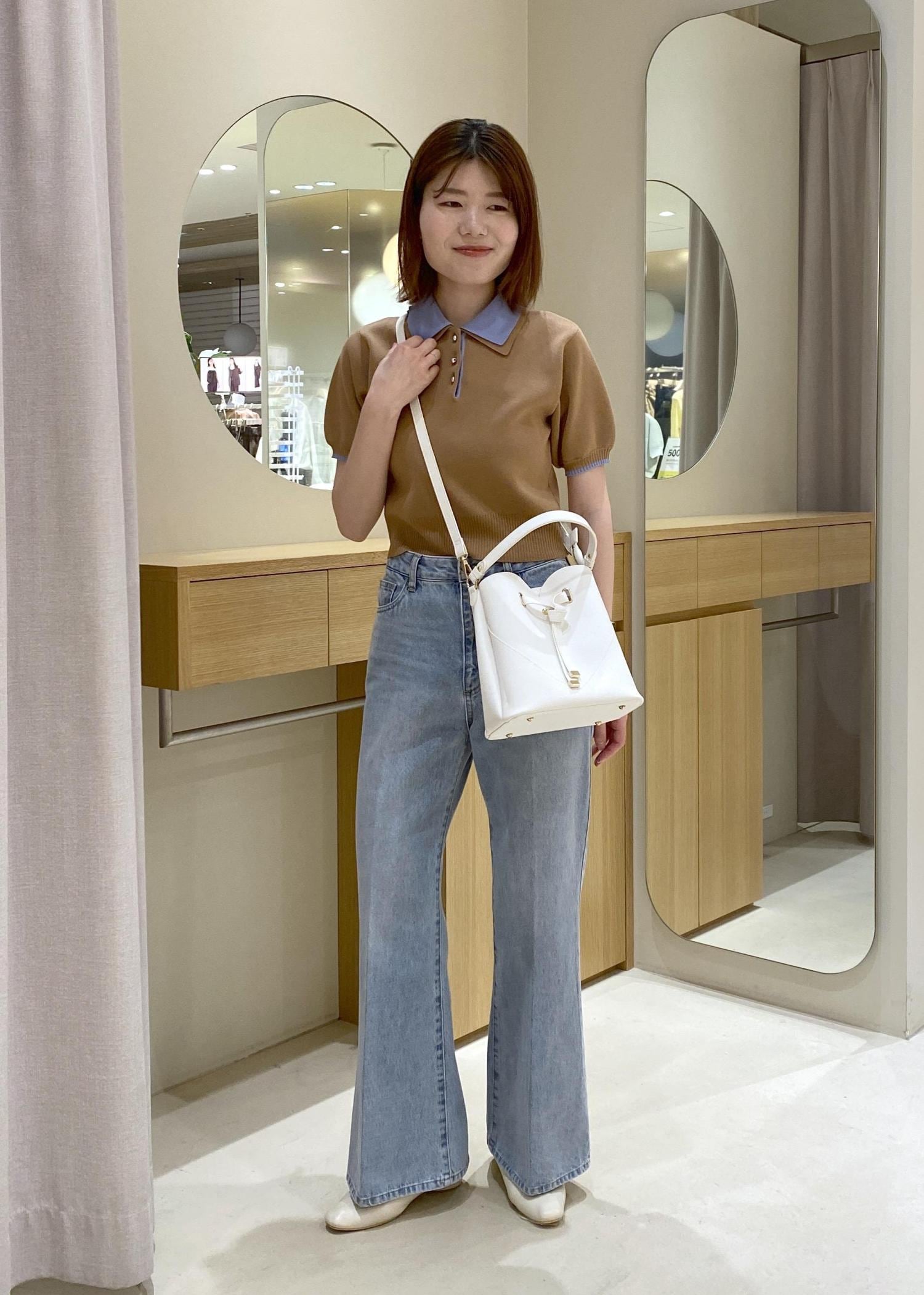 襟元がワンポイントのダブルカラーポロニットにフレアデニムを合わせたカジュアルめなコーデです!