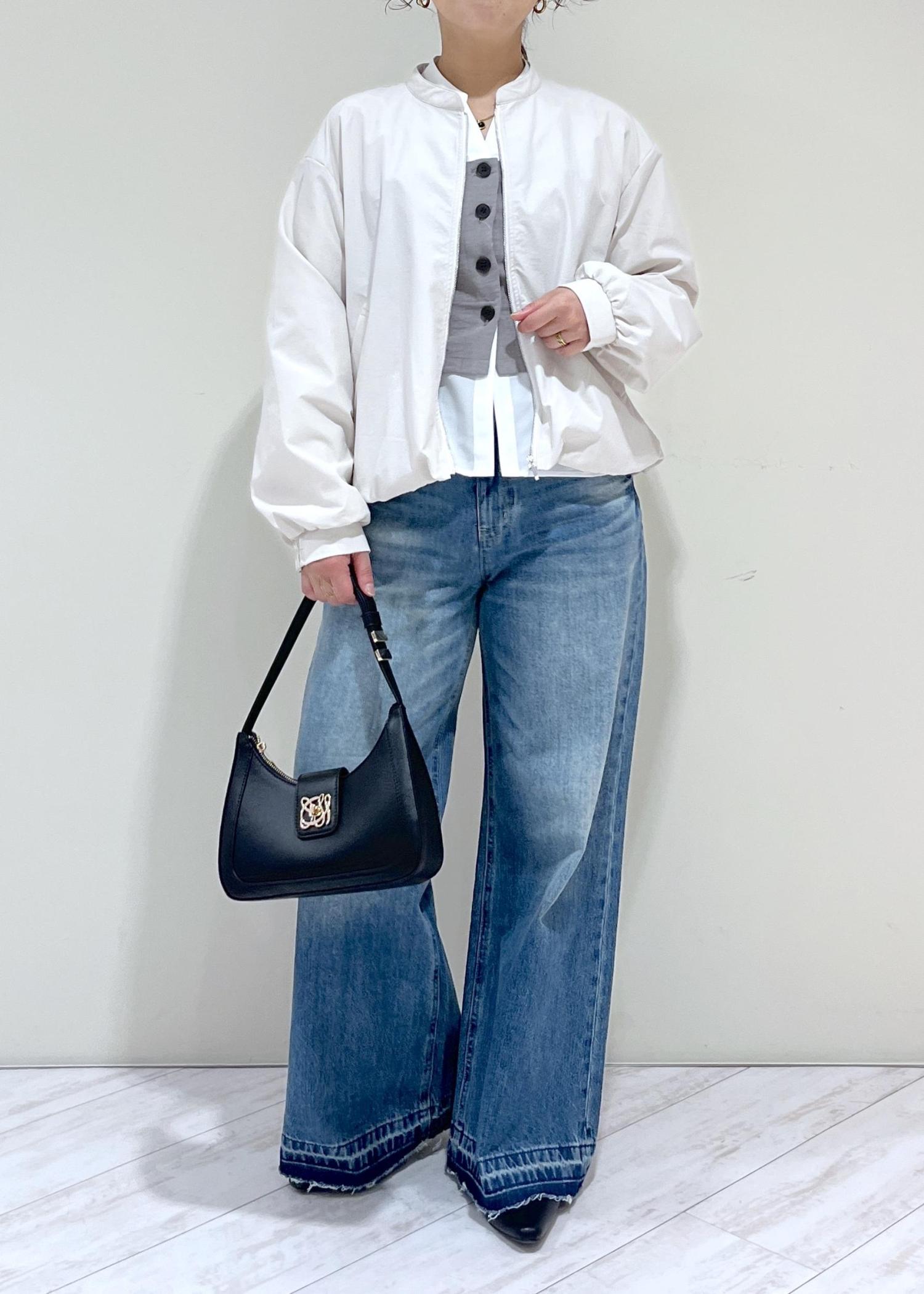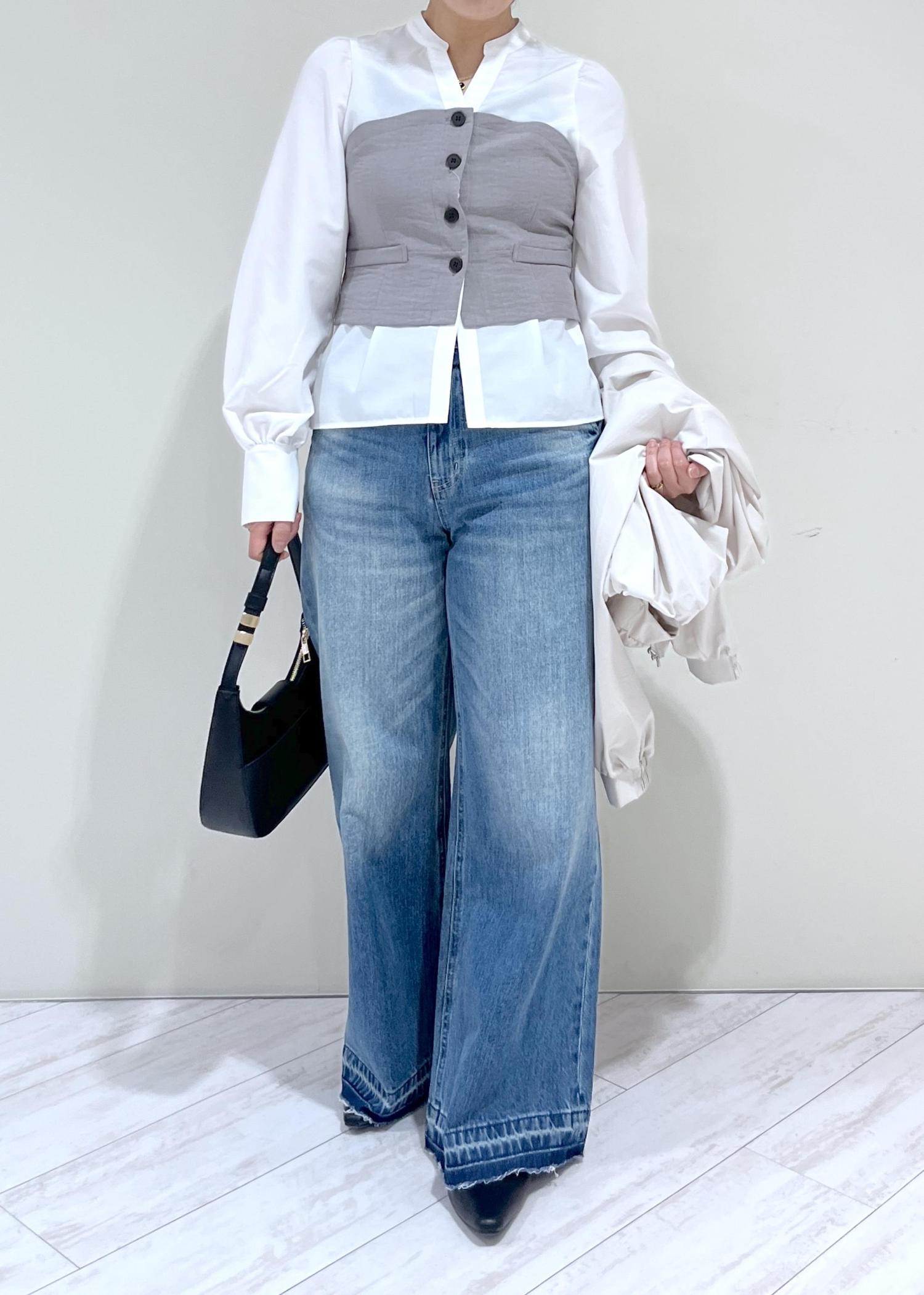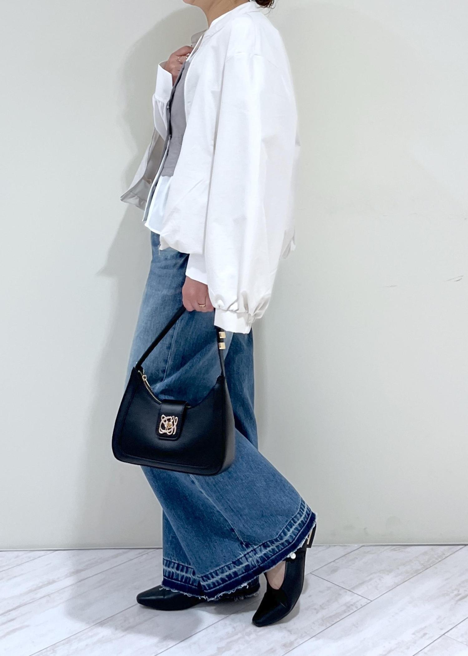 バギーデニムなので裾にかけてきれいな広がり感があり、着丈はパタンコの靴でギリギリ床に付かない程度。少しソール厚めの靴で合わせると脚長効果も更にアップします。 -
