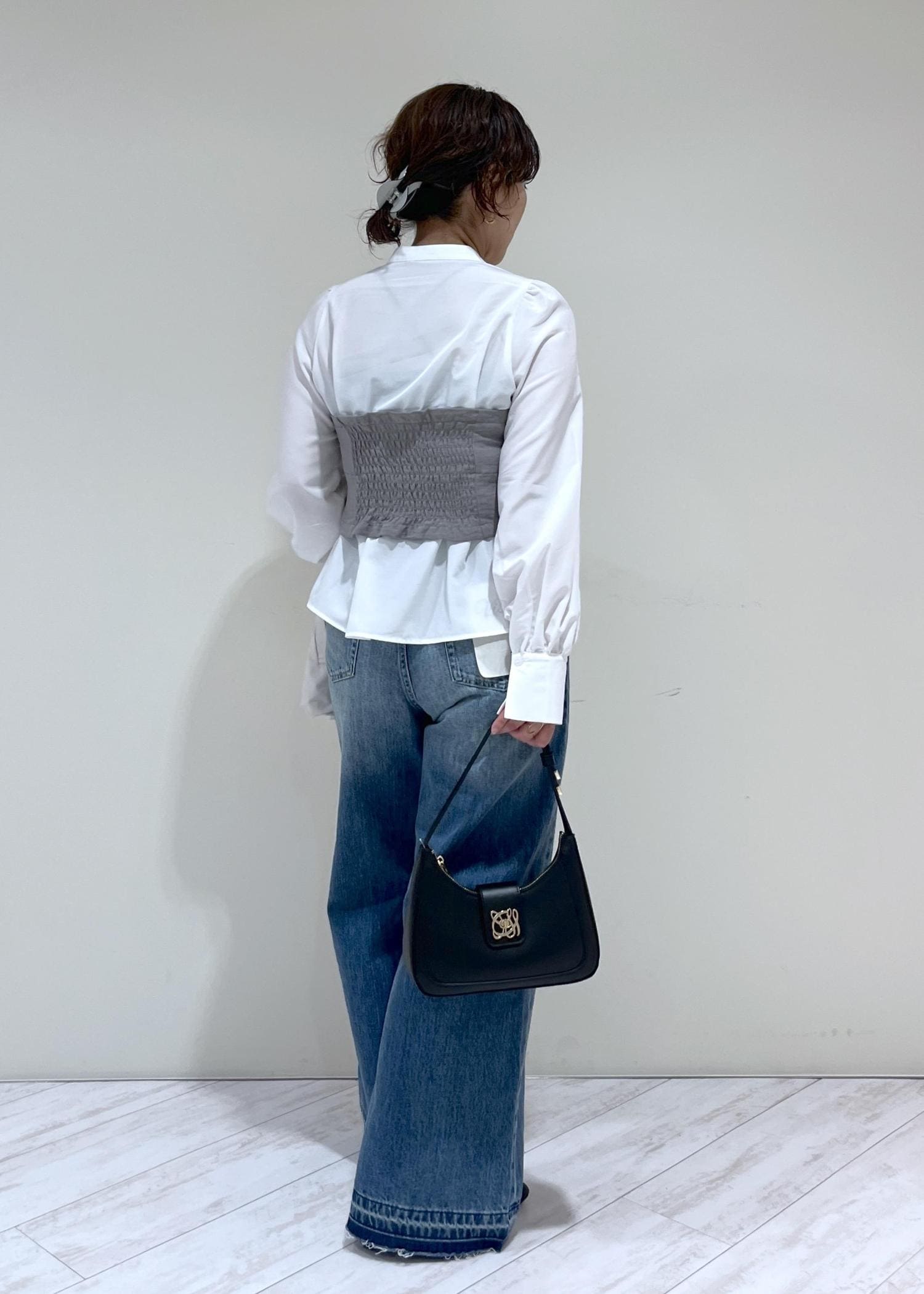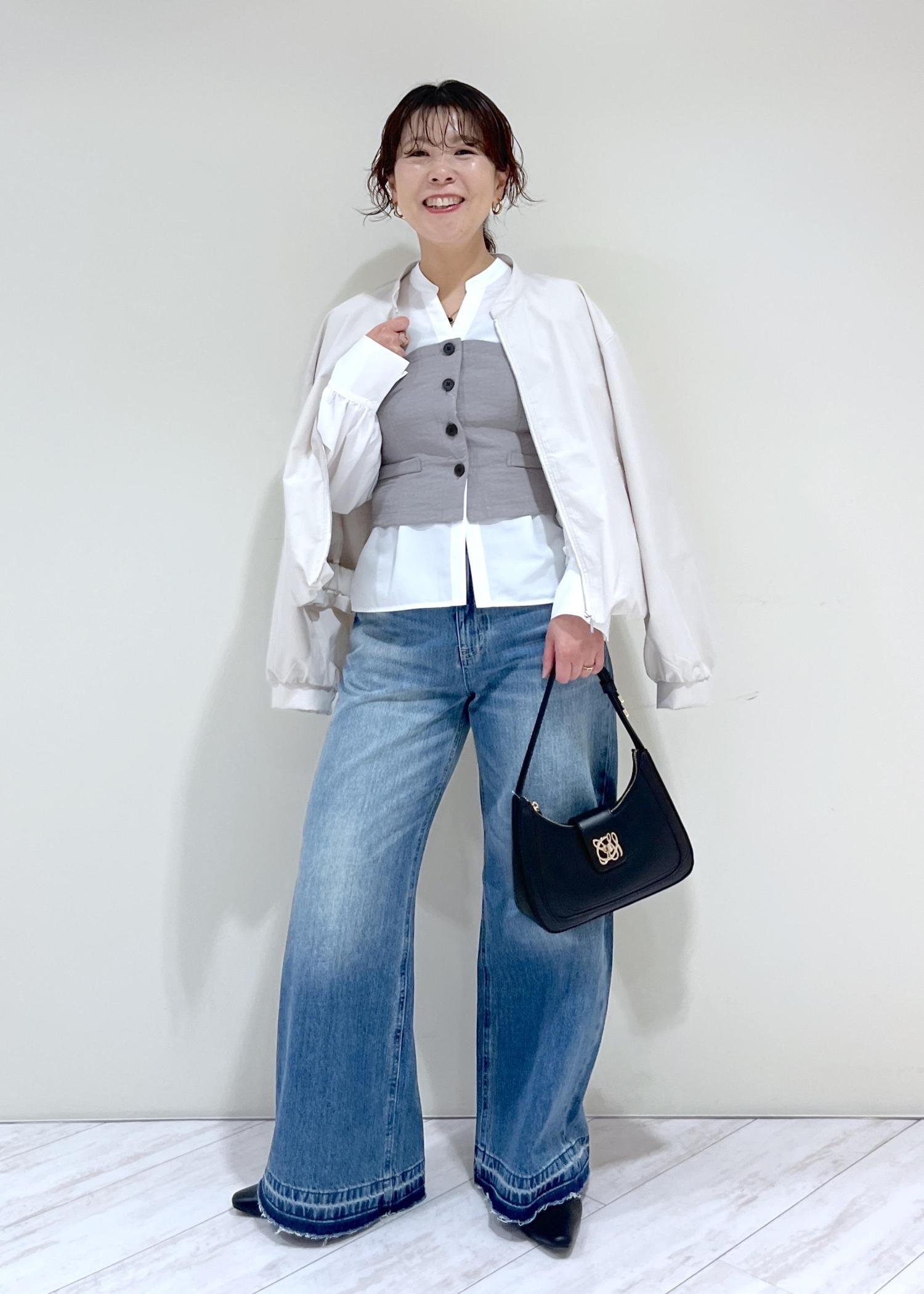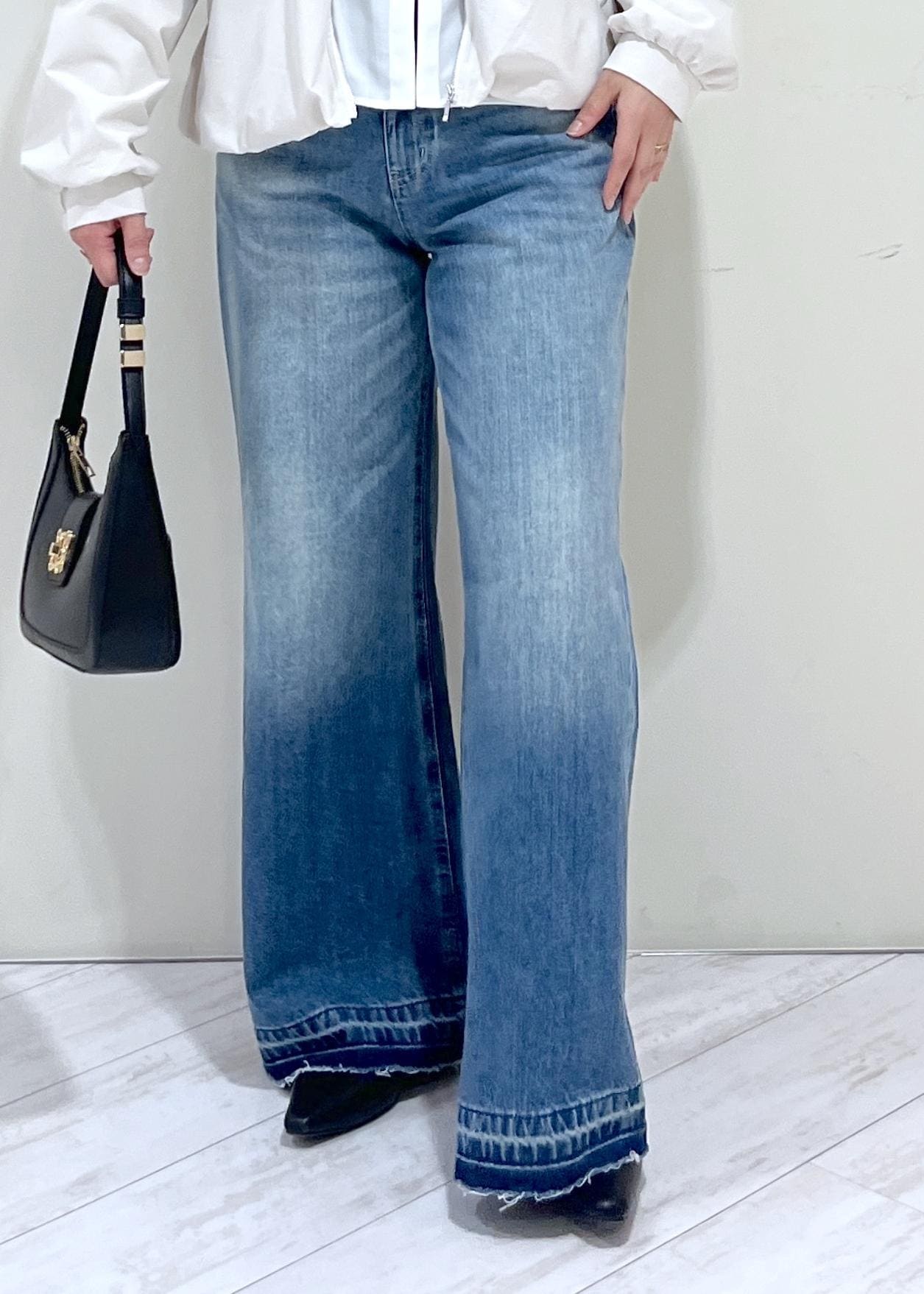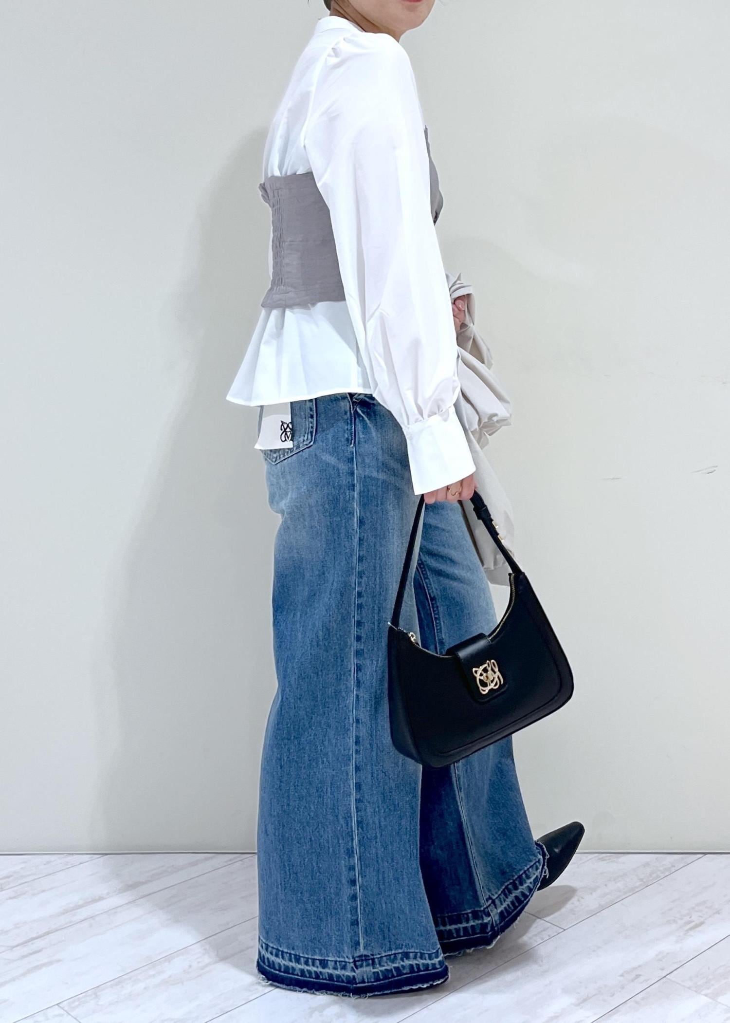 バギーデニムなので裾にかけてきれいな広がり感があり、着丈はパタンコの靴でギリギリ床に付かない程度。少しソール厚めの靴で合わせると脚長効果も更にアップします。 -
