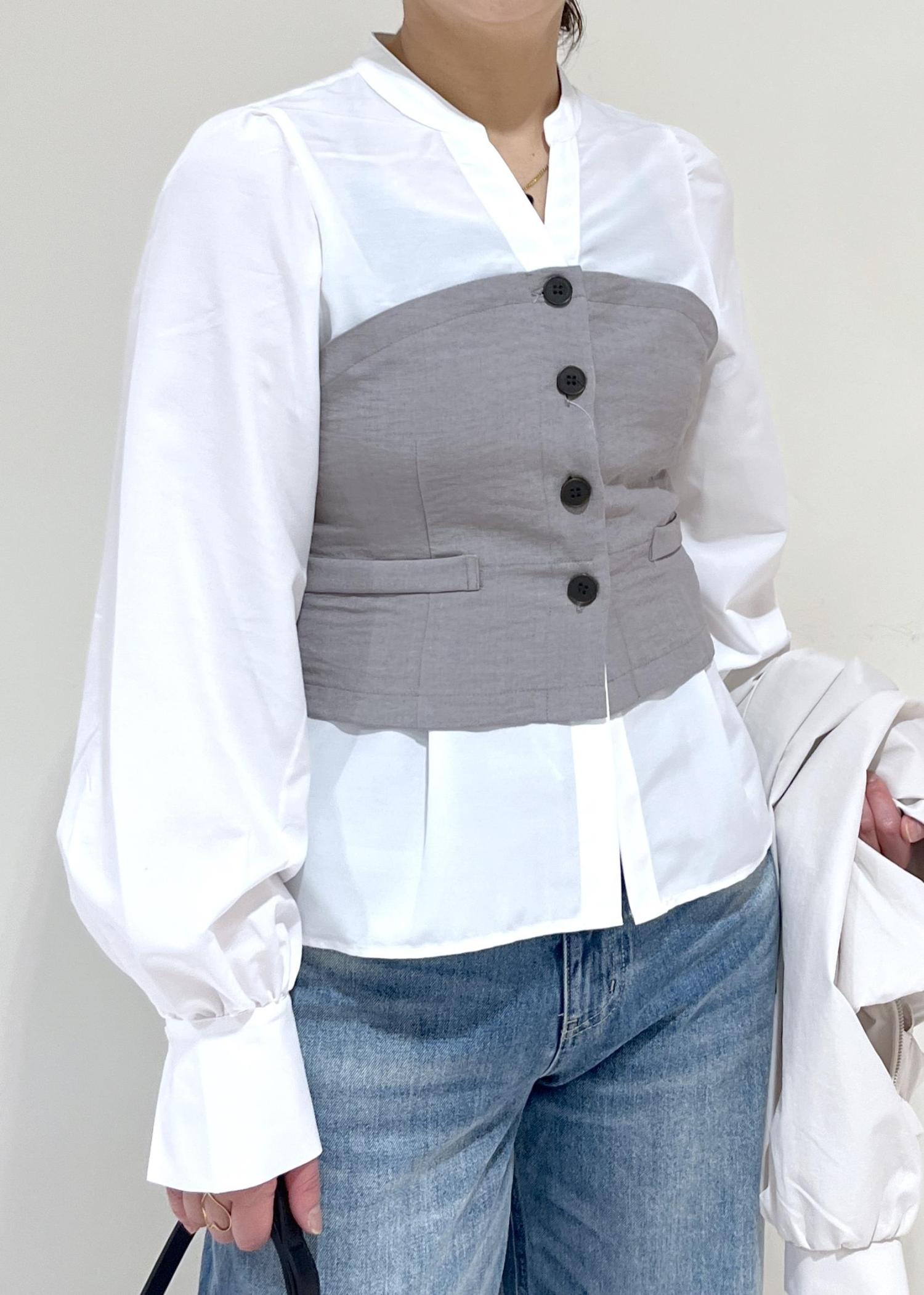 VIS美easy前開きビスチェドッキングシャツ/イージーケア・接触冷感・セットアップ対応グレー / F¥5,929レビューボタンデザインのビスチェドッキングブラウスです。