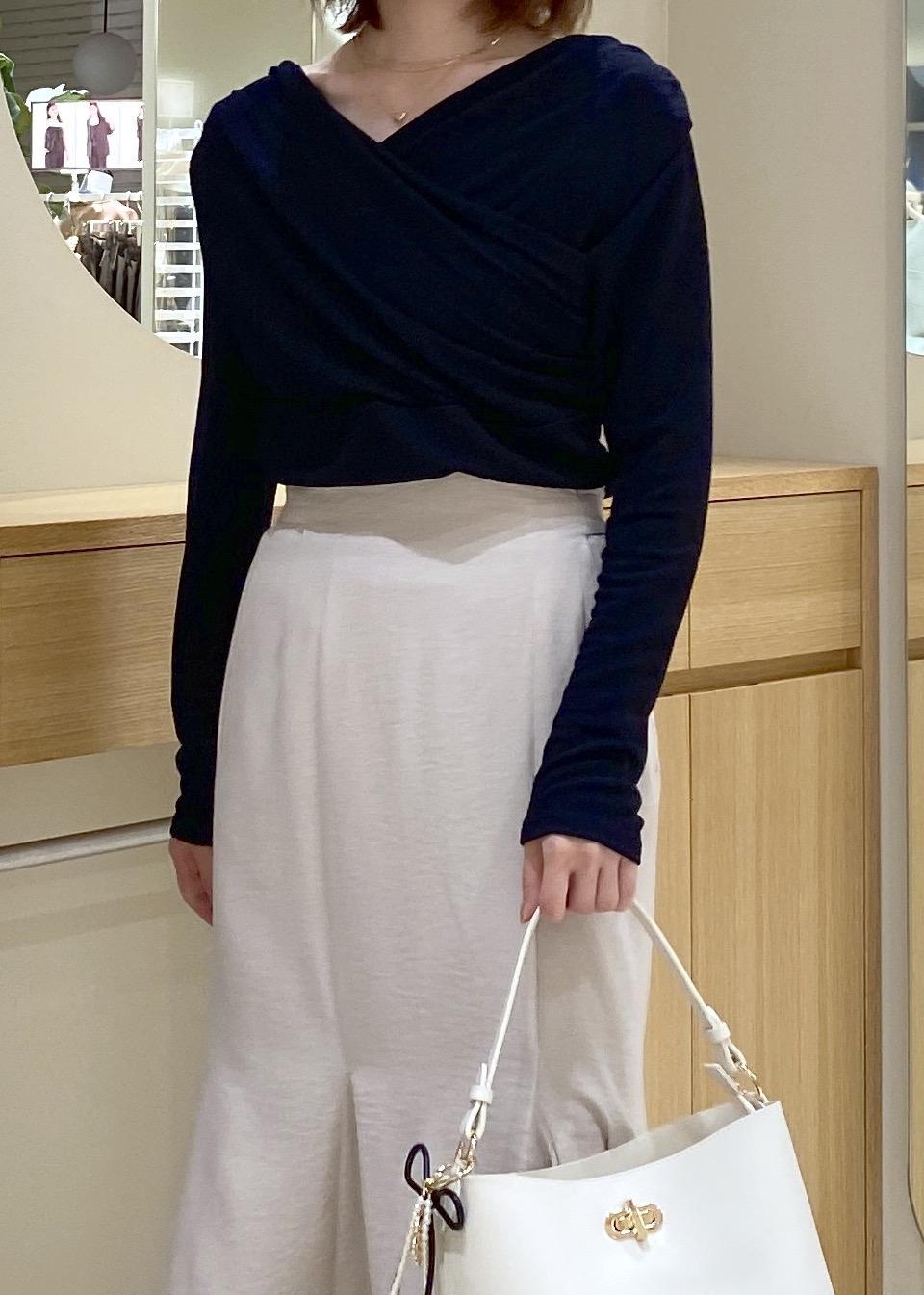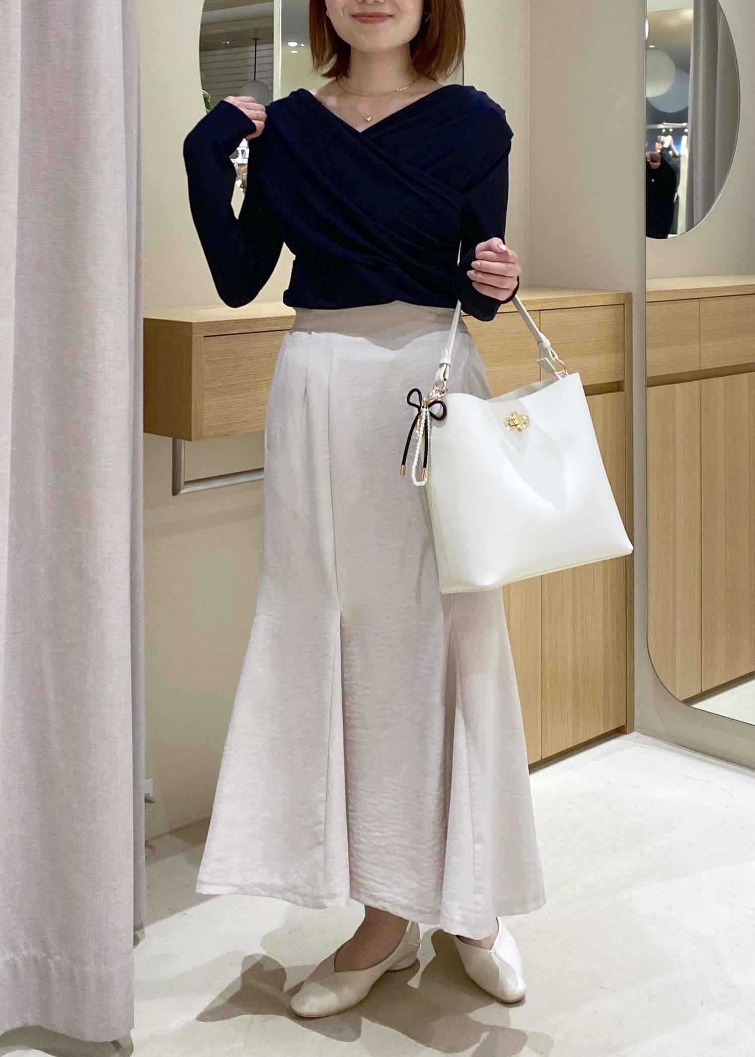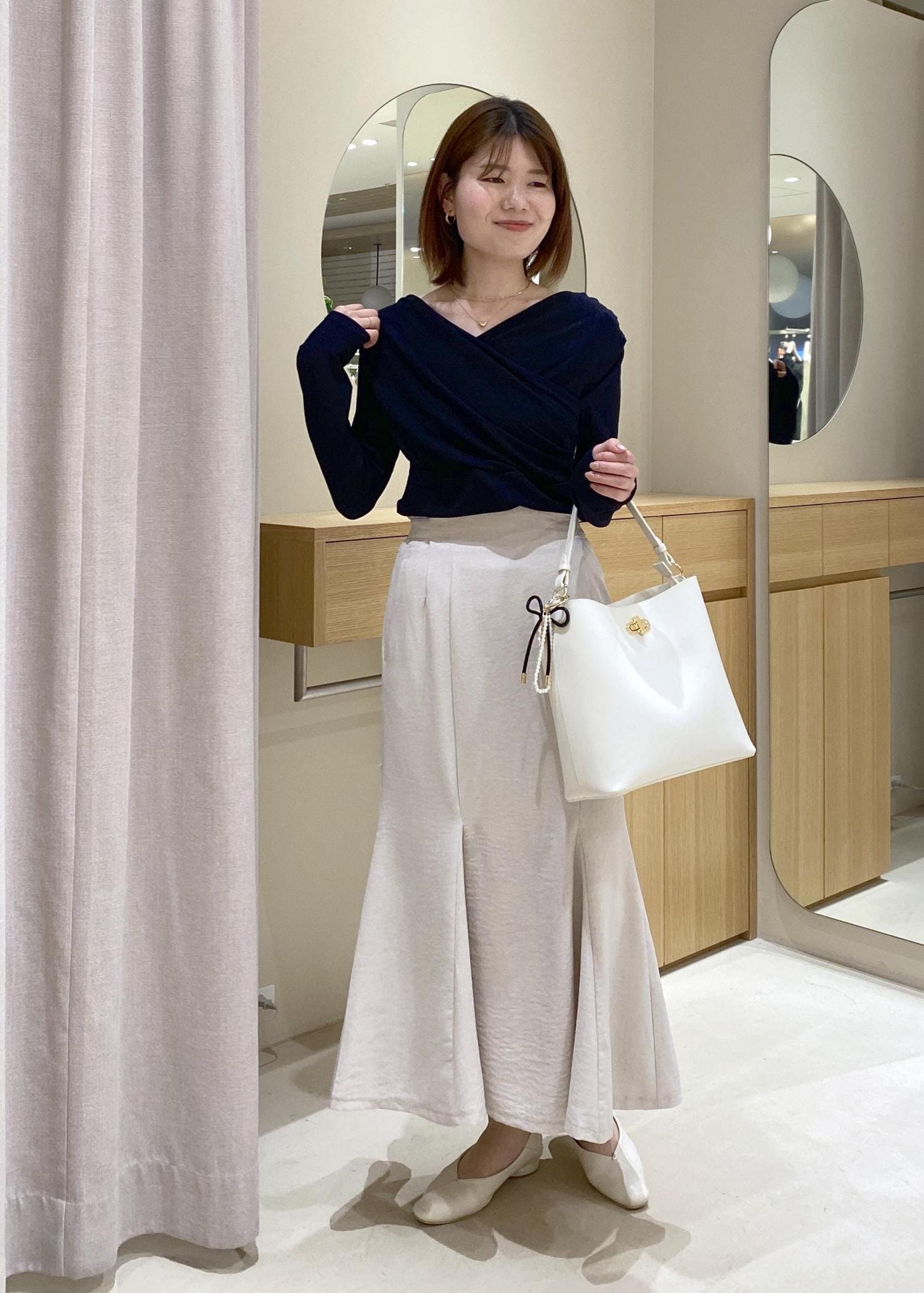 ドレープトップスにさらっとした生地感のマーメイドスカートを合わせた、上品なスカートスタイルを作ってみました!
