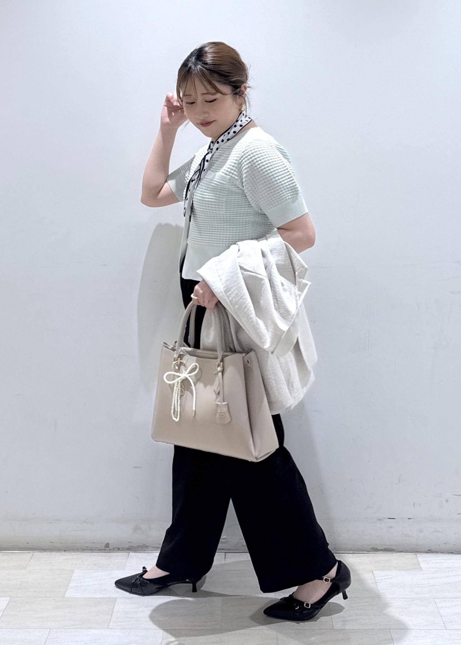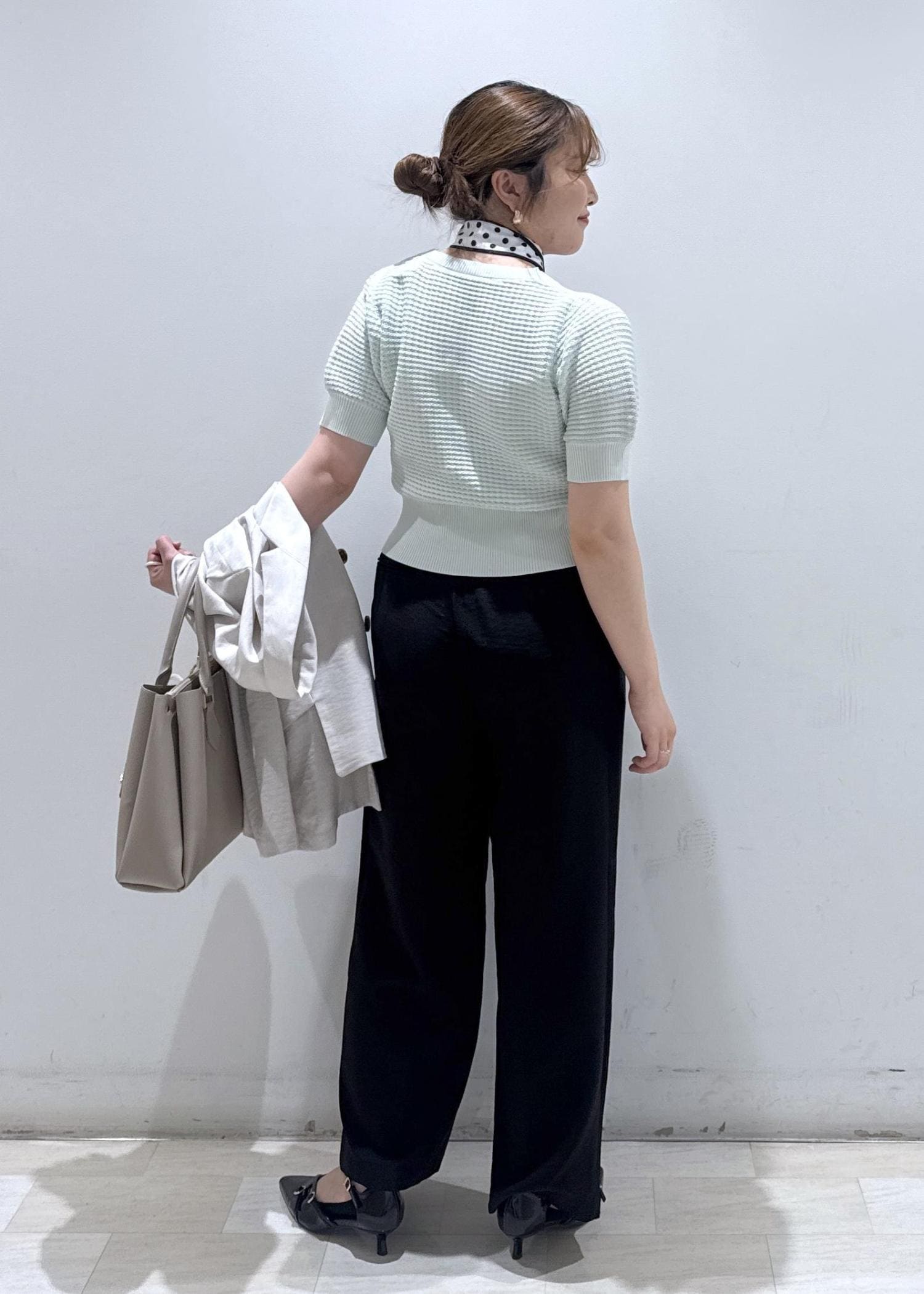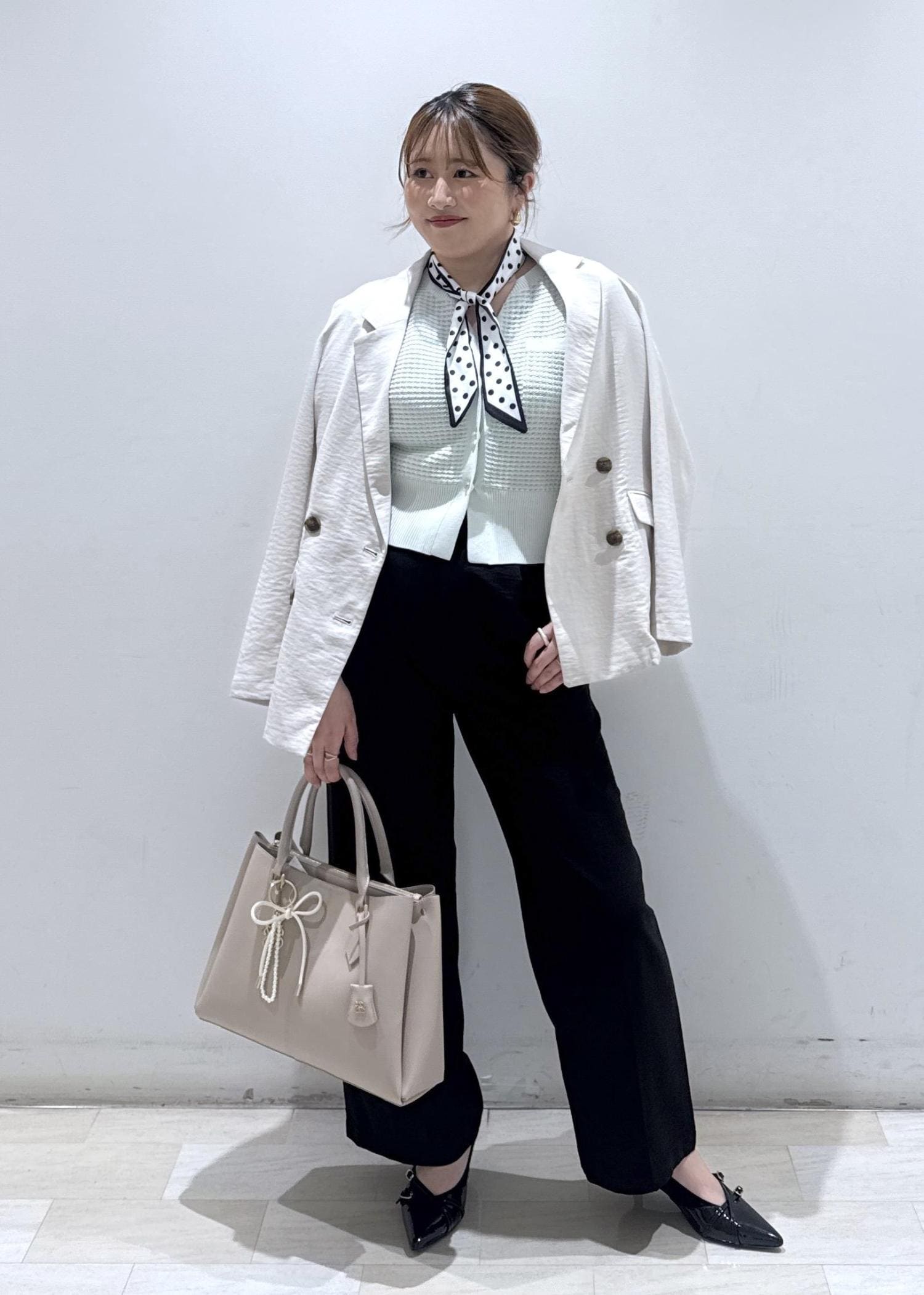 淡いグリーンのカラーが春夏らしさを出していて、ドットのボウタイも小物を使えば一気にオシャレ感がプラスされます。