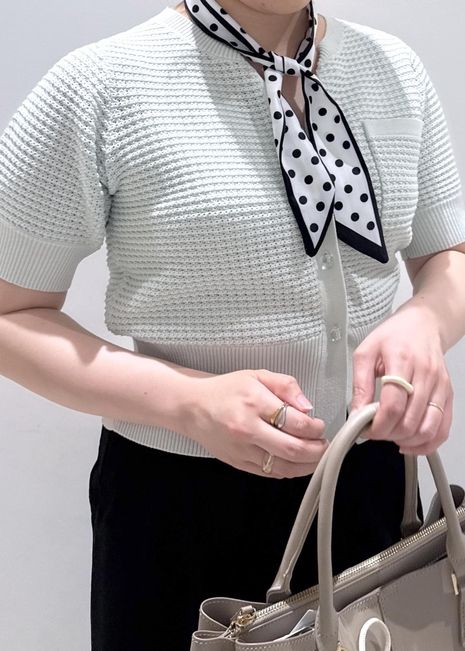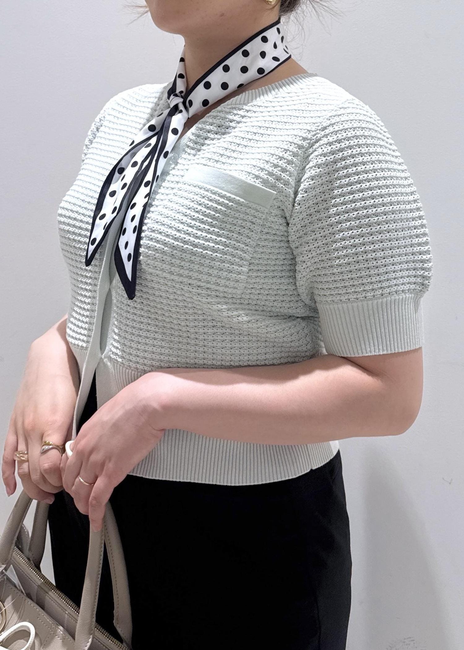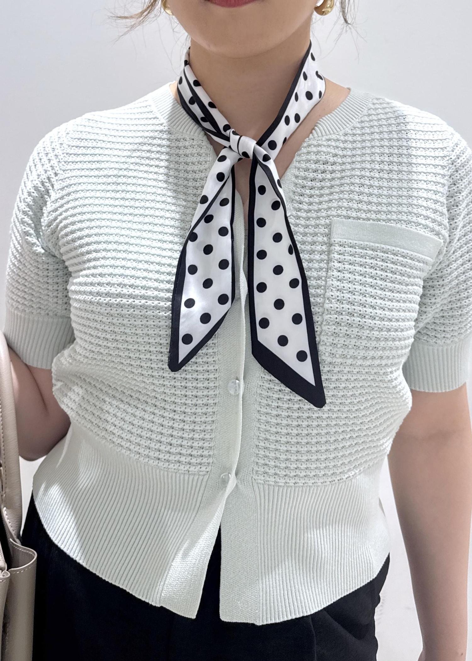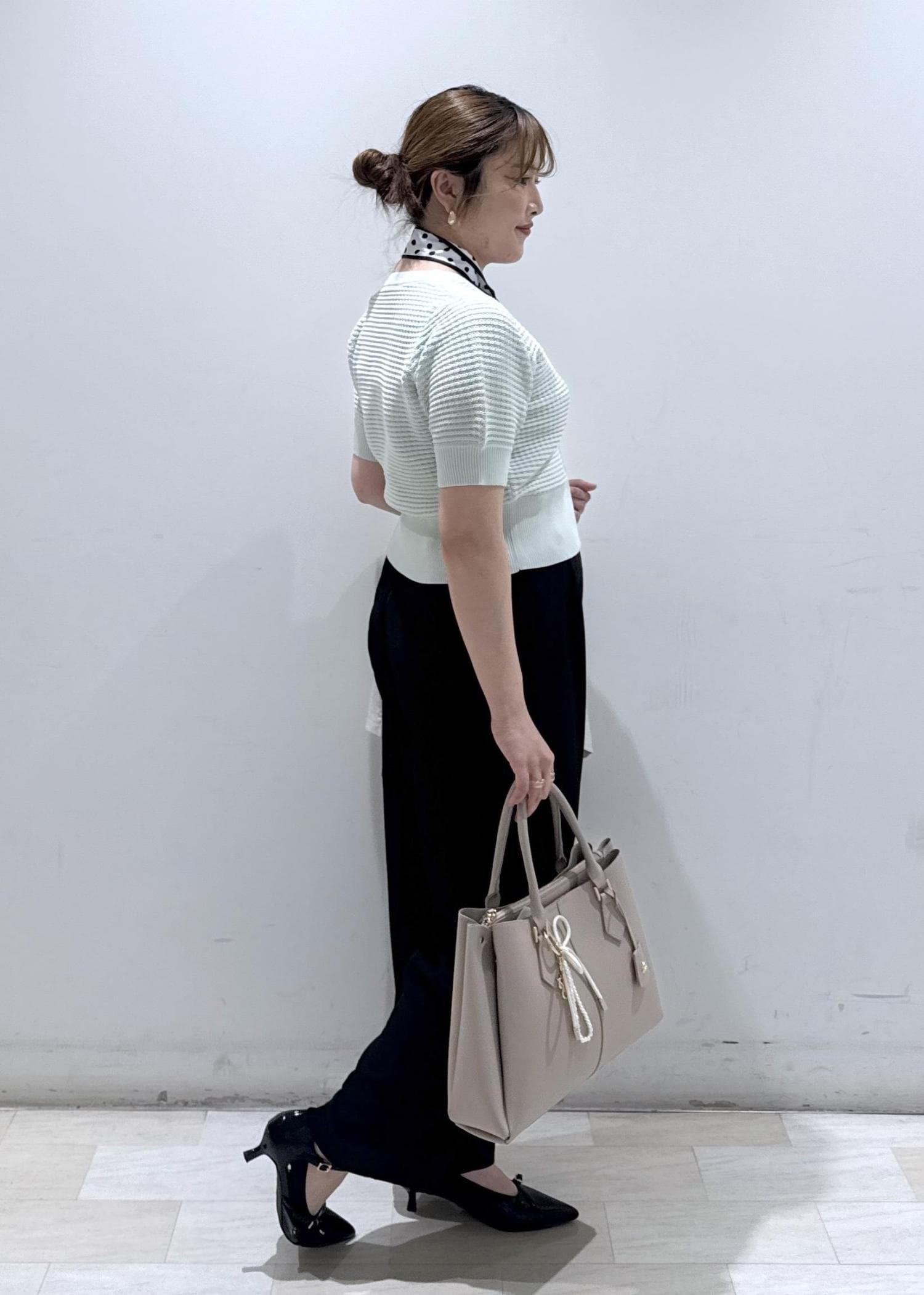 淡いグリーンのカラーが春夏らしさを出していて、ドットのボウタイも小物を使えば一気にオシャレ感がプラスされます。